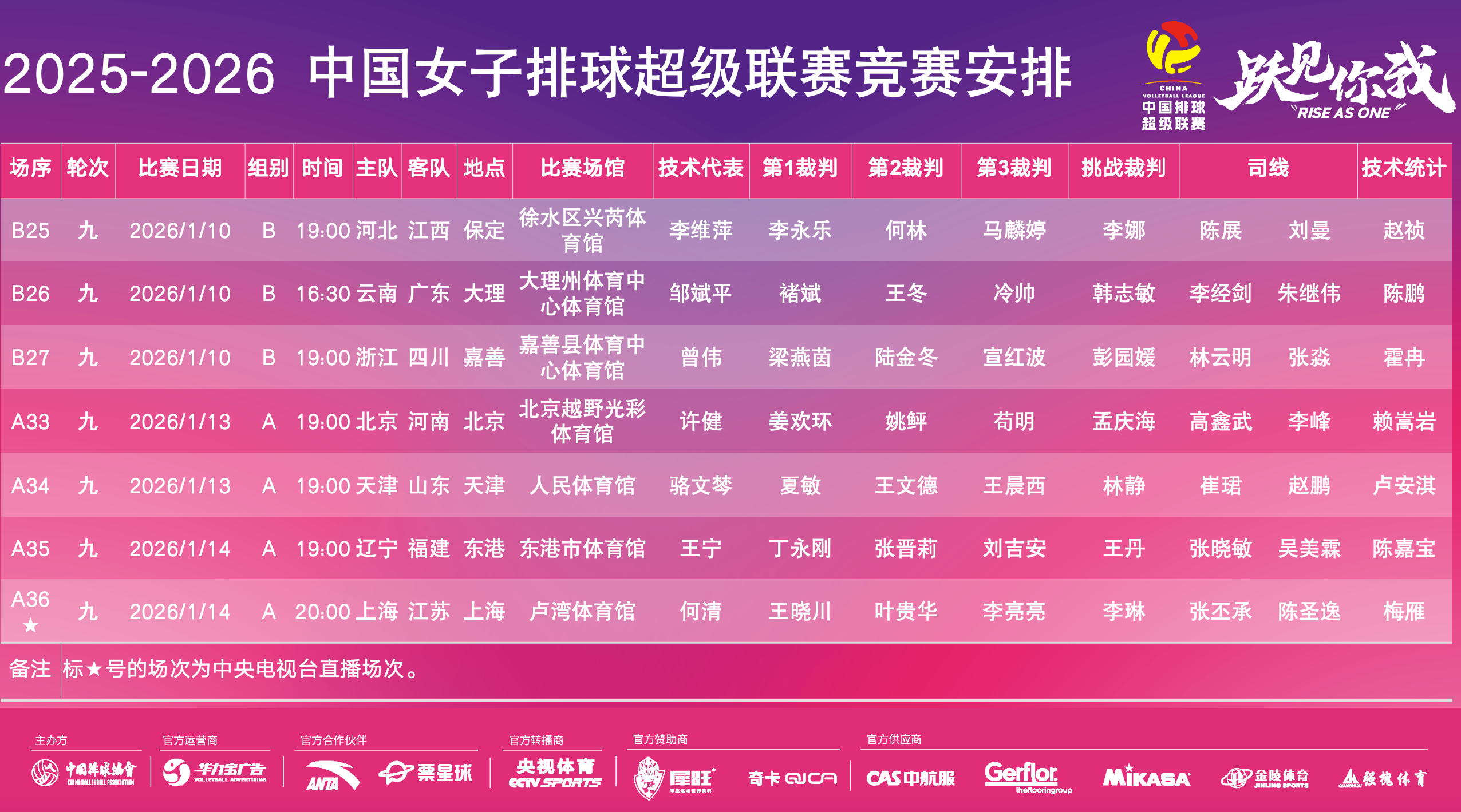 2025-2026中国女子排球超级联赛第9轮竞赛安排