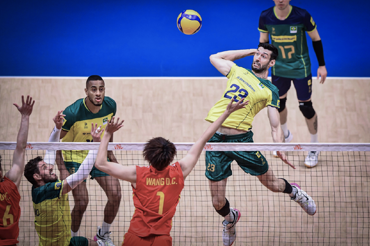 第一局,中国队开局0比3落后,随后凭借张景胤的强攻和拦网追至3比4。巴西队力拼发球,中国队一传出现波动,进攻受阻以3比8落后。巴西队加强拦防,中国队难以适应对手的攻防节奏,虽然王东宸、张景胤和江川偶有斩获,但难以追近比分。局末阶段,中国队奋力追至19比22,但仍难以扭转被动局势以19比25告负。