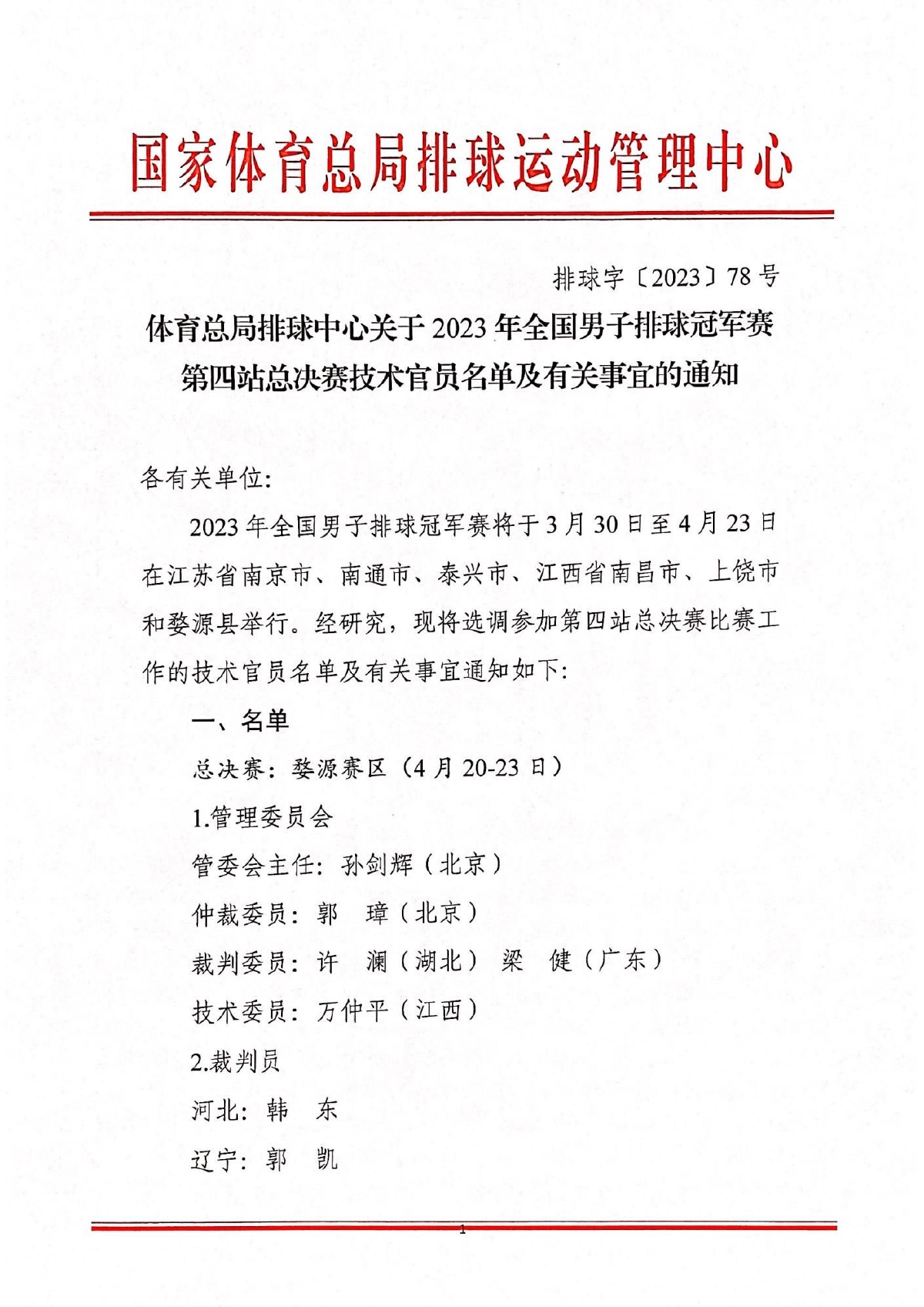 关于2023年全国男排冠军赛第四站总决赛技术官员及有关事宜的通知