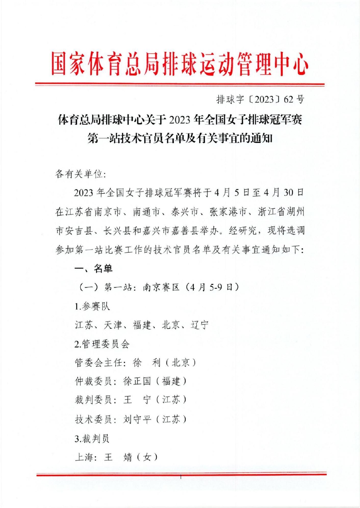 关于2023全国女排冠军赛第一站技术官员名单及有关事宜的通知