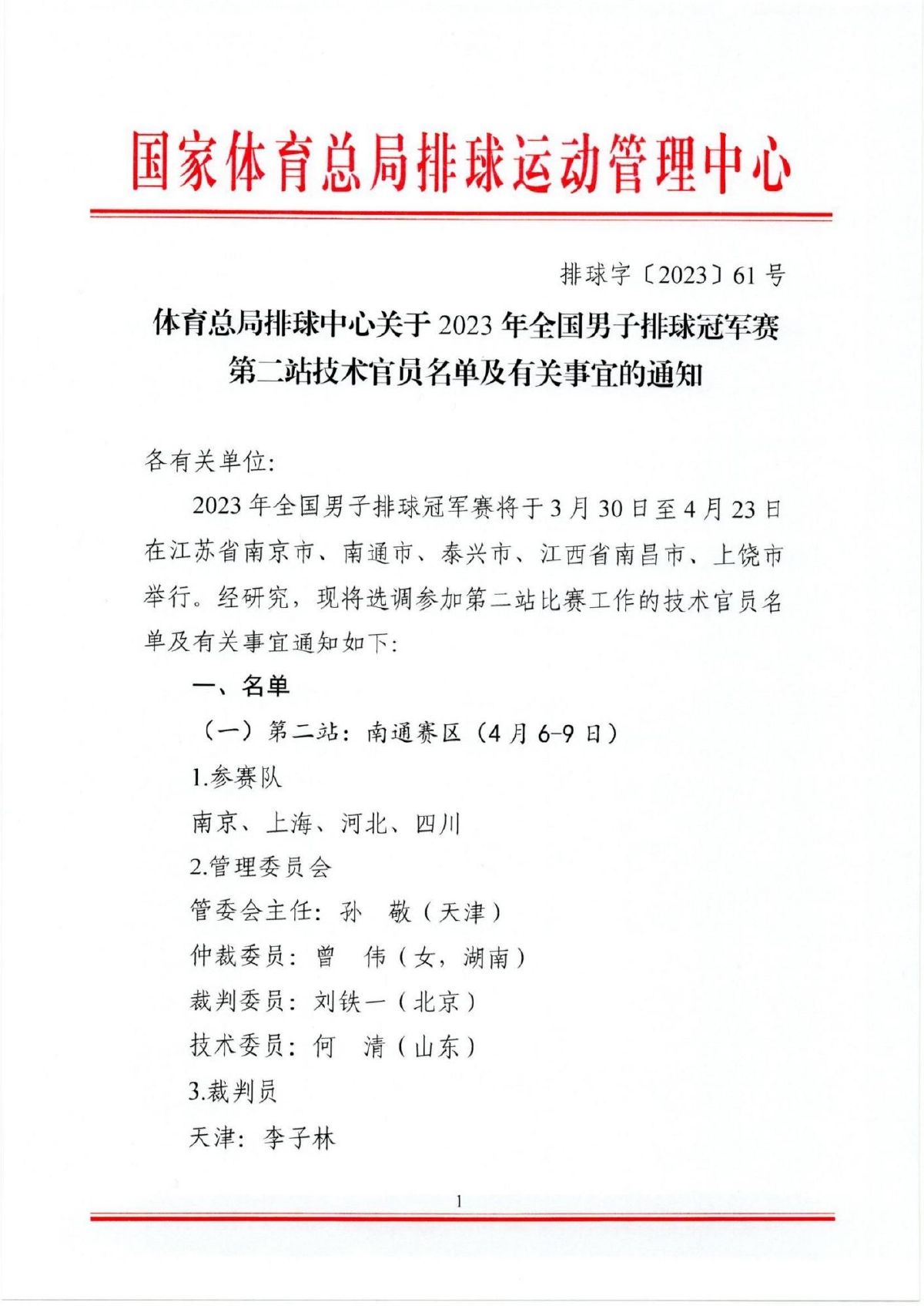 关于2023全国男排冠军赛第二站技术官员名单及有关事宜的通知