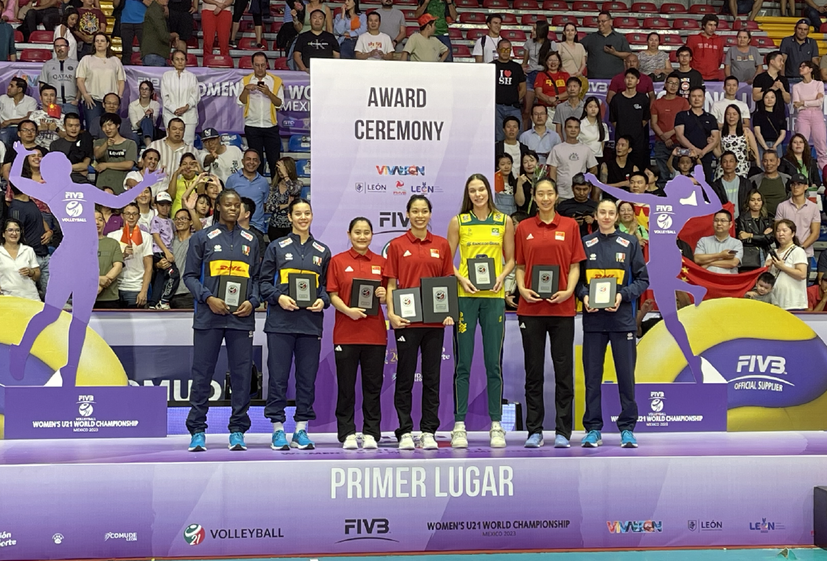 北京时间8月27日中午,2023年U21女排世界锦标赛在墨西哥莱昂落下帷幕。在冠亚军决赛中,中国队在两度落后的情况下两度扳平比分并最终以3比2逆转战胜意大利队夺得冠军,五局比分为19比25、25比23、23比25、25比22、15比8。中国队三人入围本届比赛的最佳阵容。队长庄宇珊荣膺最有价值球员并获得最佳主攻奖,万梓玥和朱星辰分别获得最佳副攻和最佳自由人奖。