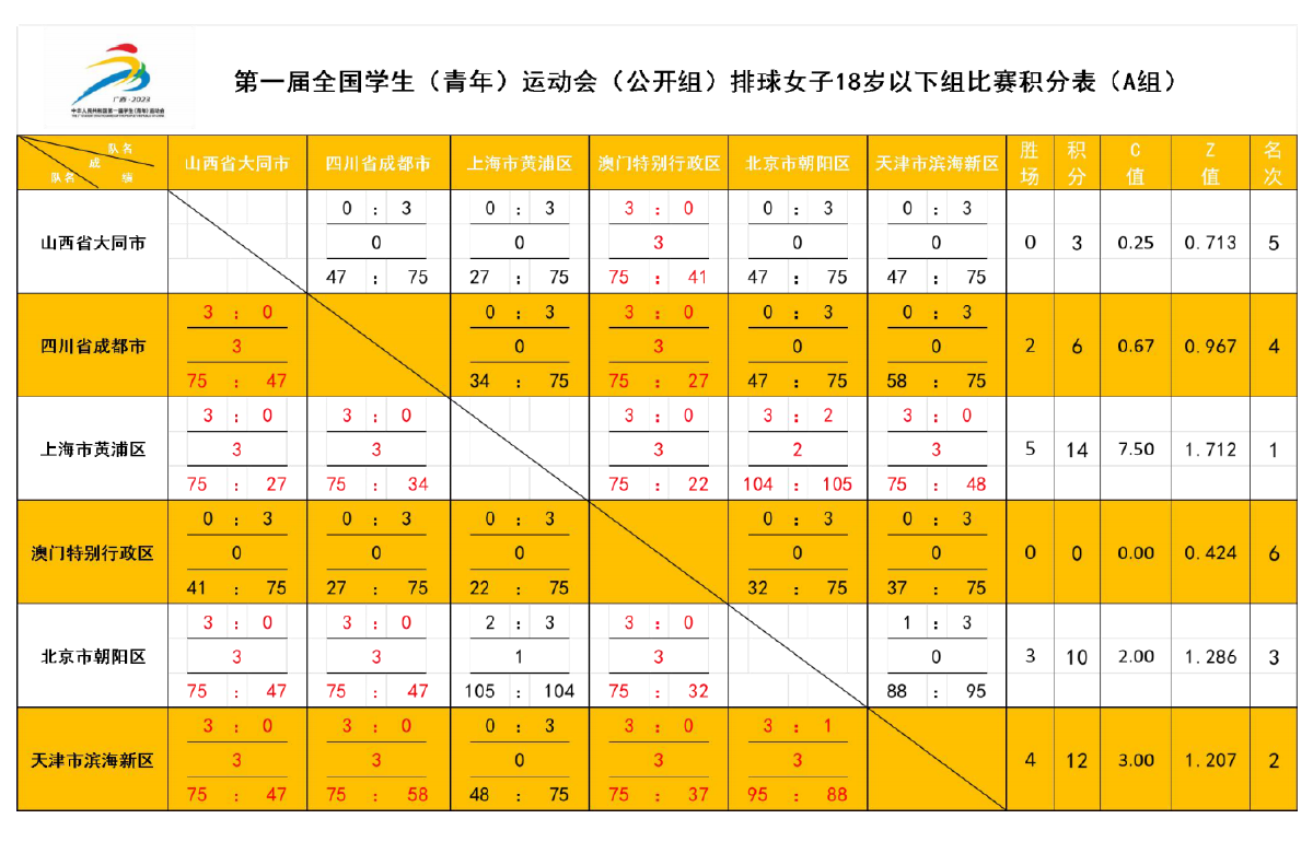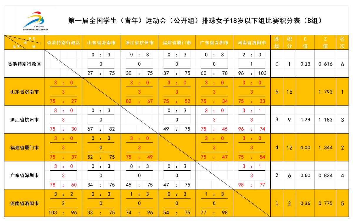 2023年10月28日,第一届全国学生(青年)运动会(公开组)排球女子18岁以下组比赛结束了小组赛的争夺,八强队伍全部产生。经过五轮较量,上海市黄浦区以5战全胜积14分的成绩排名A组头名;B组经过七轮对决,山东省济南市以全胜战绩位居榜首。