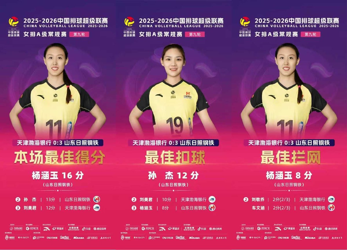 2026年1月13日晚,2025-2026中国女子排球超级联赛常规赛A级第九轮一场焦点战在天津市人民体育馆落下帷幕。最终,天津渤海银行女排主场0比3不敌山东日照钢铁女排,三局比分为13比25、26比28、23比25。
