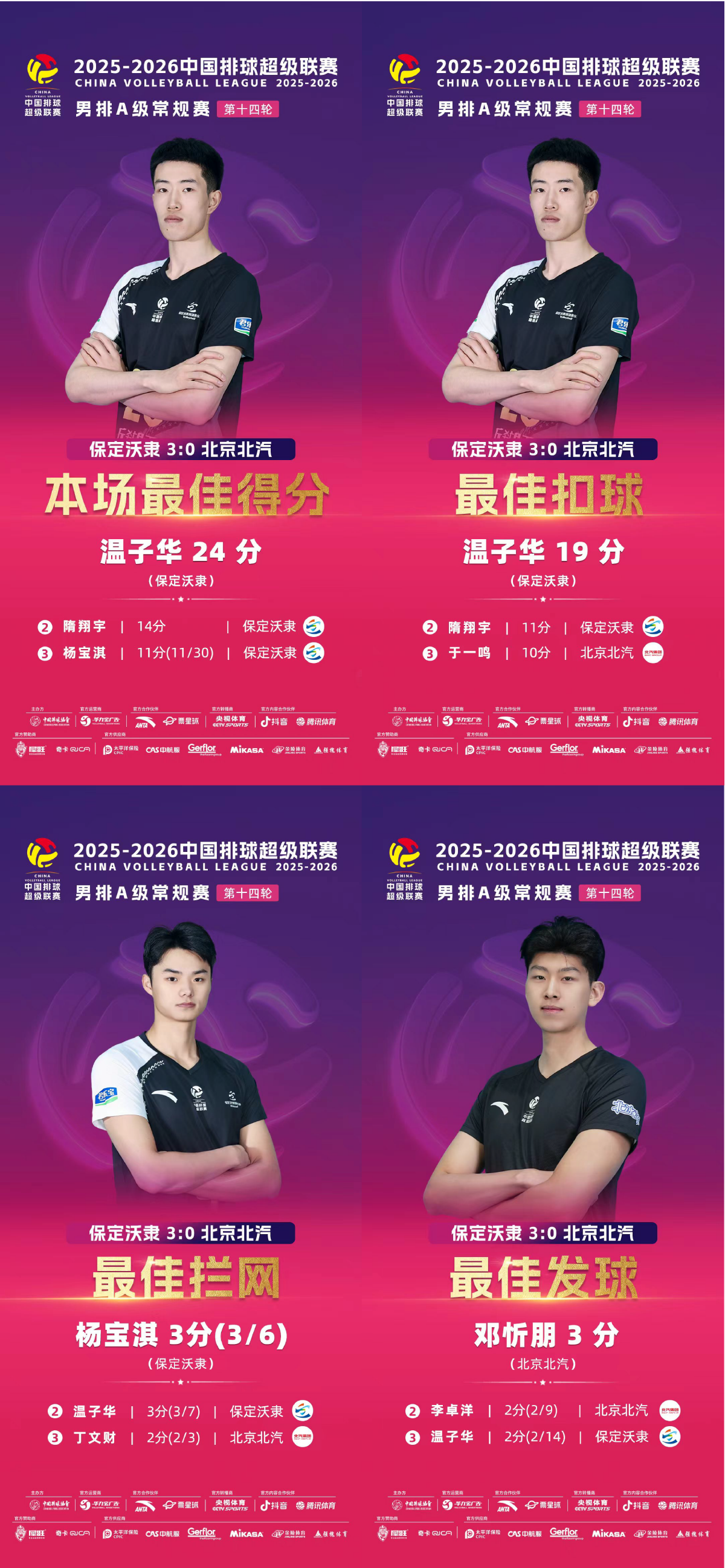 纵观整场比赛,保定沃隶男排在进攻、拦网方面均优于北京北汽男排,进攻得分44比33,拦网得分9比3,但发球得分4比7略处下风,控制自失环节也略逊一筹,失误送分22比21。本场最佳得分方面,温子华砍下24分荣膺全场得分王,隋翔宇贡献14分位居第二,杨宝淇与李卓洋同获11分,杨宝淇凭借更高的得分效率排名第三。最佳扣球方面,温子华以19分居首,隋翔宇11分次之,于一鸣10分位列第三。最佳拦网方面,杨宝淇与温子华均得3分,杨宝淇因效率更高排名第一,温子华排名第二,丁文财与隋翔宇各得2分,丁文财效率占优排名第三。最佳发球方面,邓忻朋以3分排名第一,李卓洋与温子华同得2分,李卓洋凭借更优效率位居第二,温子华排名第三。
