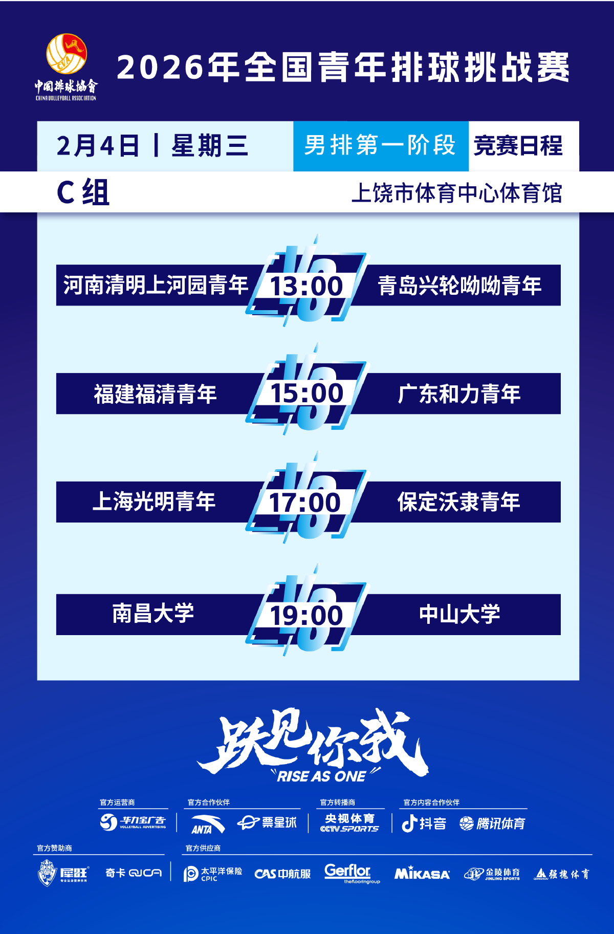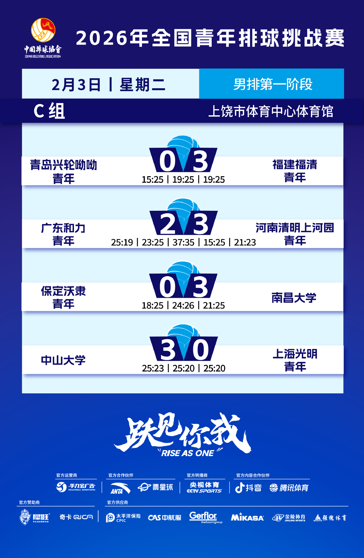 2月4日,2026年全国青年排球挑战赛第一阶段排名赛展开最后一轮的争夺。男子C组,河南清明上河园青年迎战青岛兴轮呦呦青年,福建福清青年对阵广东和力青年,上海光明青年与保定沃隶青年交手,南昌大学与中山大学展开强强对话,争夺头名。