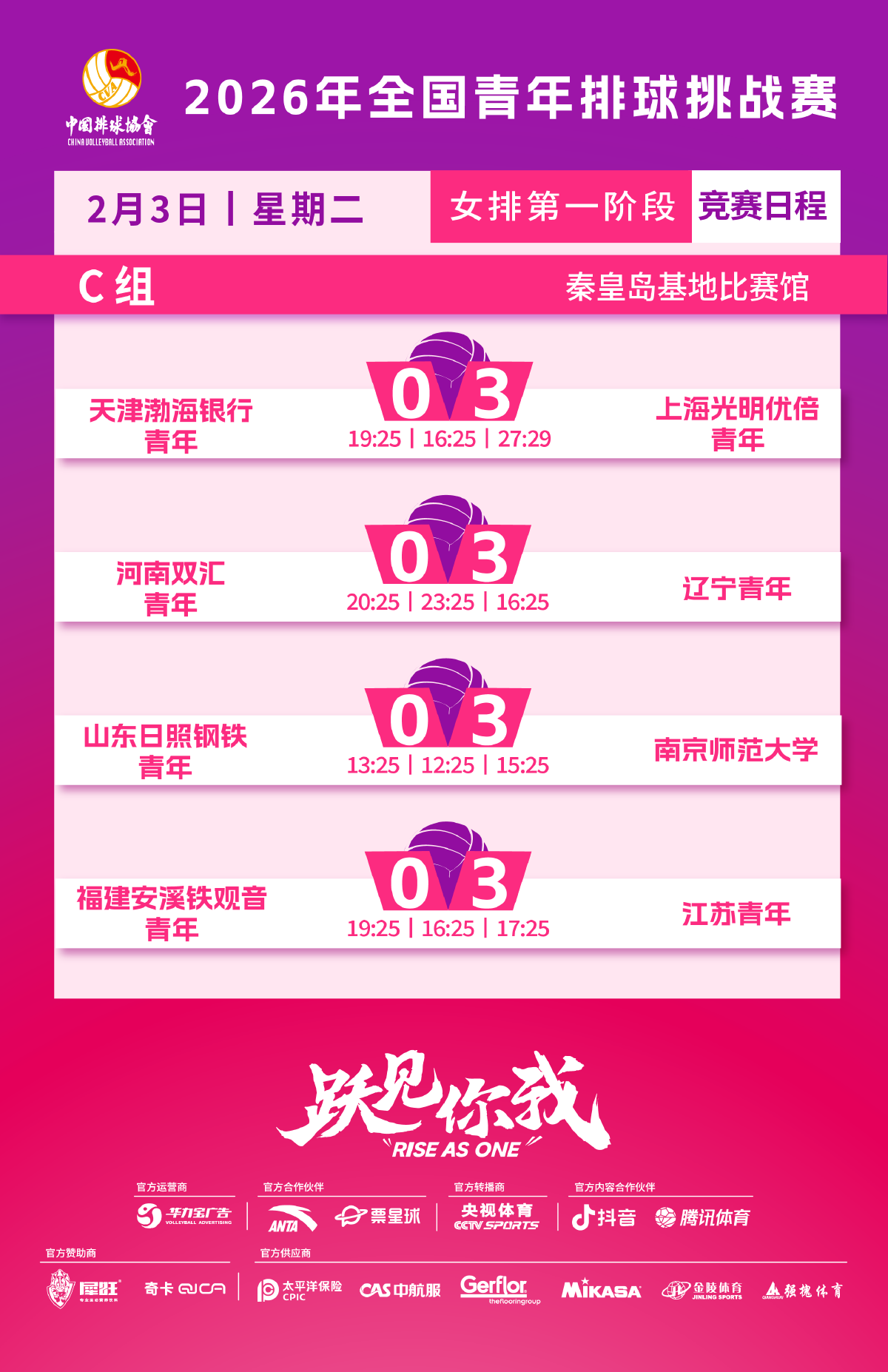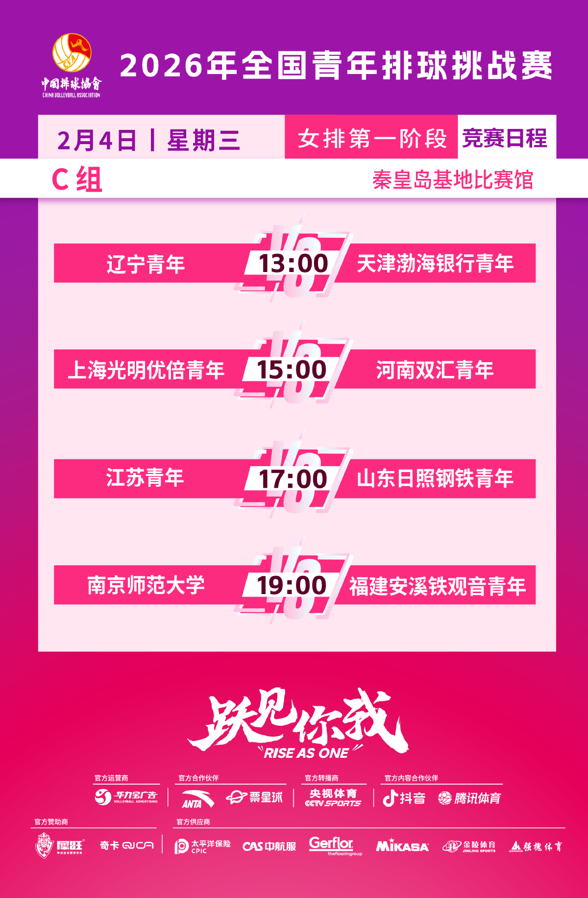 女子C组,辽宁青年迎战天津渤海银行青年,上海光明优倍青年对阵河南双汇青年,江苏青年迎战山东日照钢铁青年,南京师范大学与福建安溪铁观音青年交锋。