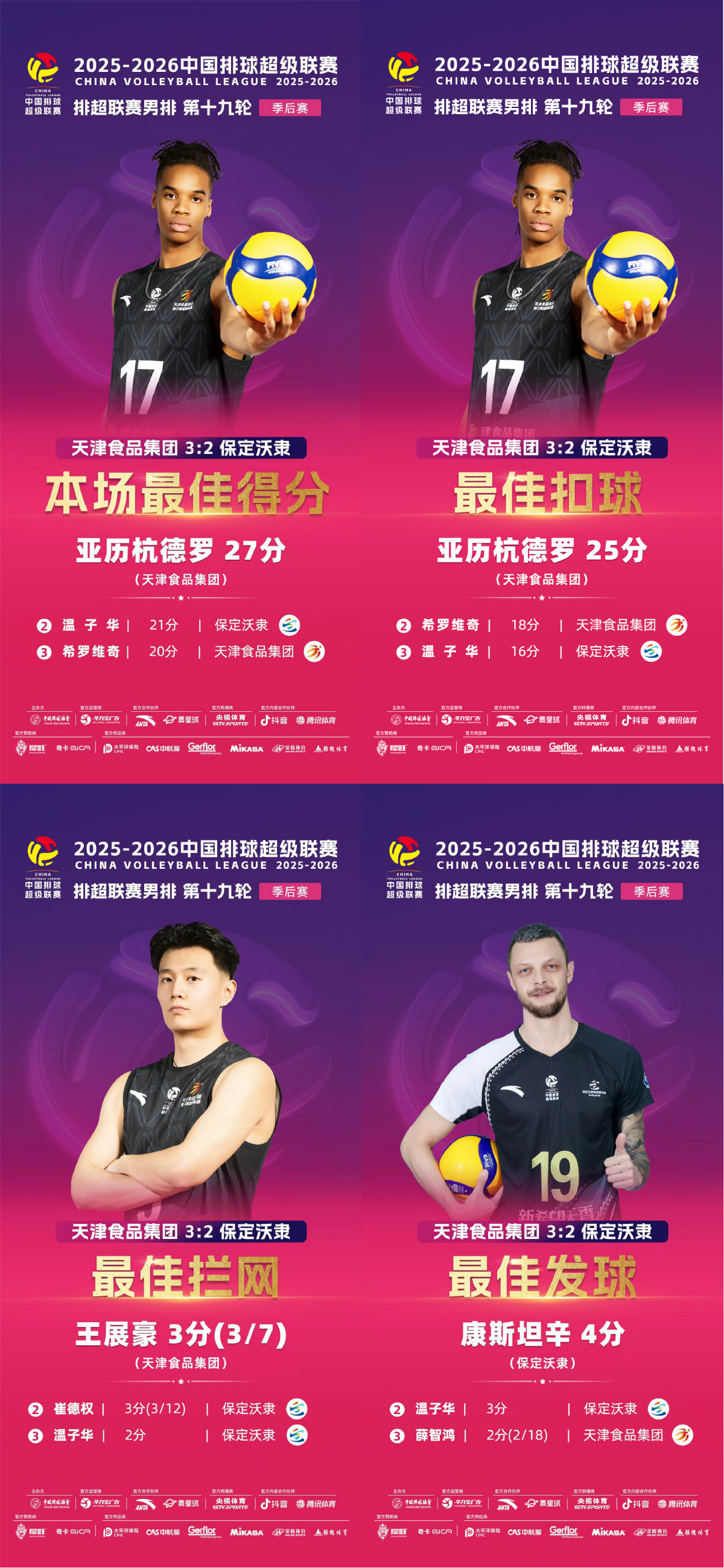 纵观整场比赛,天津食品集团男排在进攻和控制自失两项数据中占优,其中进攻得分61比54、失误送分为24比30。拦网和发球环节保定队占优,其中拦网得分8比6,发球得分10比6。本场比赛最佳得分方面,亚历杭德罗以27分荣膺全场得分王,温子华21分位列第二,希罗维奇20分位列第三。最佳扣球方面,亚历杭德罗25分排名第一、希罗维奇18分位居第二、温子华16分位列第三。最佳拦网方面,王展豪和崔德权都得到3分,因效率值不同分别一、二位,温子华2分排名第三。最佳发球方面,康斯坦辛4分排名第一、温子华3分排名第二,薛智鸿2分因得分效率高,力压同获2分的亚历杭德罗排名第三位。