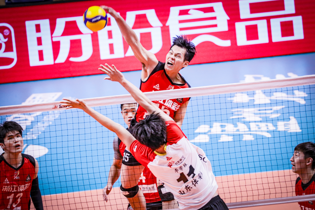 第二局,浙江队在开局相持的情况下连续三个拦网成功,5-2拉开比分,山东队请求暂停。暂停回来,山东队并没有打出反击的节奏,反而是浙江队越打越好,多点开花,随着张冠华一记后排进攻下分,浙江队已经取得了14-6的领先。随着王滨的一记轻拍造成对方打手出界,浙江队25-15扳回一局,大比分来到1-1。