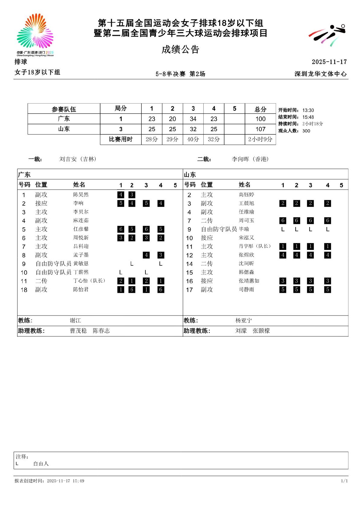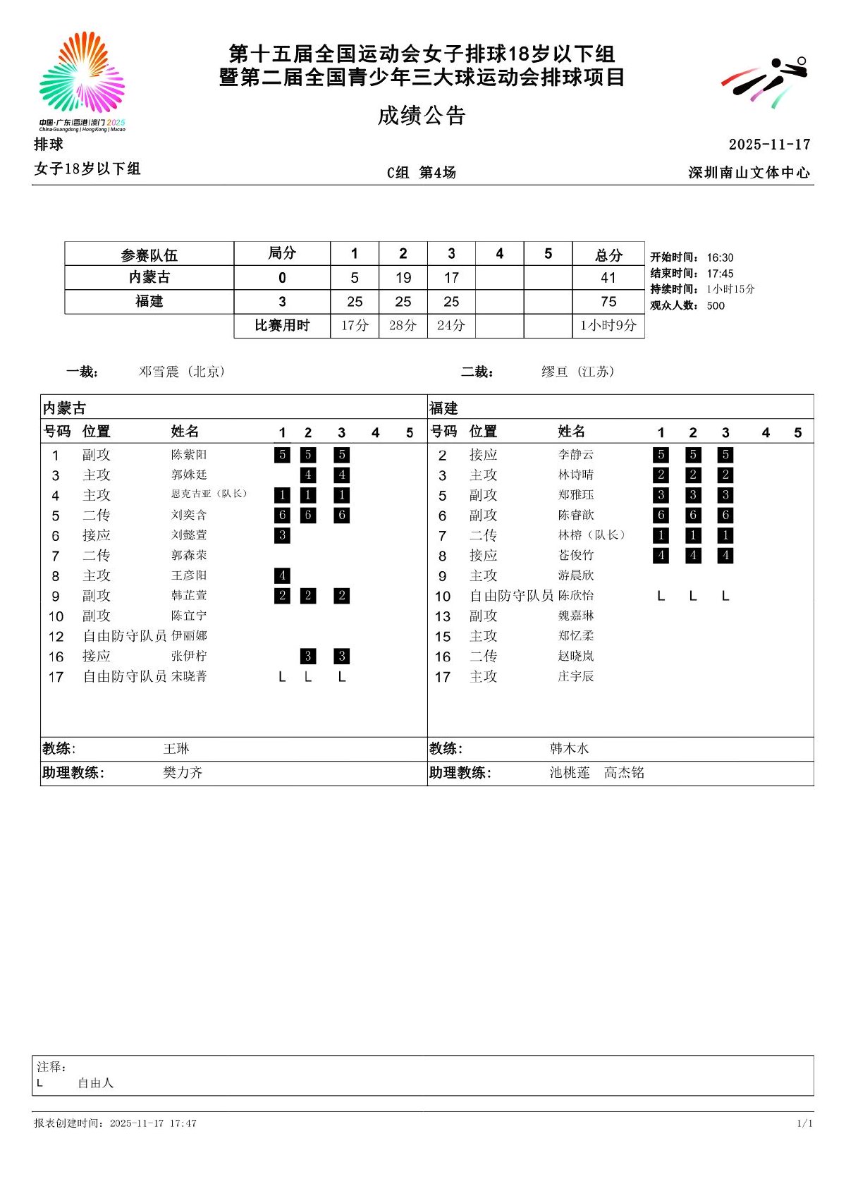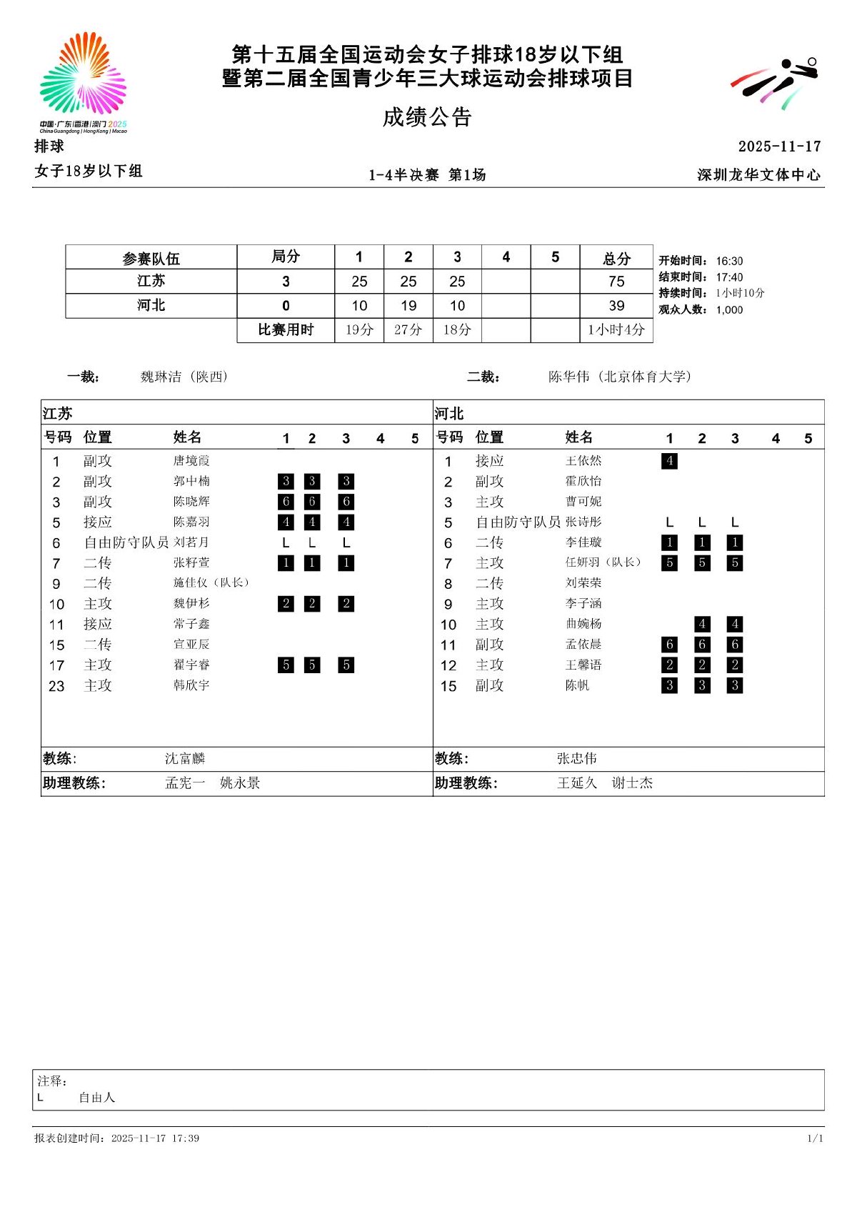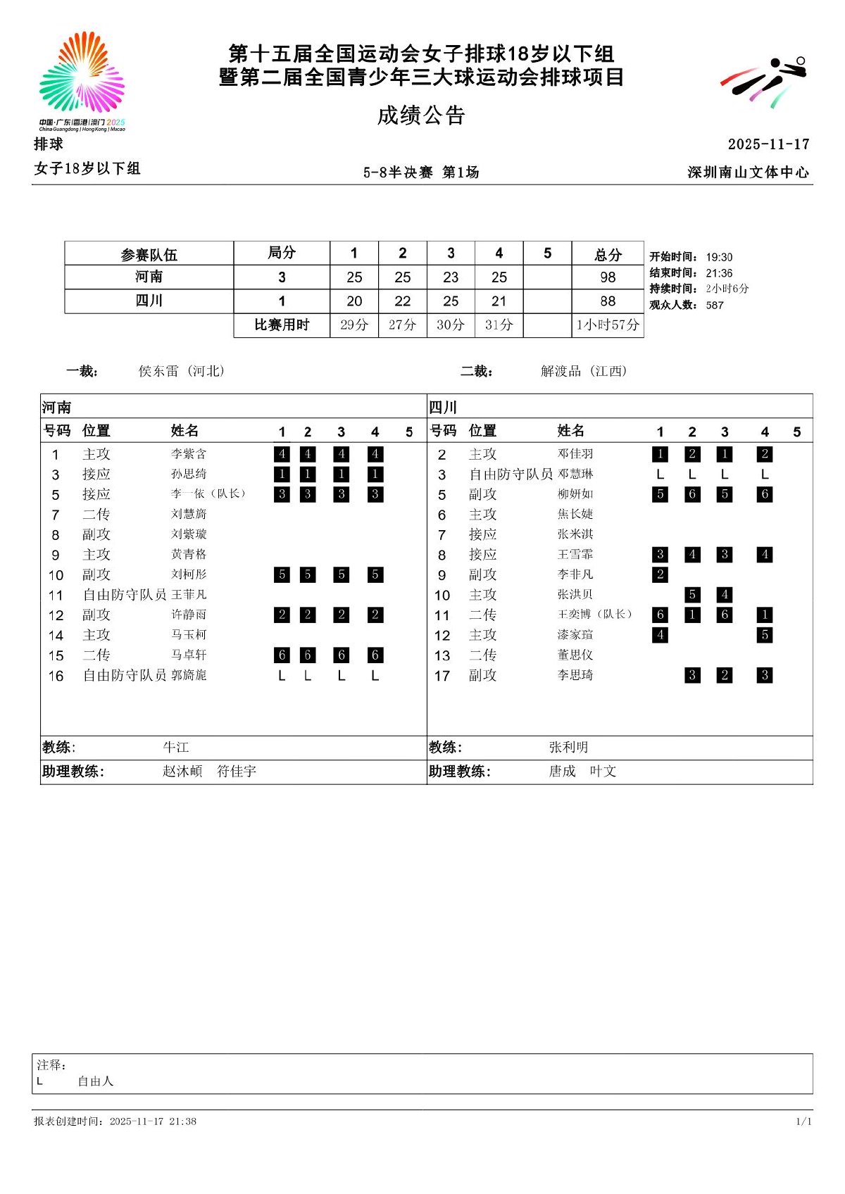 第十五届全国运动会排球项目(女子18岁以下组)比赛8号公告
