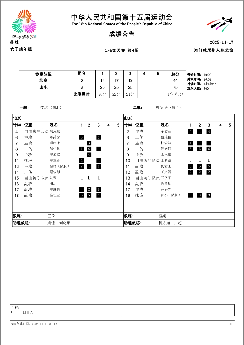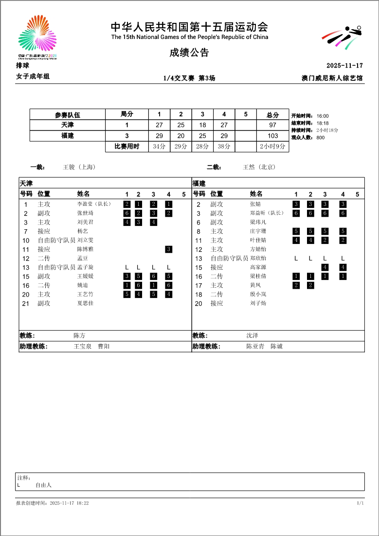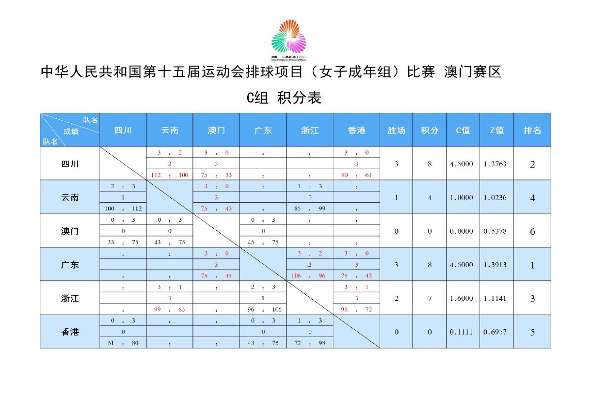 第十五届全国运动会排球项目(女子成年组)比赛9号公告