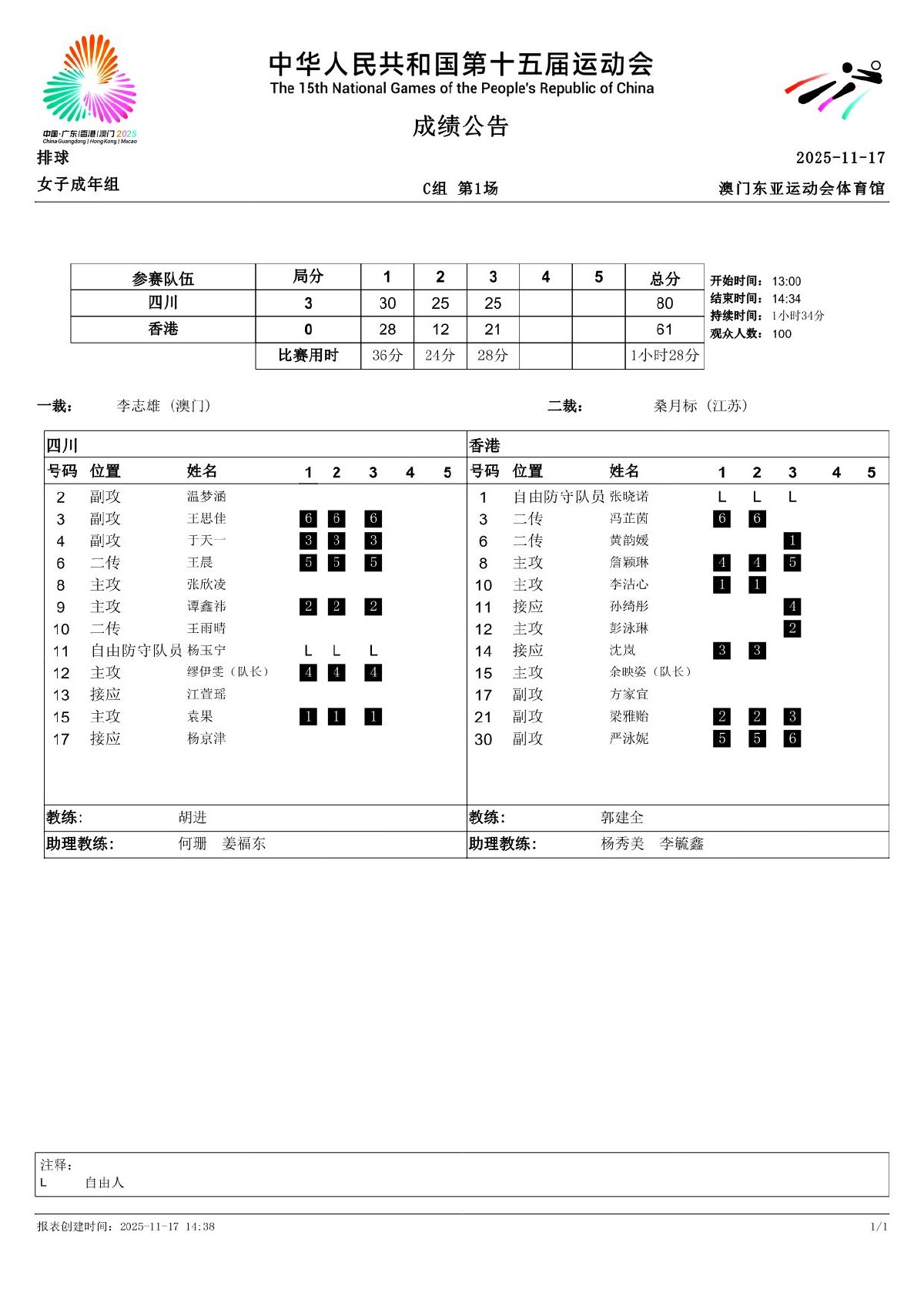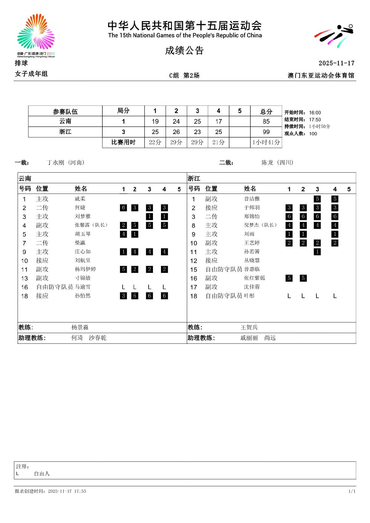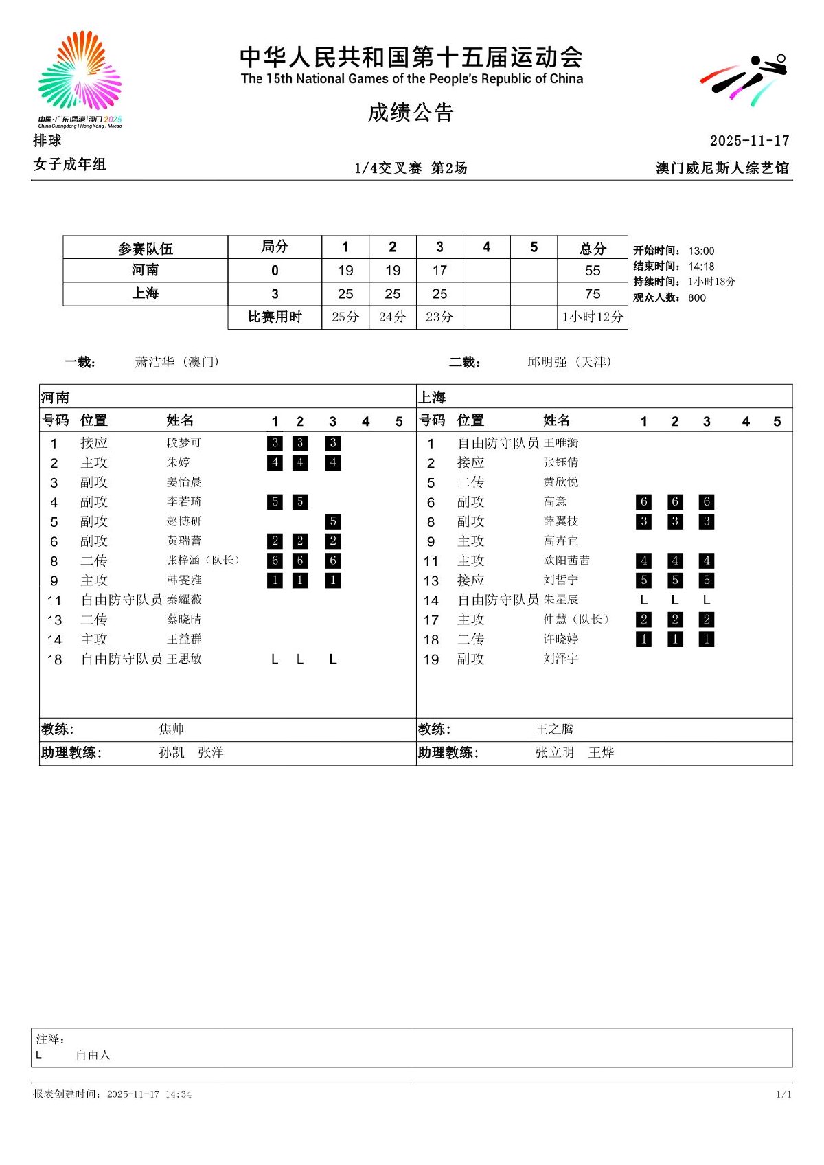 第十五届全国运动会排球项目(女子成年组)比赛9号公告