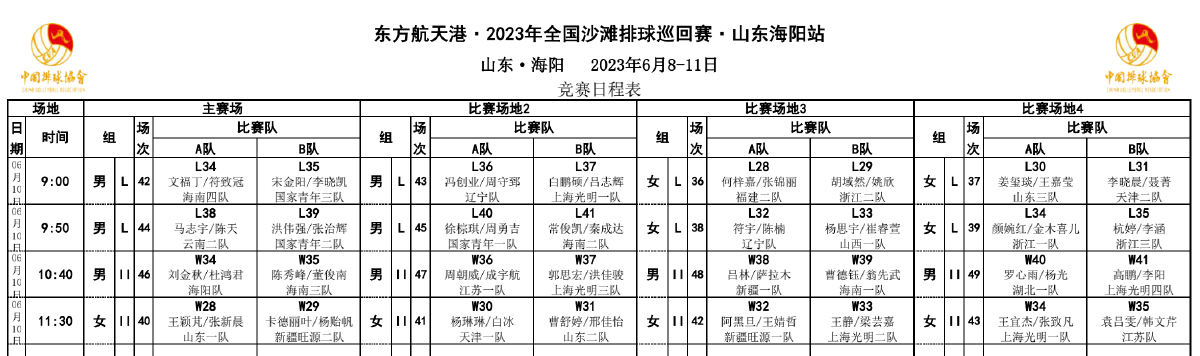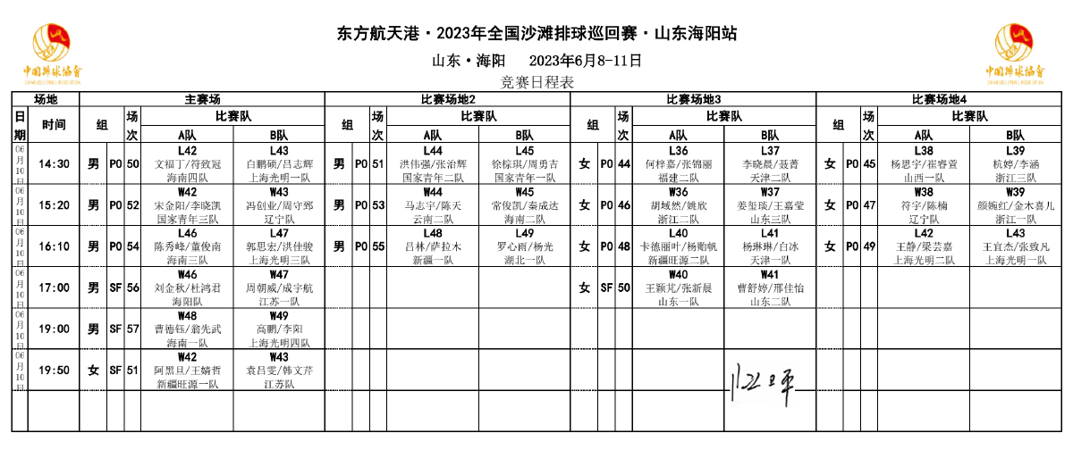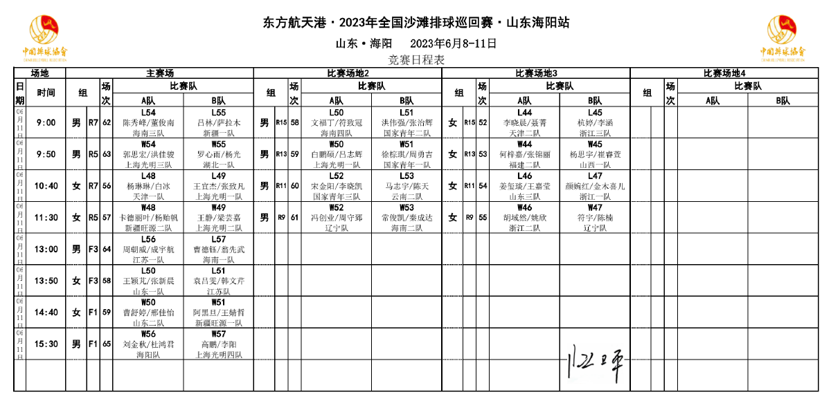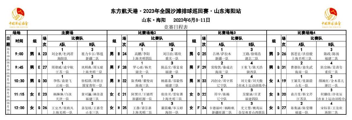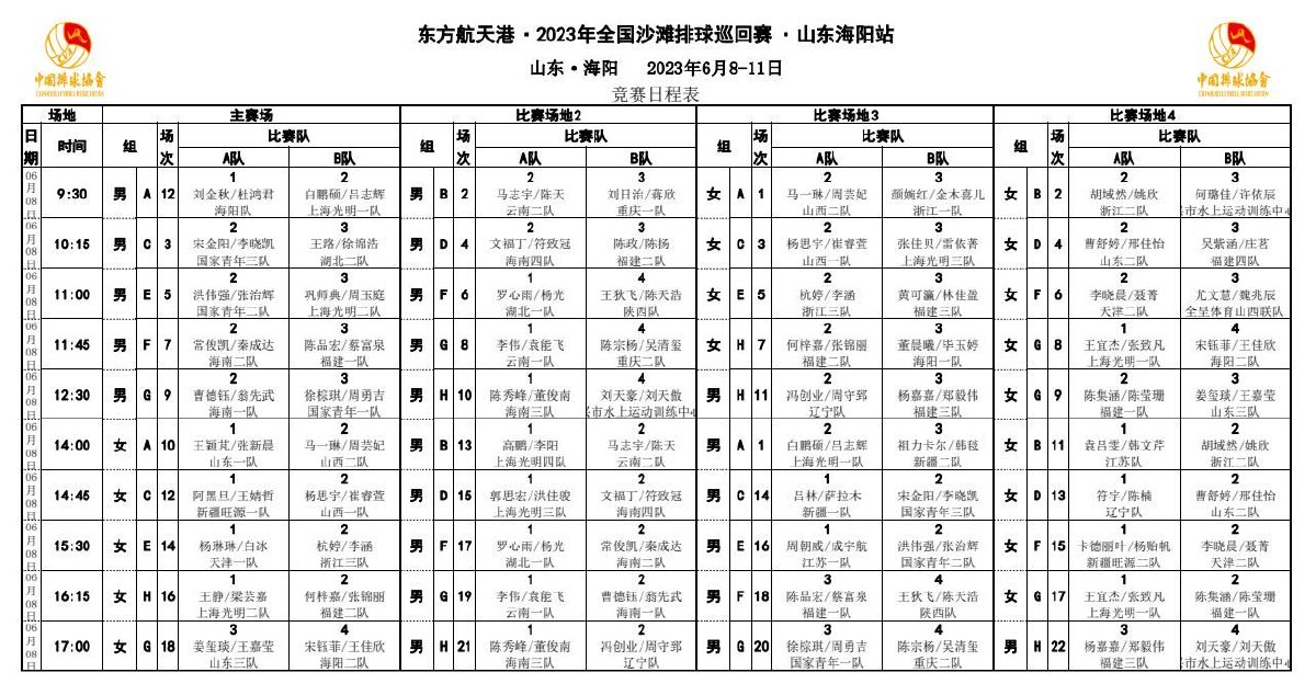 东方航天港·2023全国沙滩排球巡回赛(山东海阳站)比赛将于6月8日至11日在海阳市国家沙滩体育健身基地举行。赛事由国家体育总局排球运动管理中心主办,海阳市人民政府承办,海阳市体育运动服务中心和海阳文化旅游发展集团有限公司共同协办。本次比赛共有来自全国各省、自治区、直辖市以及国家青年队的57支队伍参赛。具体赛程如下: