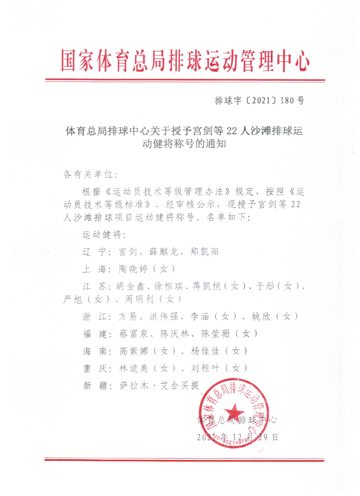 关于授予宫剑等22人沙滩排球运动健将称号的通知