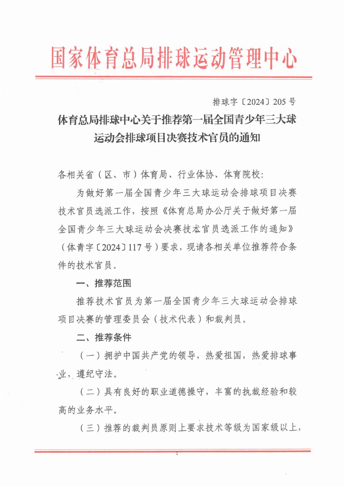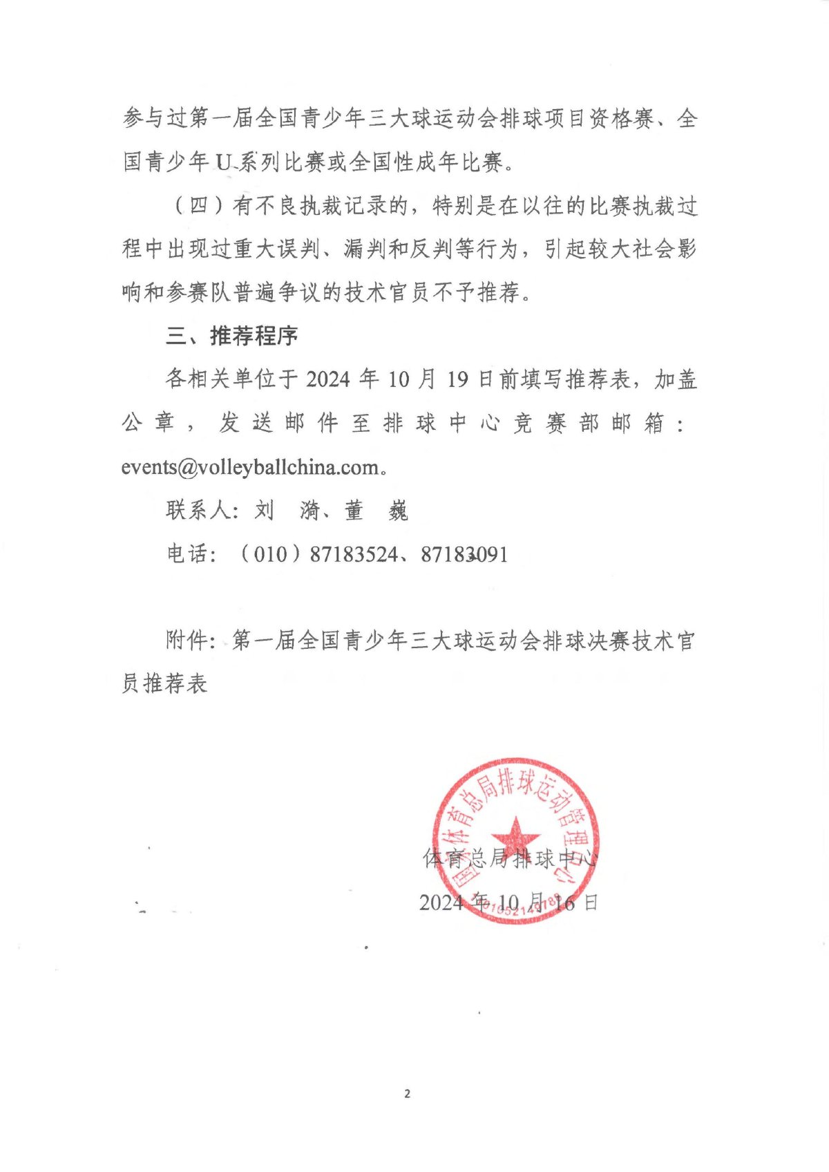 关于推荐第一届全国青少年三大球运动会排球项目决赛技术官员的通知