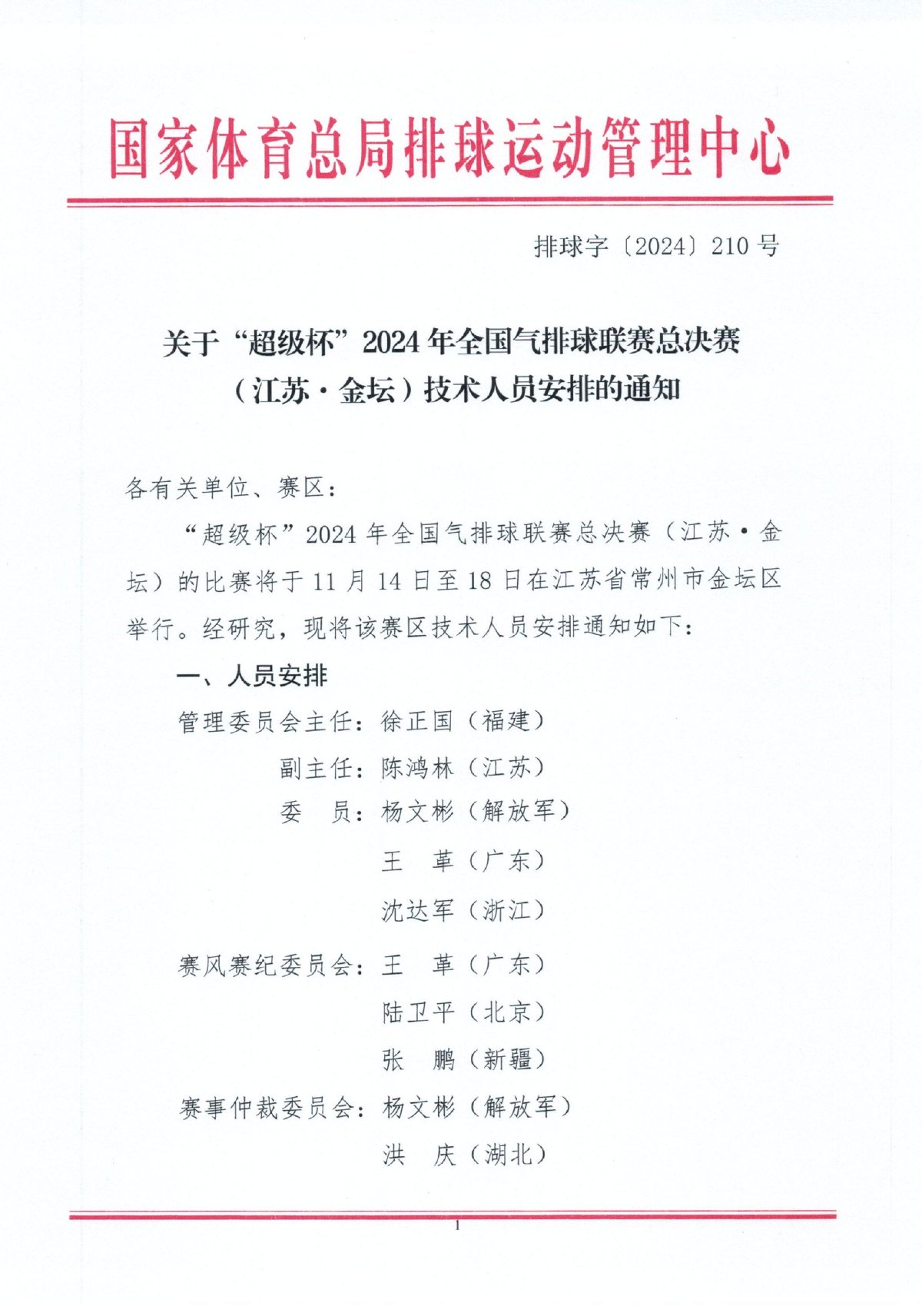 “超级杯”2024年全国气排球联赛总决赛(江苏·金坛)技术人员安排通知