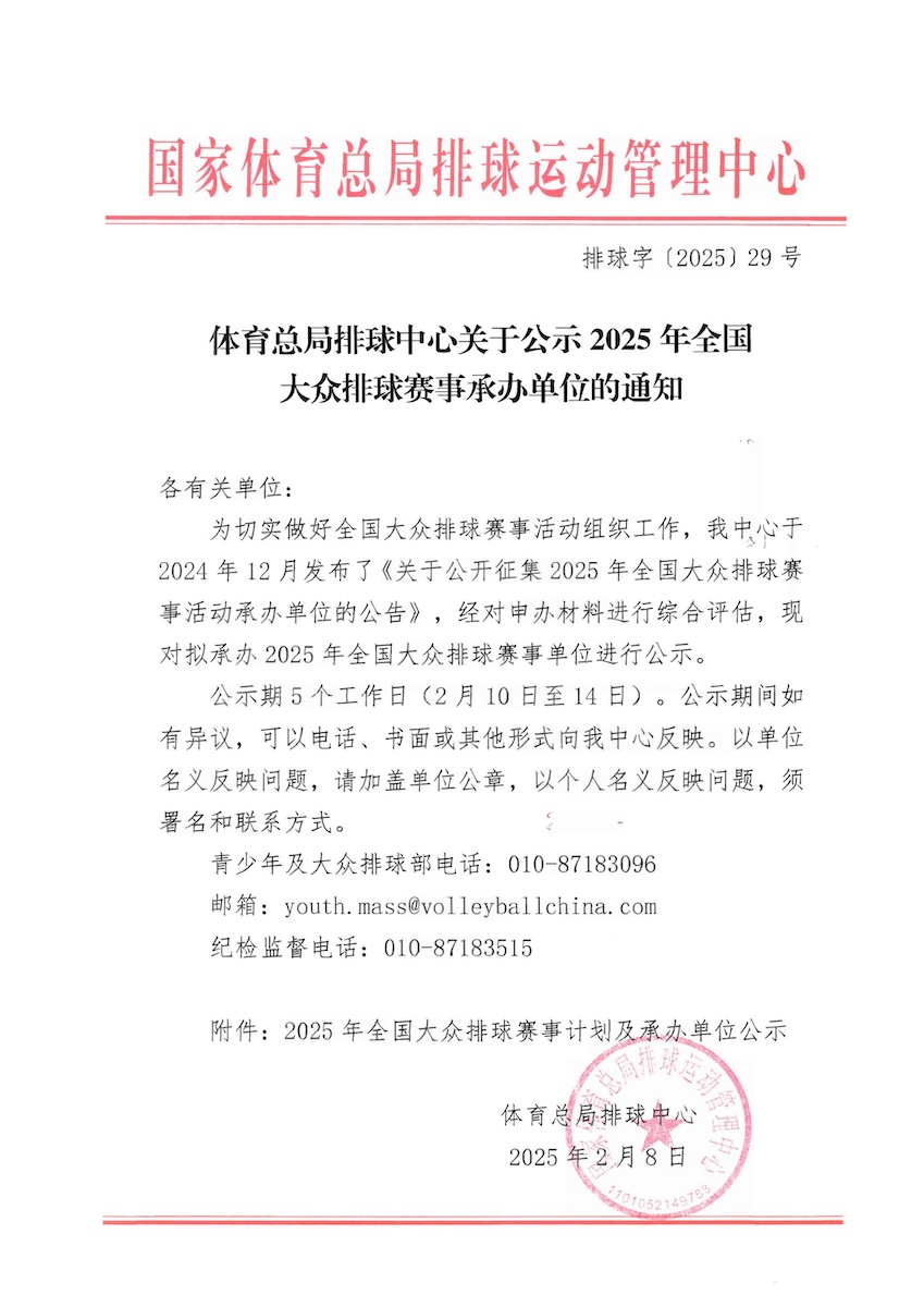 关于公示2025年全国大众排球赛事承办单位的通知