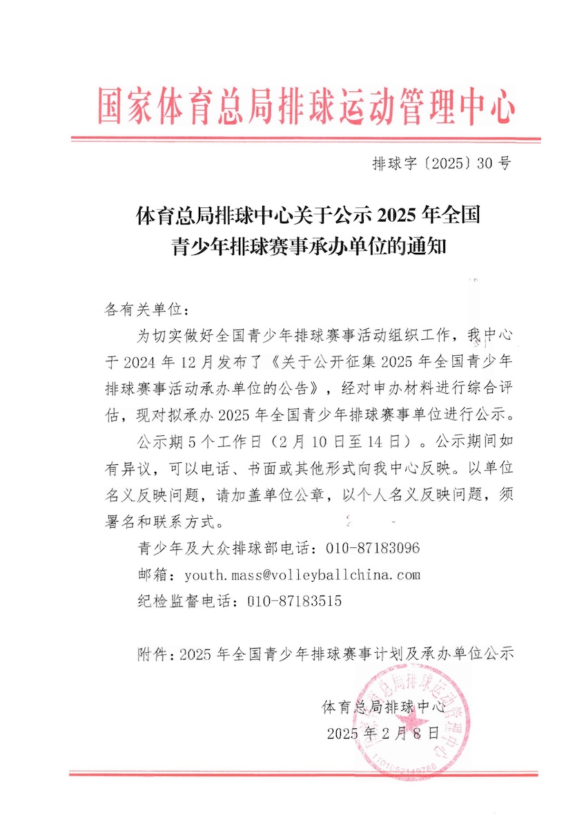 关于公示2025年全国青少年排球赛事承办单位的通知