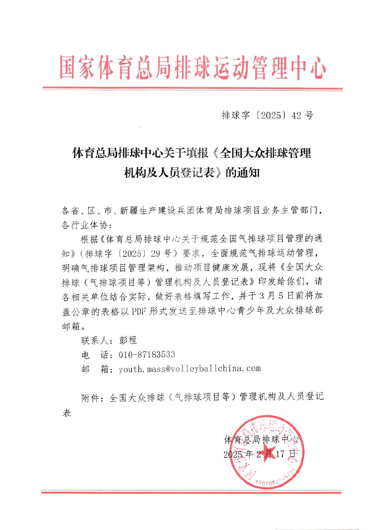 关于填报《全国大众排球管理机构及人员登记表》的通知