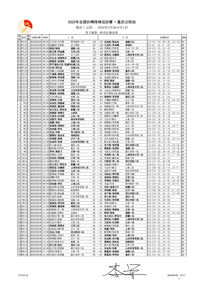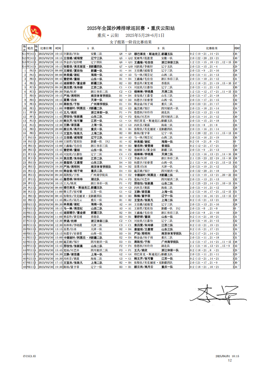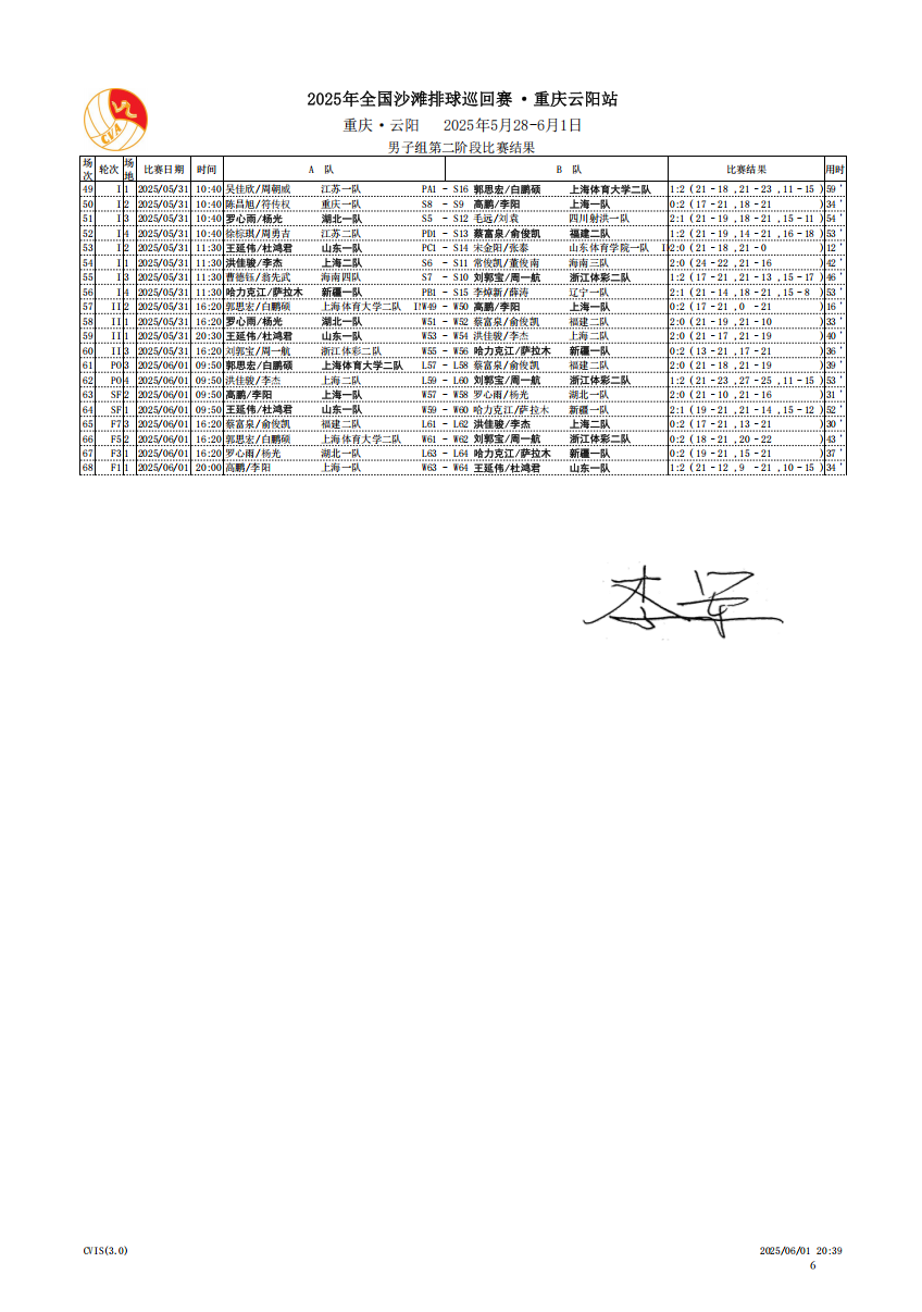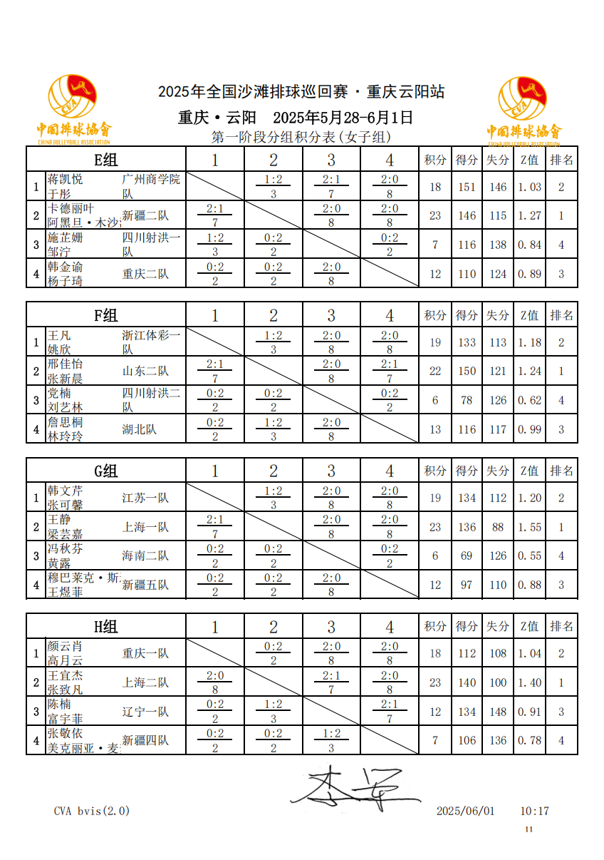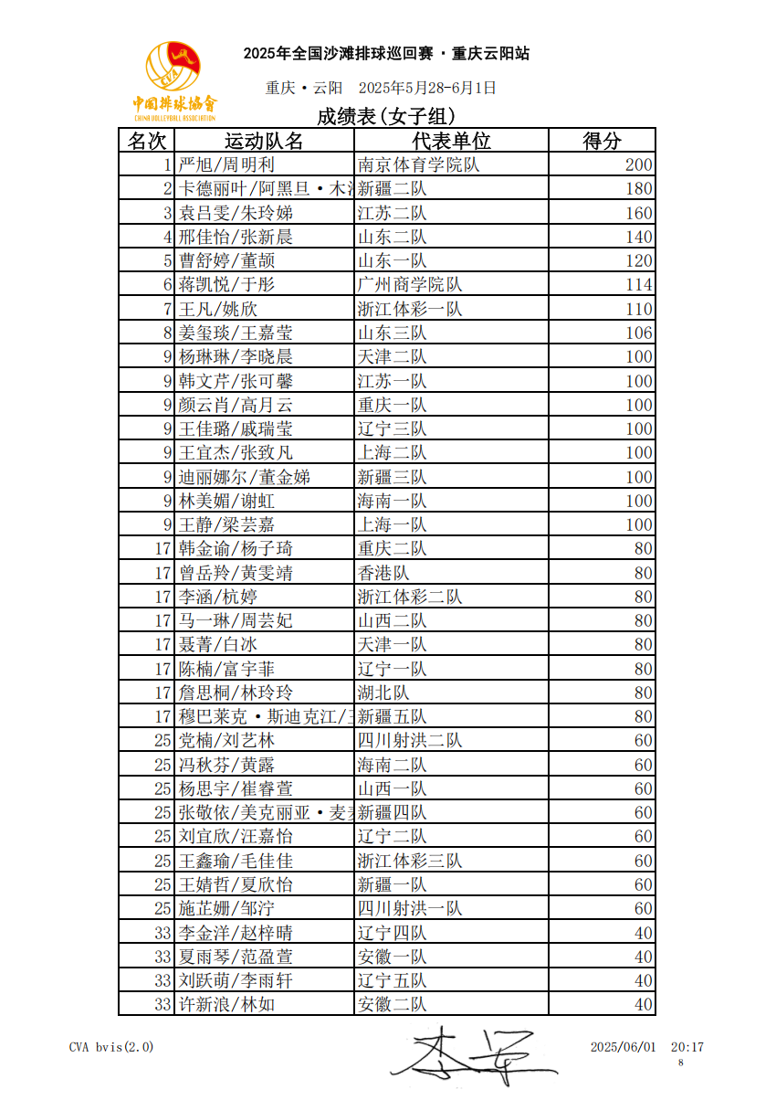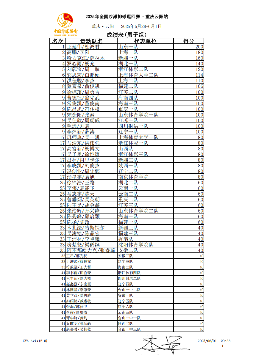 2025年全国沙滩排球巡回赛重庆云阳站成绩