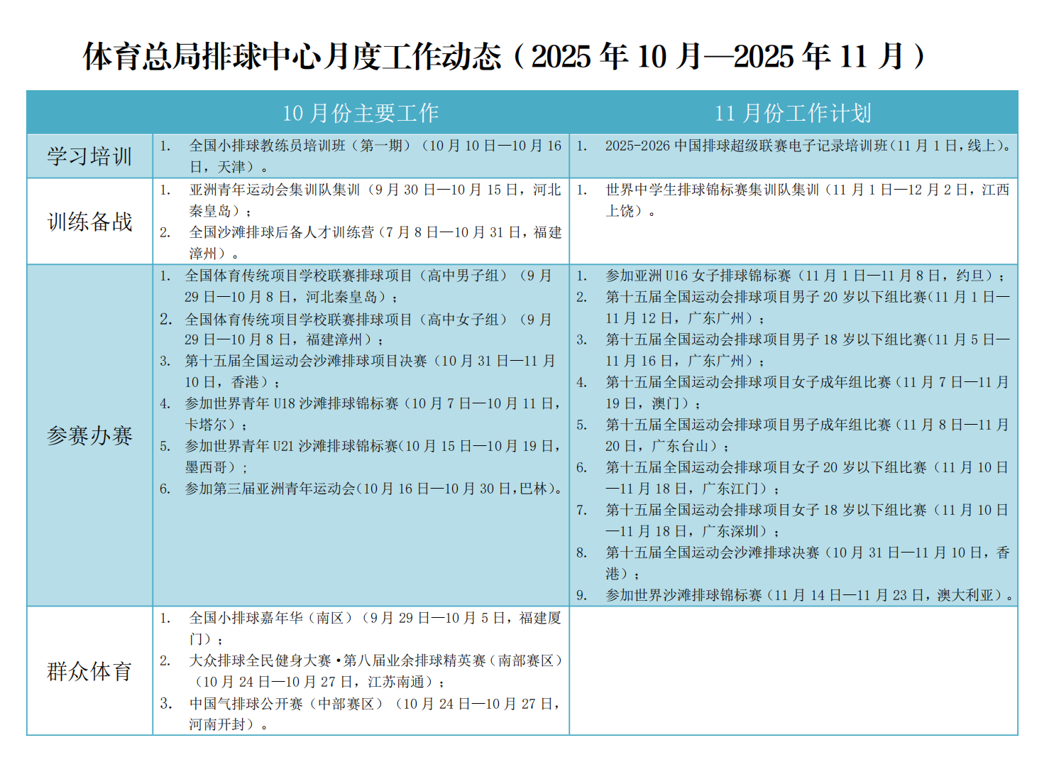 体育总局排球中心月度工作动态(2025年10-11 月)