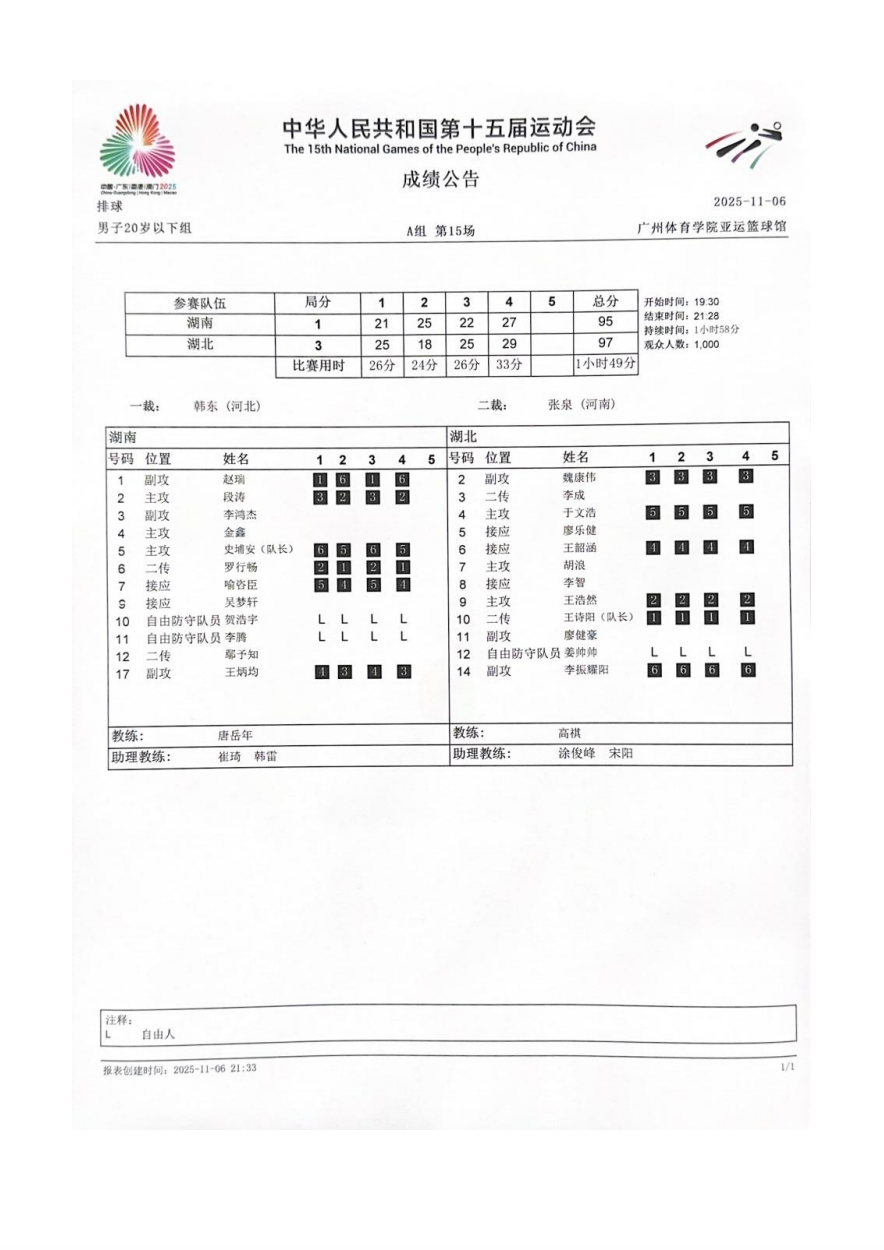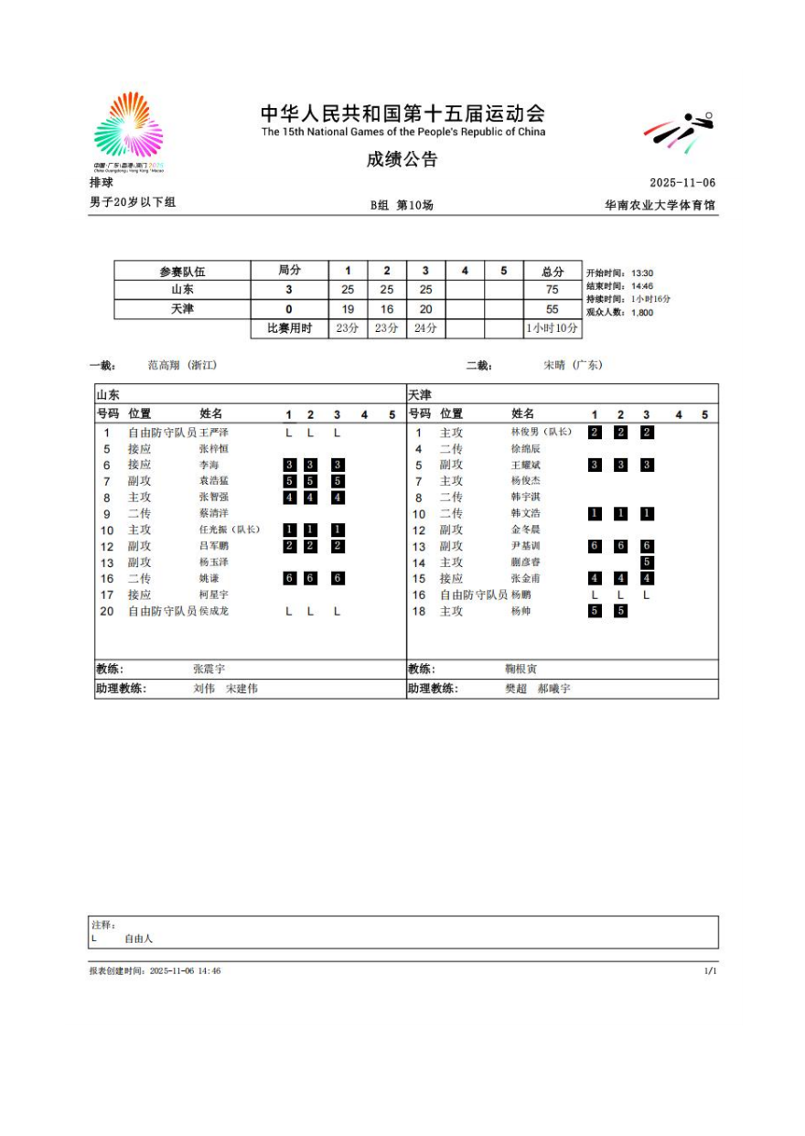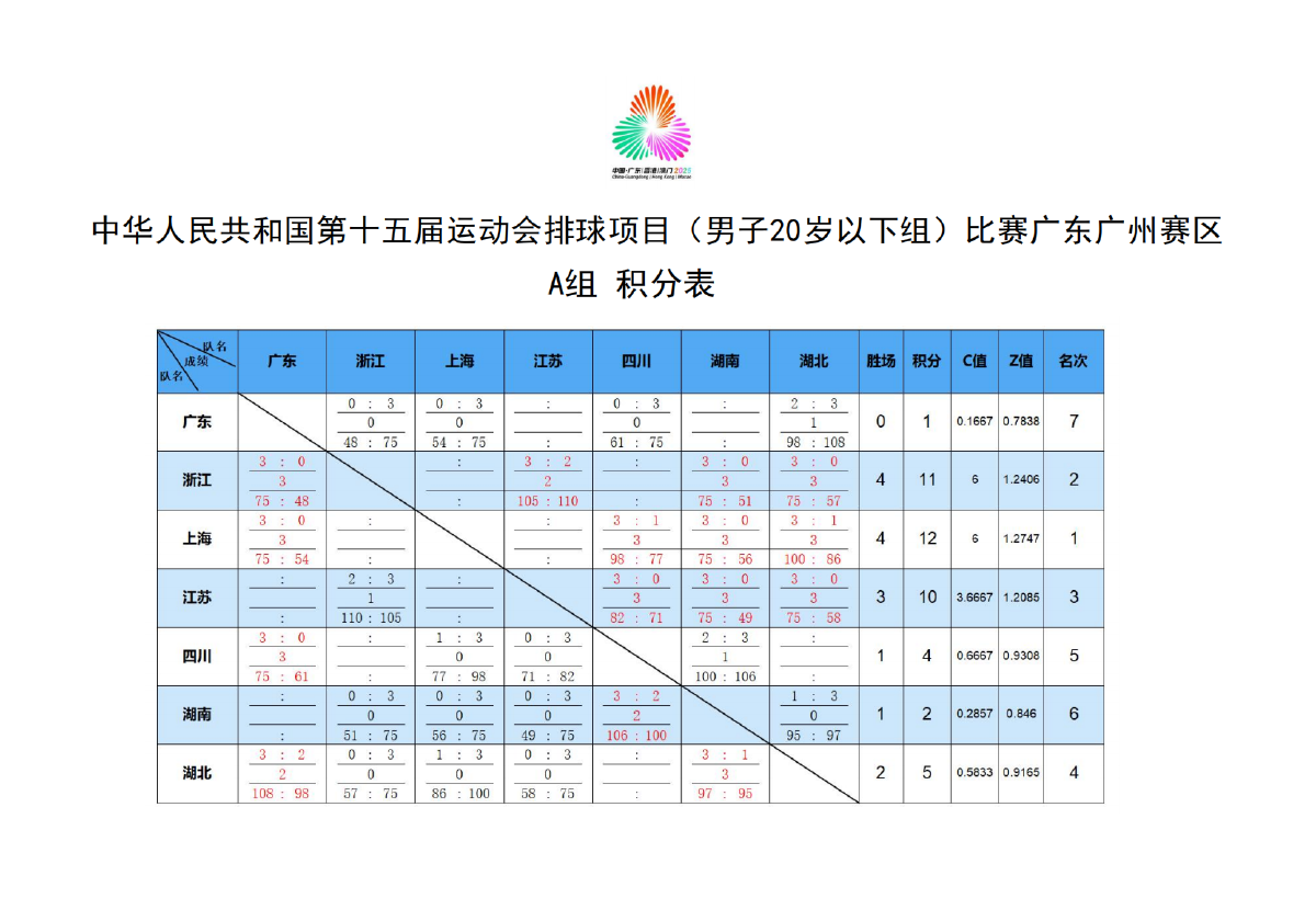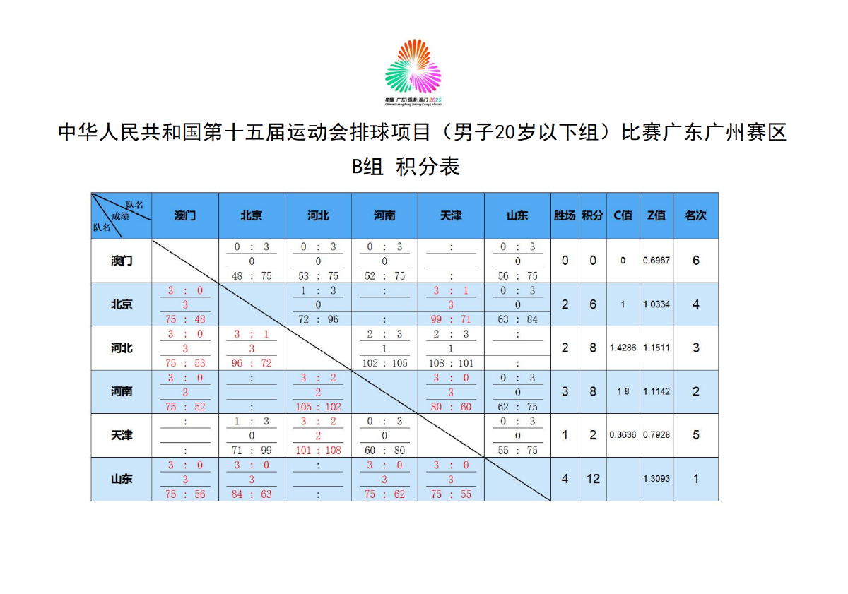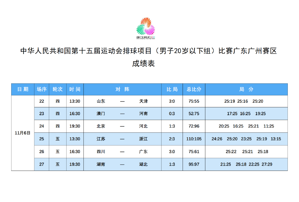 第十五届全国运动会排球项目(男子20岁以下组)比赛6号公告