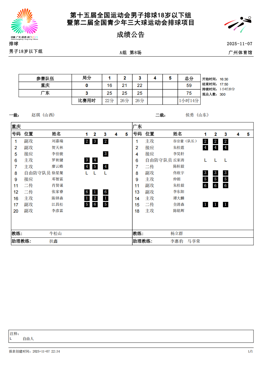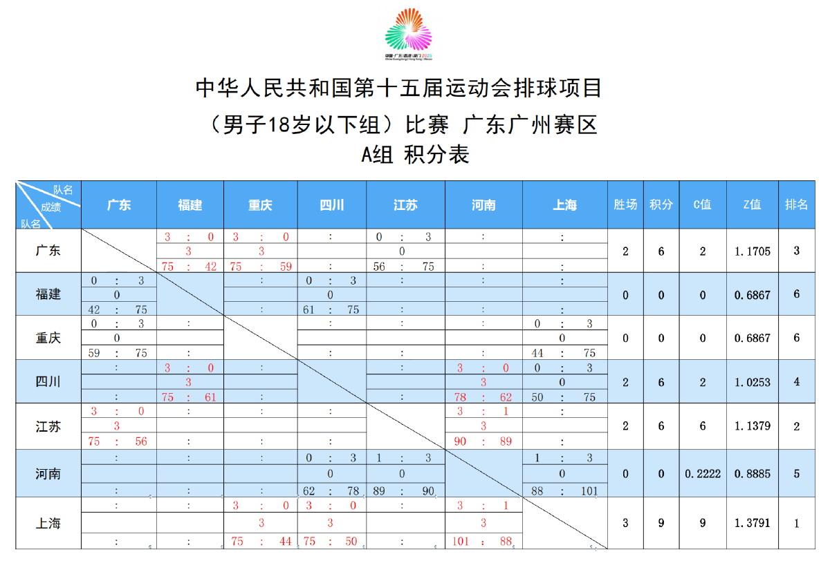 第十五届全国运动会排球项目(男子18岁以下组)比赛4号公告