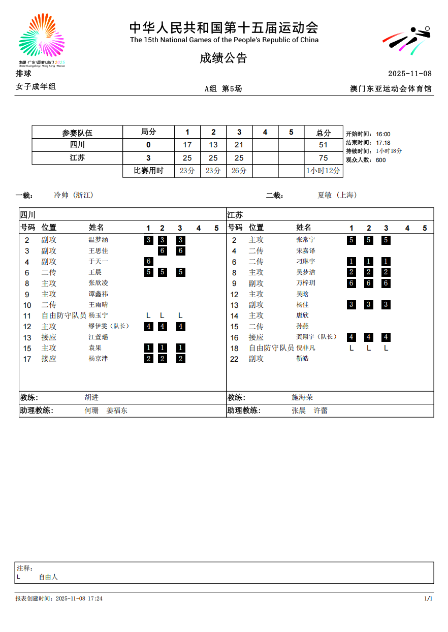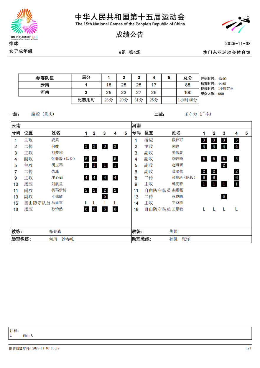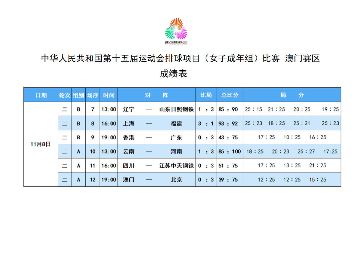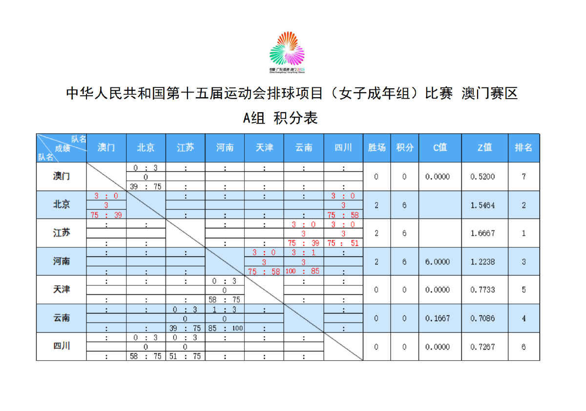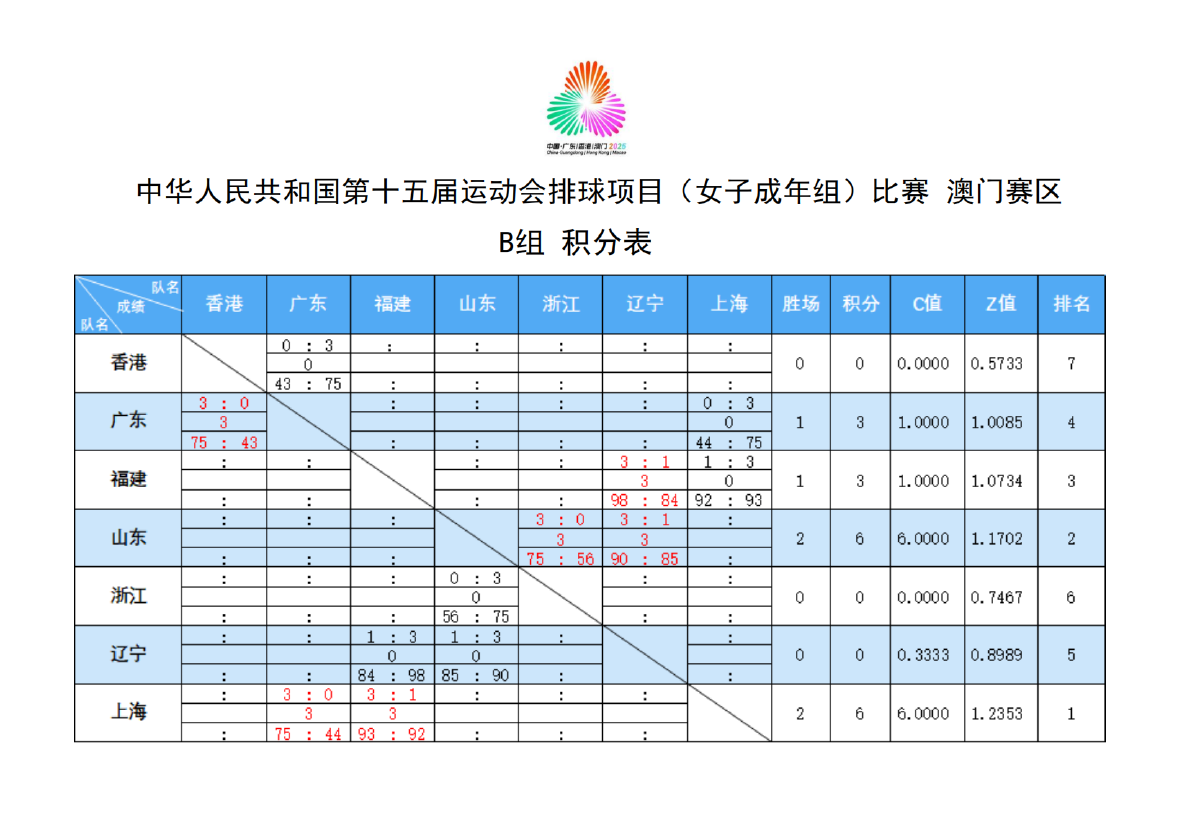 第十五届全国运动会排球项目(女子成年组)比赛3号公告