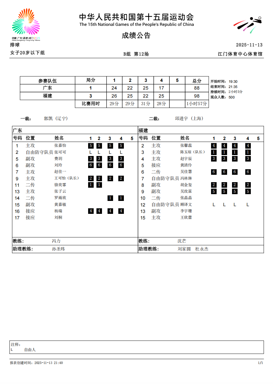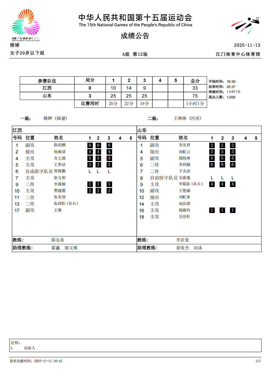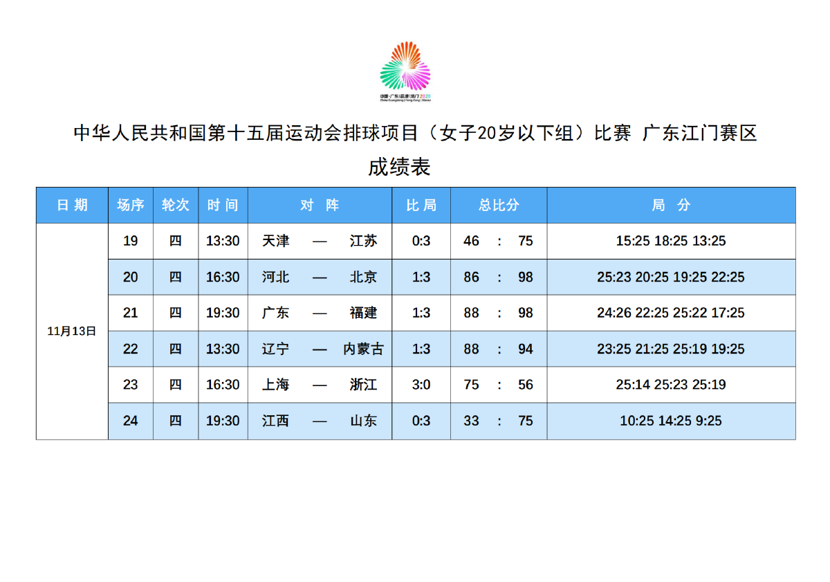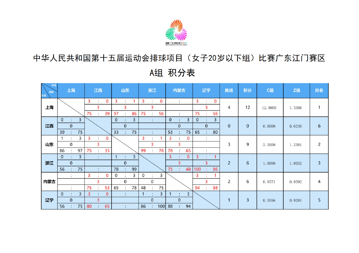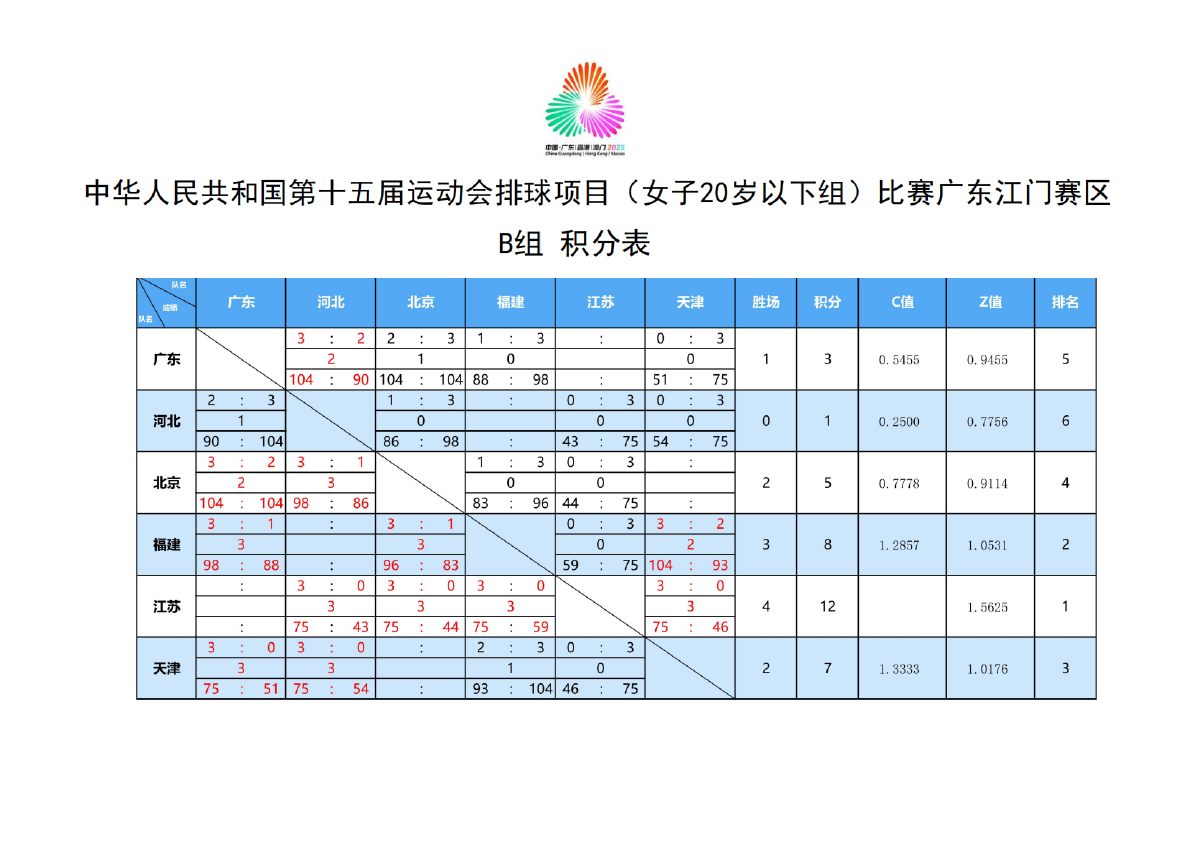 第十五届全国运动会排球项目(女子20岁以下组)比赛5号公告