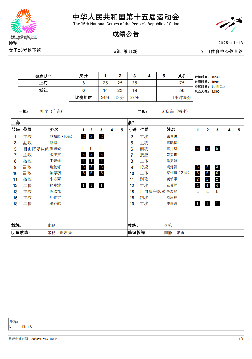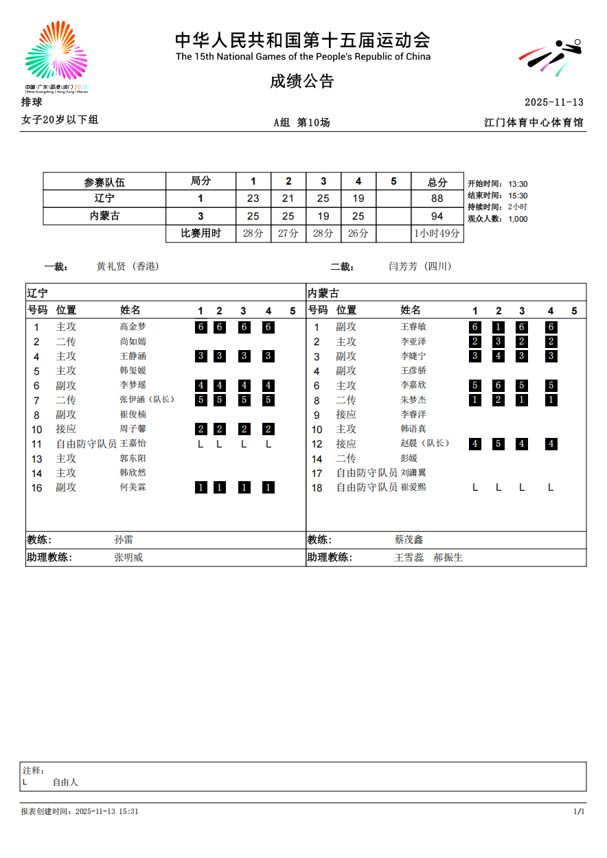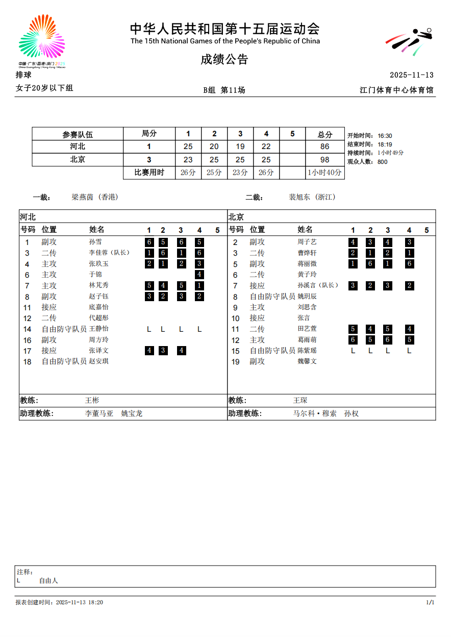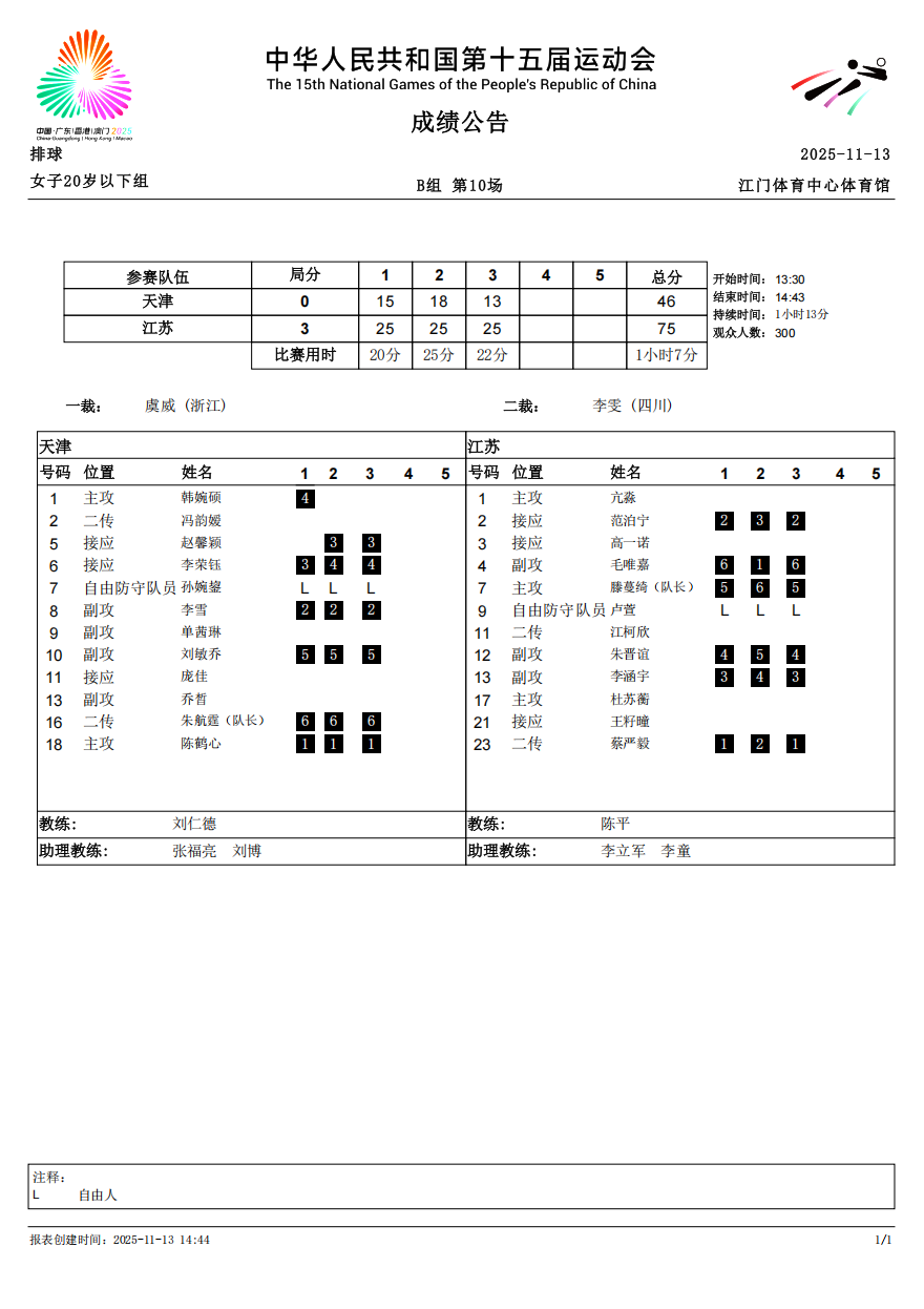第十五届全国运动会排球项目(女子20岁以下组)比赛5号公告