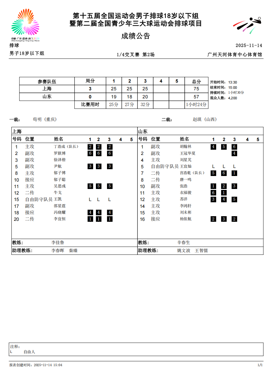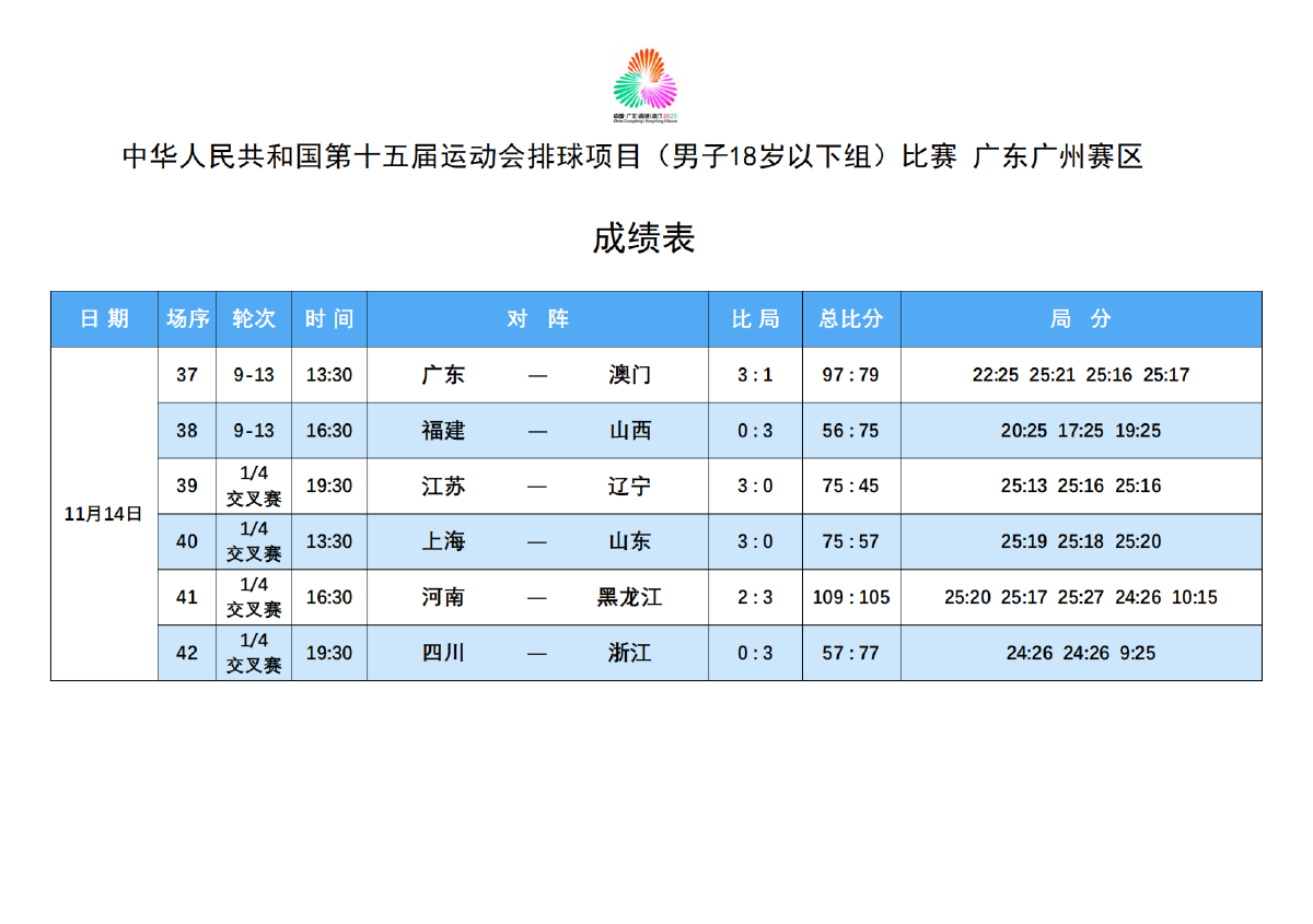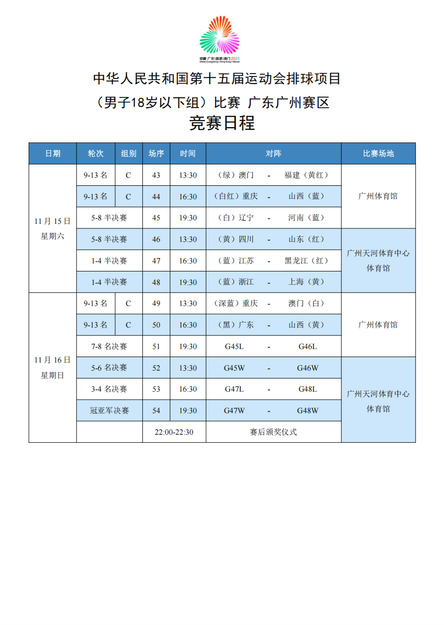 第十五届全国运动会排球项目(男子18岁以下组)比赛9号公告