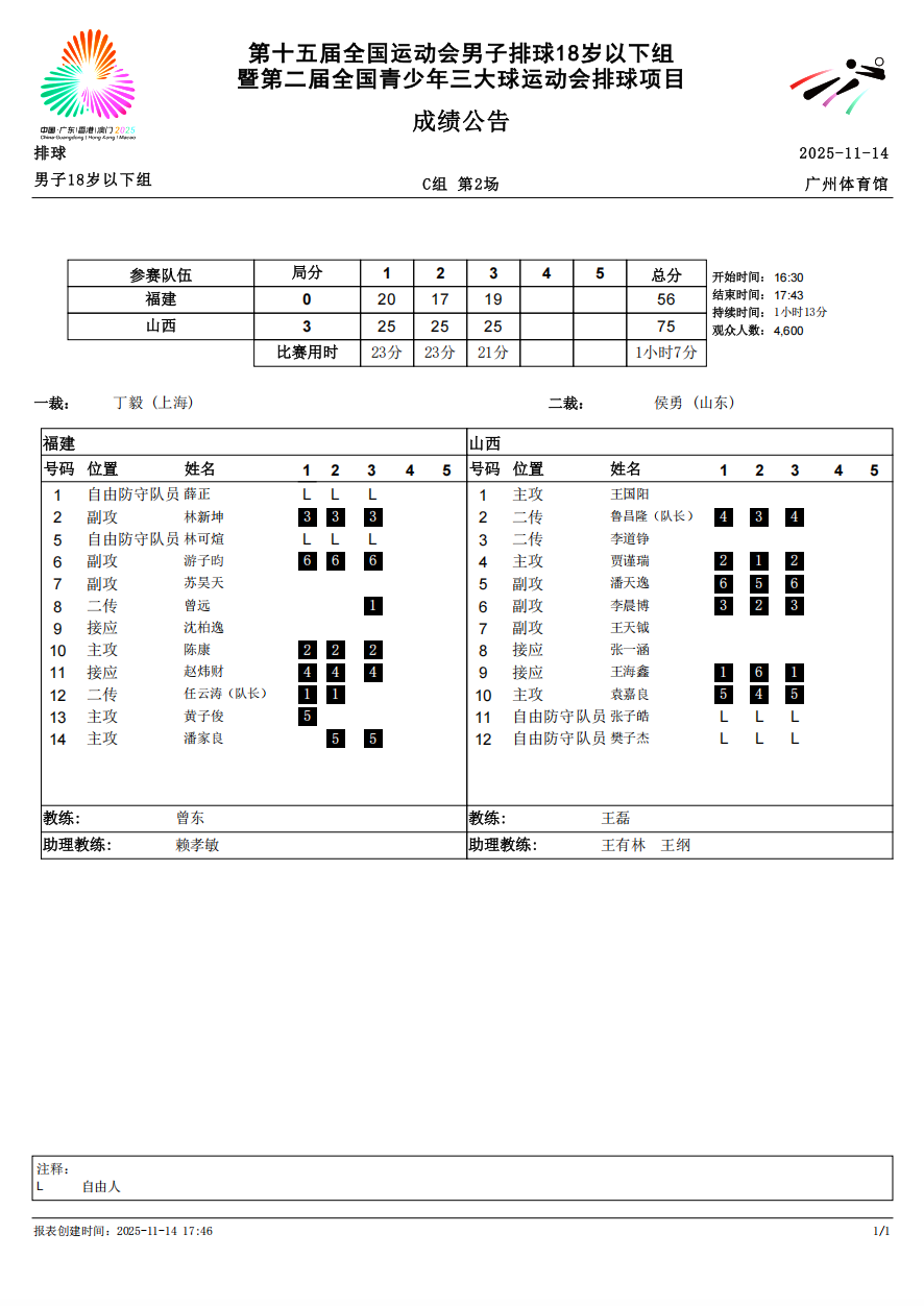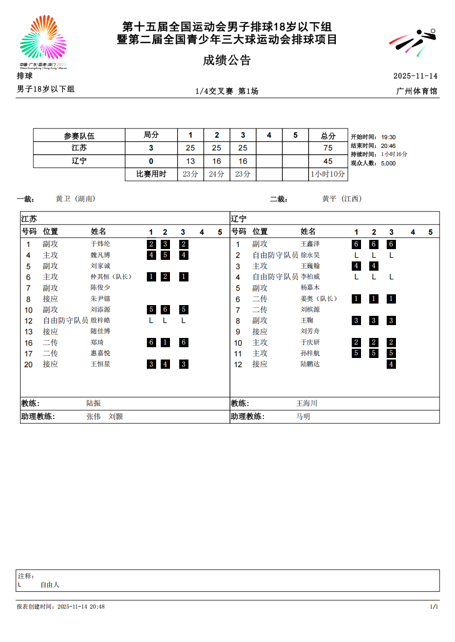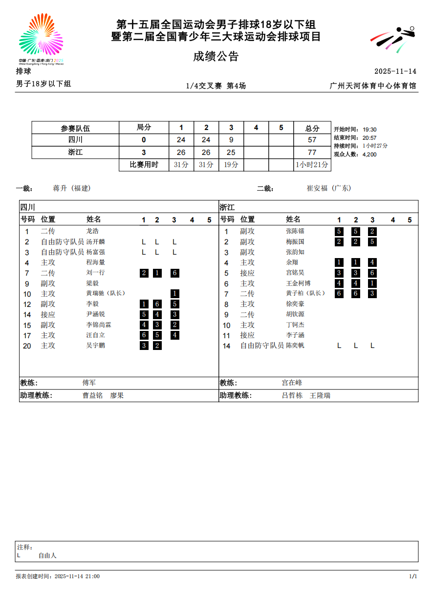 第十五届全国运动会排球项目(男子18岁以下组)比赛9号公告