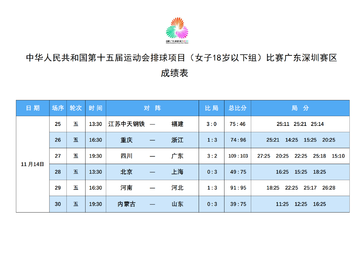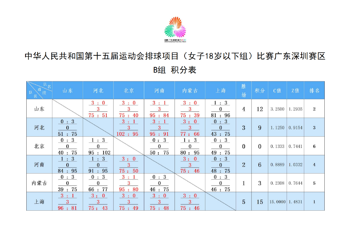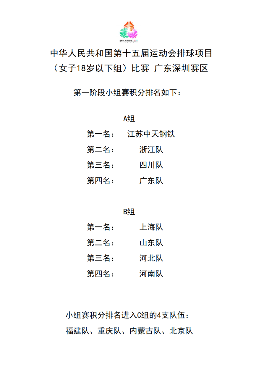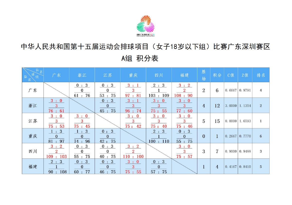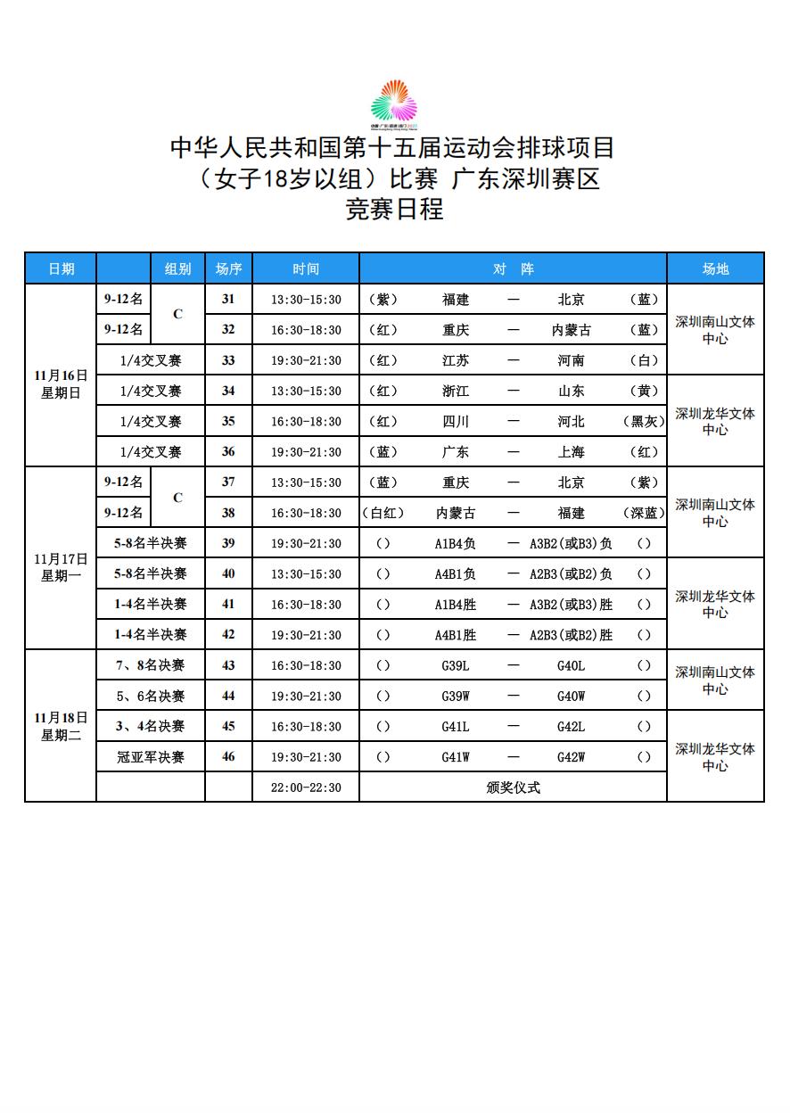第十五届全国运动会排球项目(女子18岁以下组)比赛6号公告