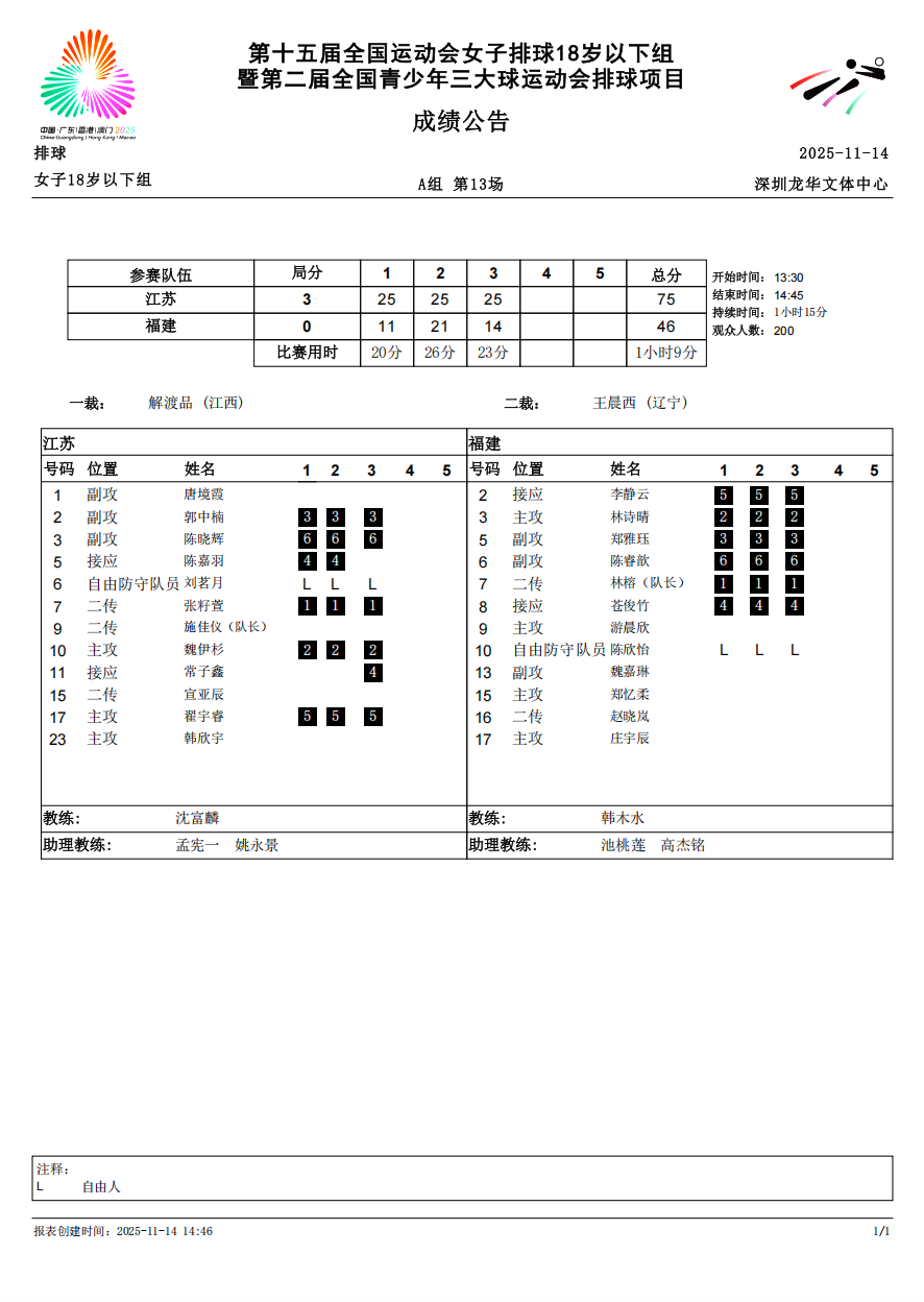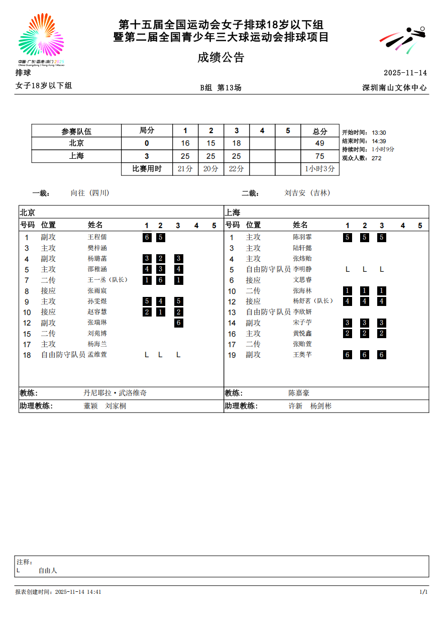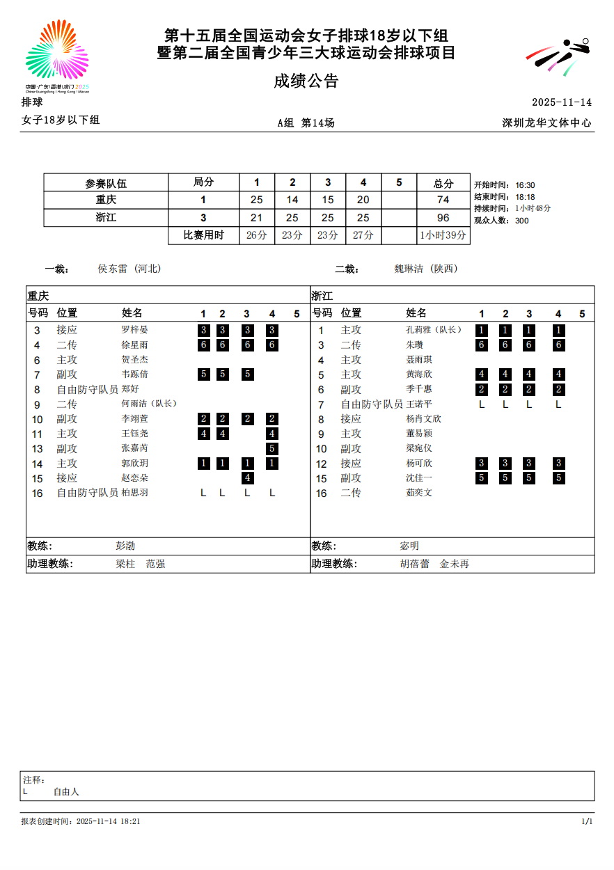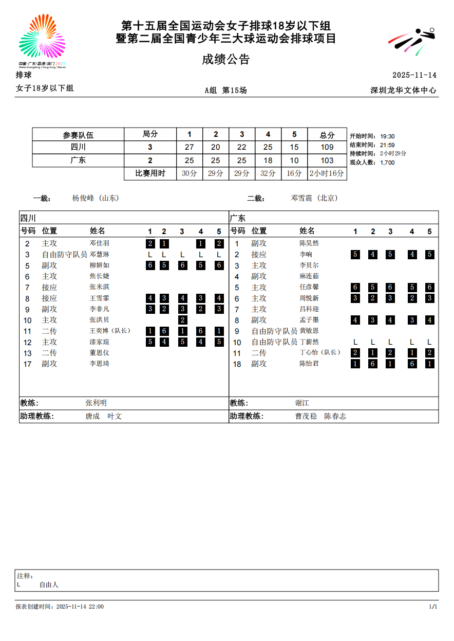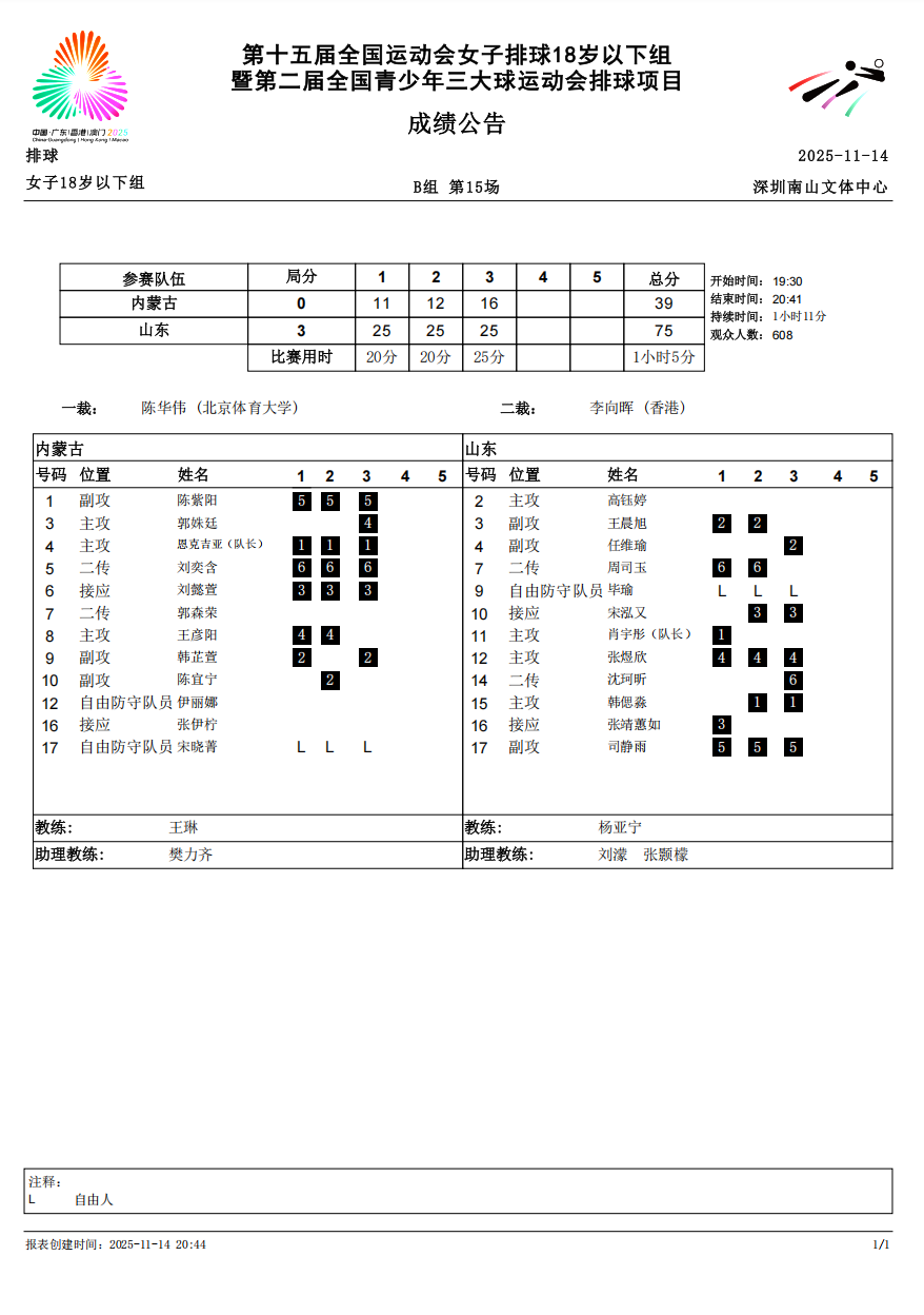 第十五届全国运动会排球项目(女子18岁以下组)比赛6号公告