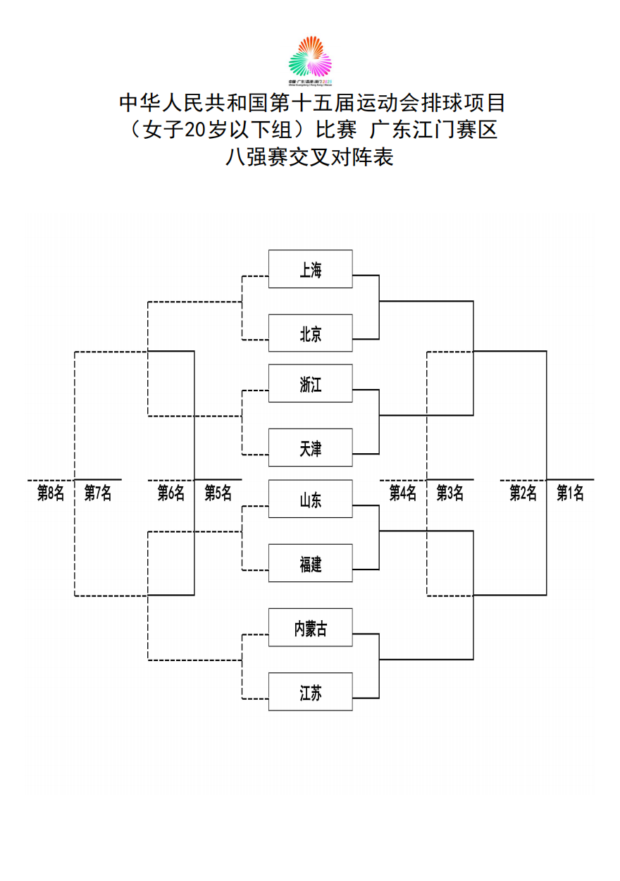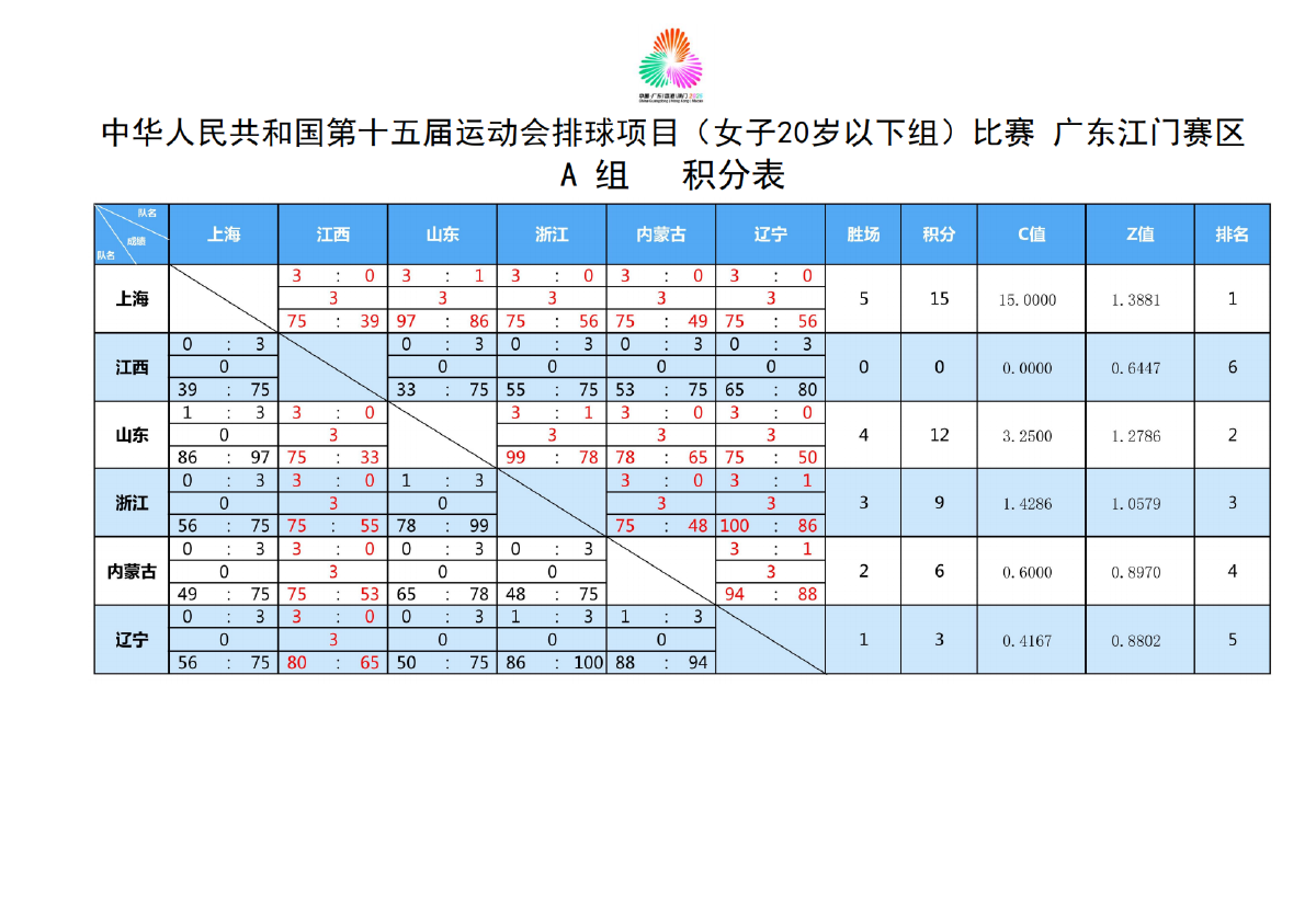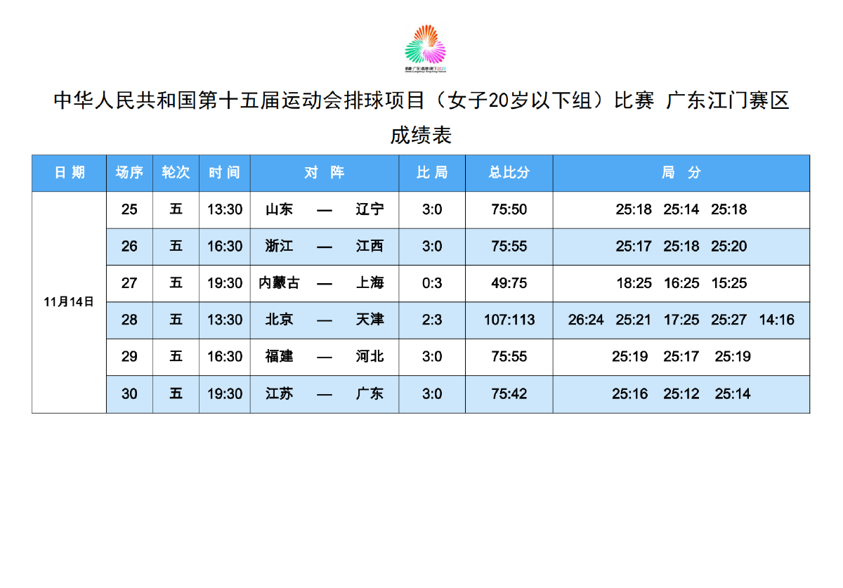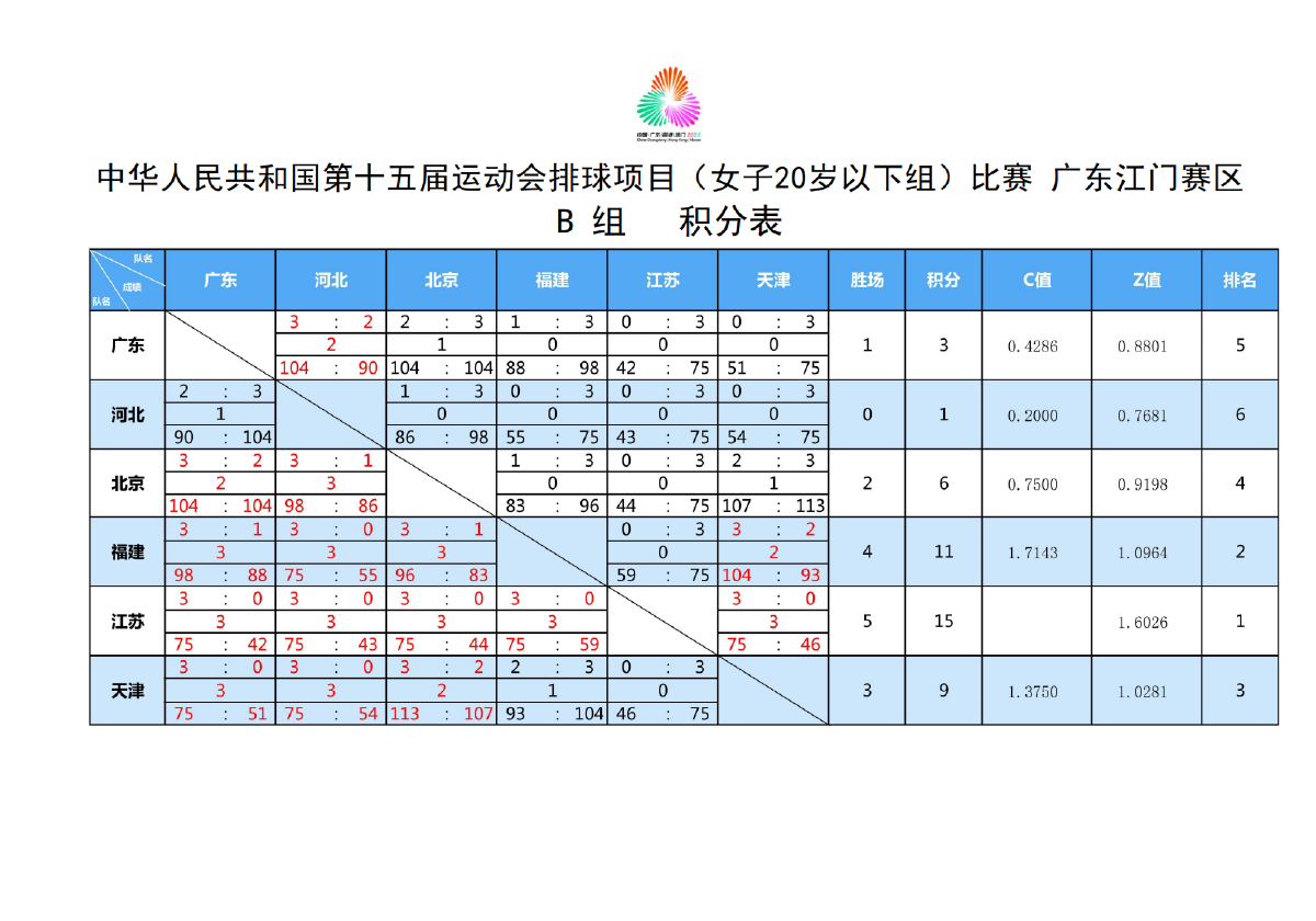 第十五届全国运动会排球项目(女子20岁以下组)比赛6号公告