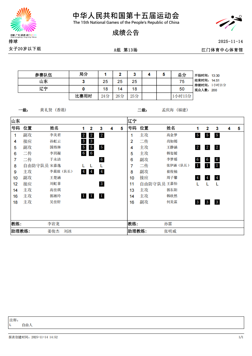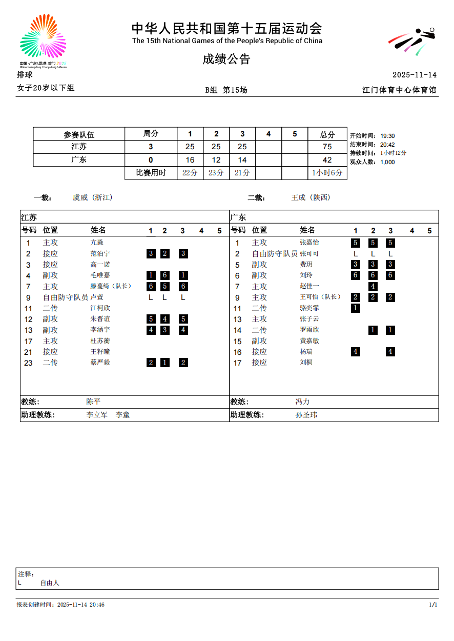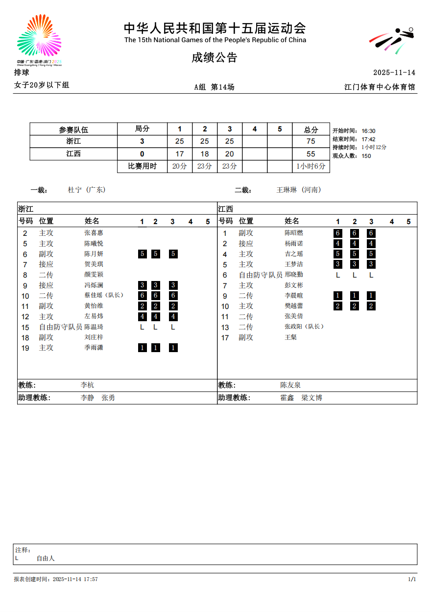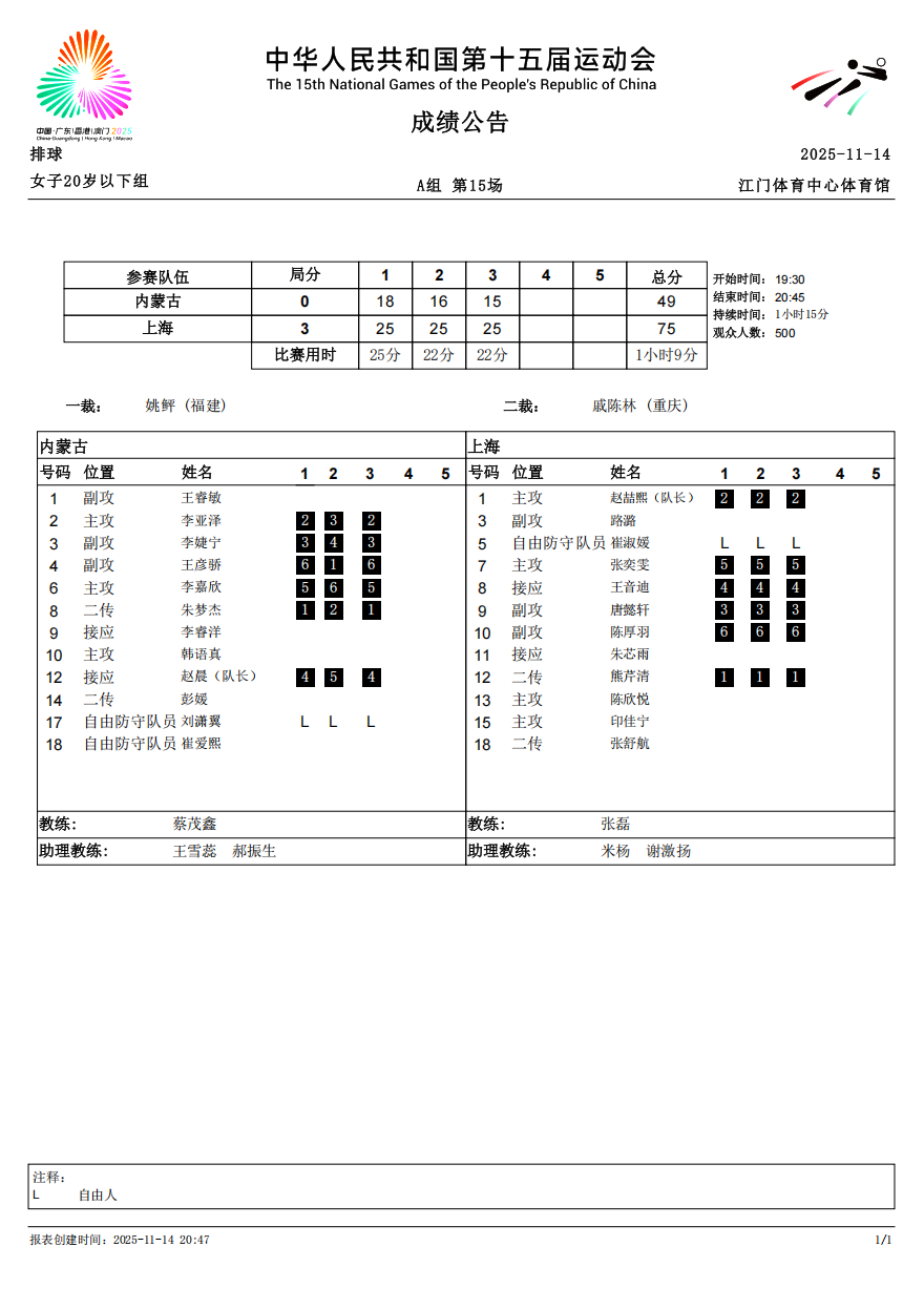第十五届全国运动会排球项目(女子20岁以下组)比赛6号公告
