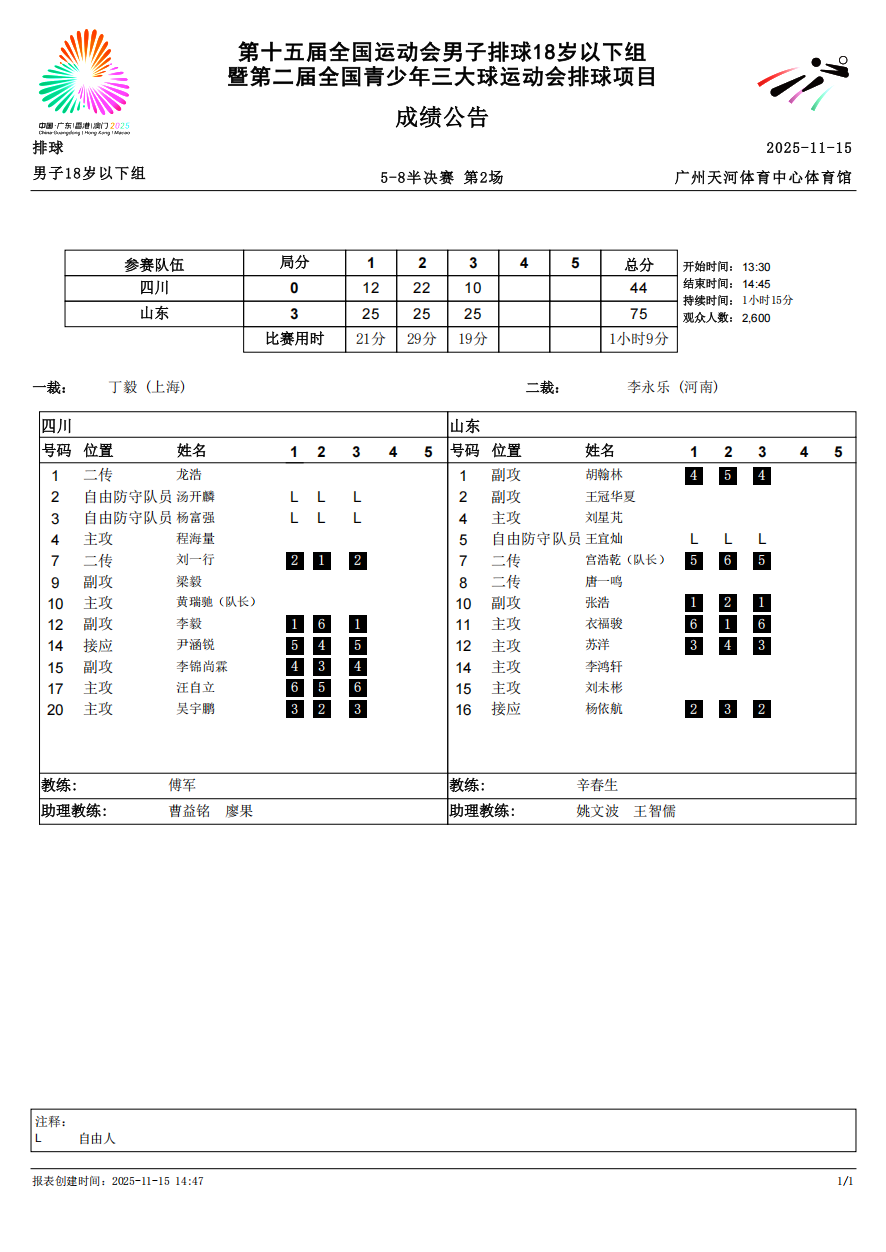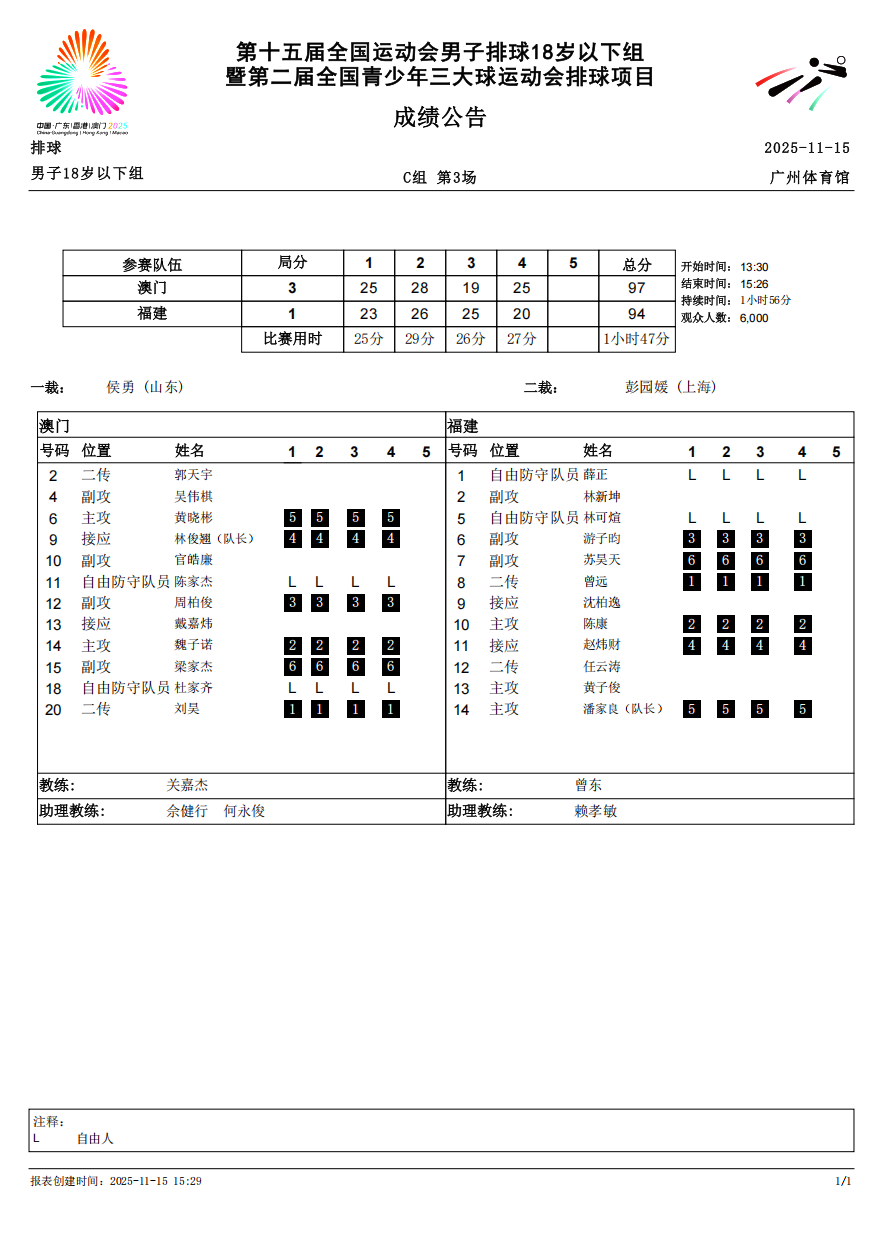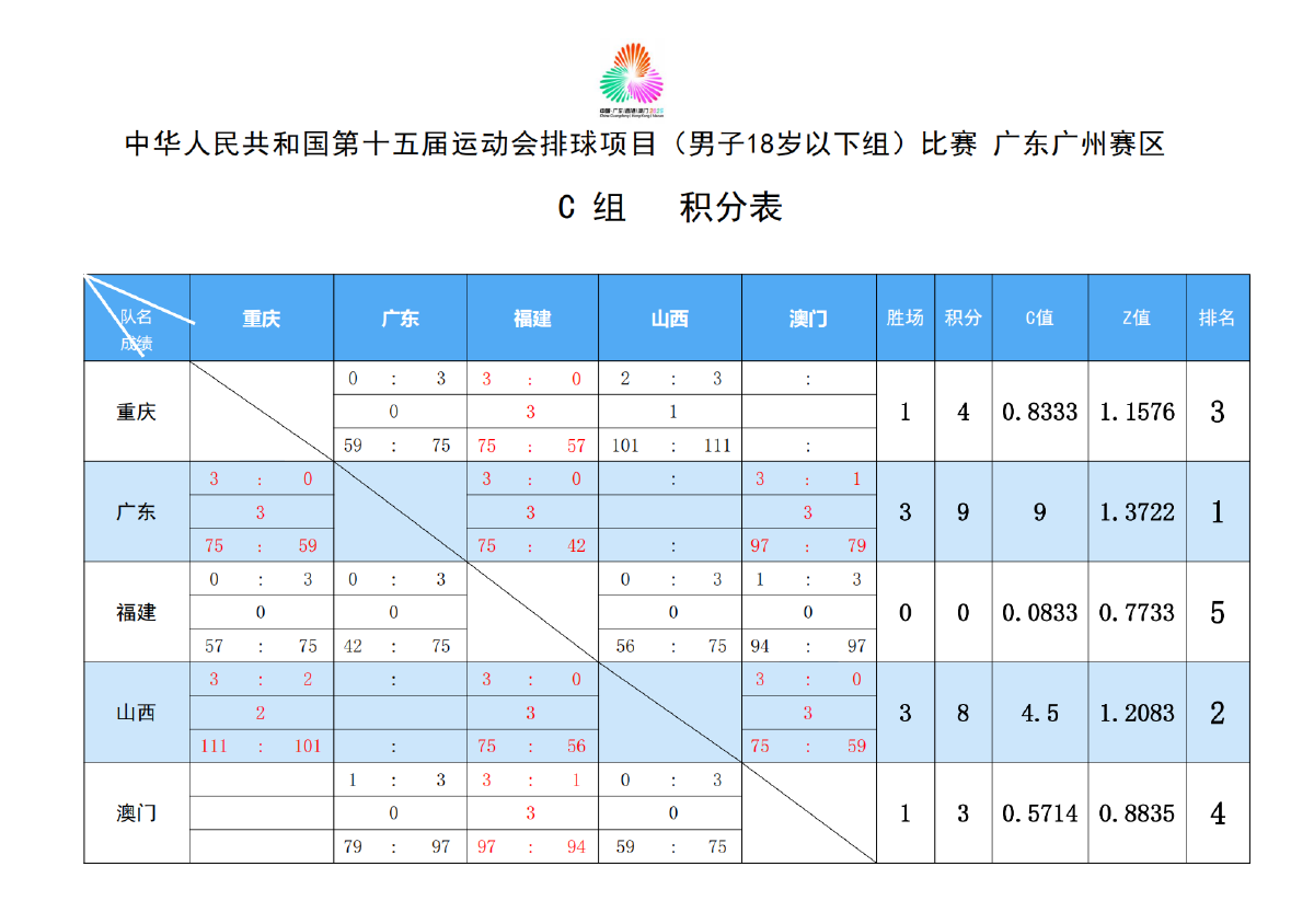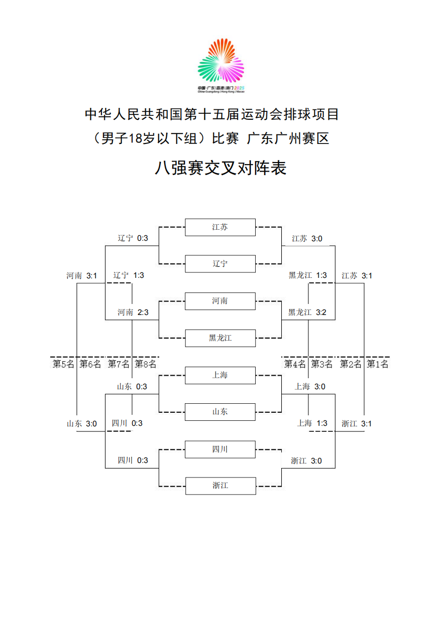 第十五届全国运动会排球项目(男子18岁以下组)比赛10号公告