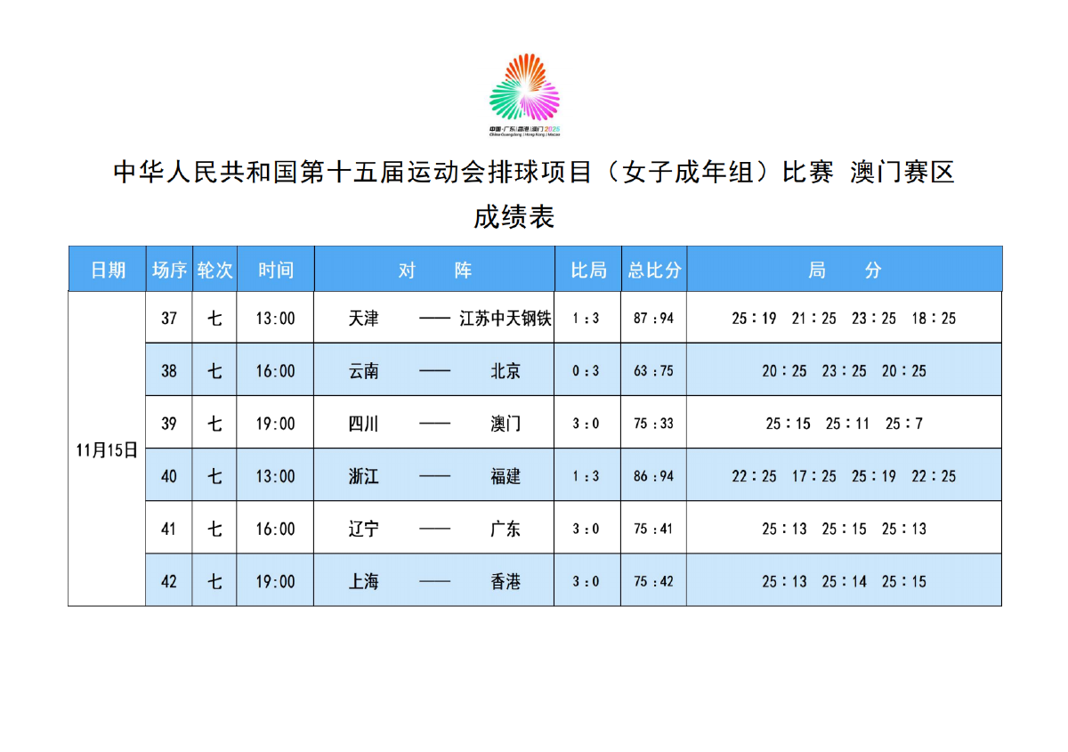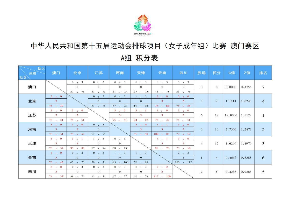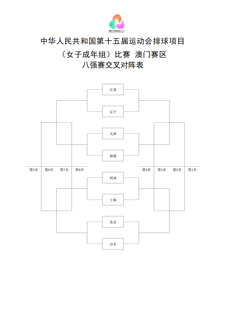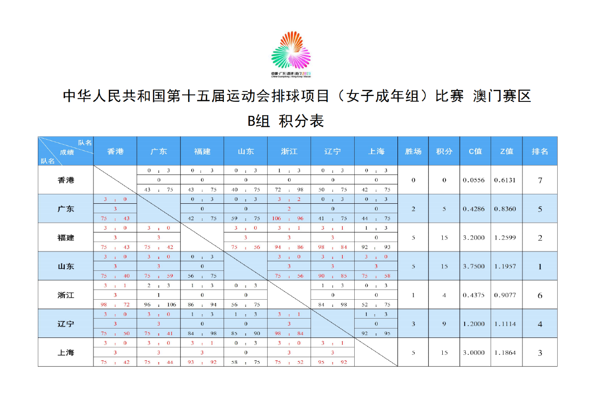 第十五届全国运动会排球项目(女子成年组)比赛8号公告