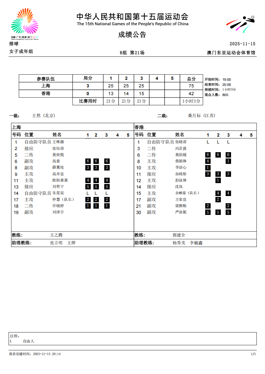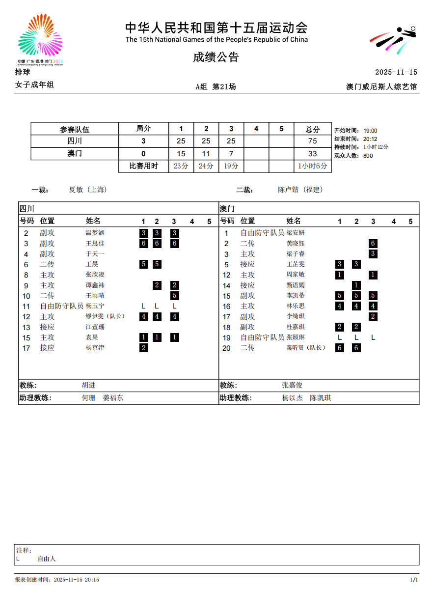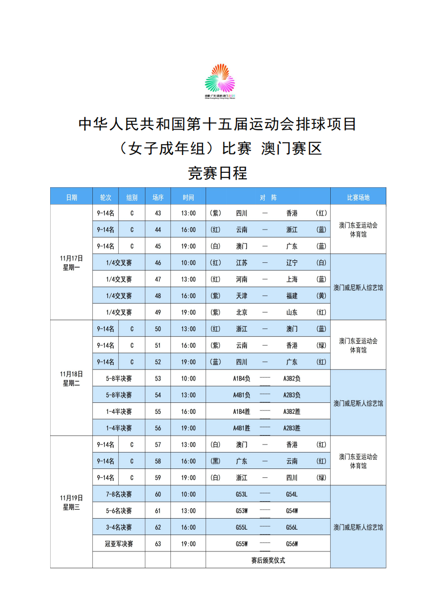 第十五届全国运动会排球项目(女子成年组)比赛8号公告