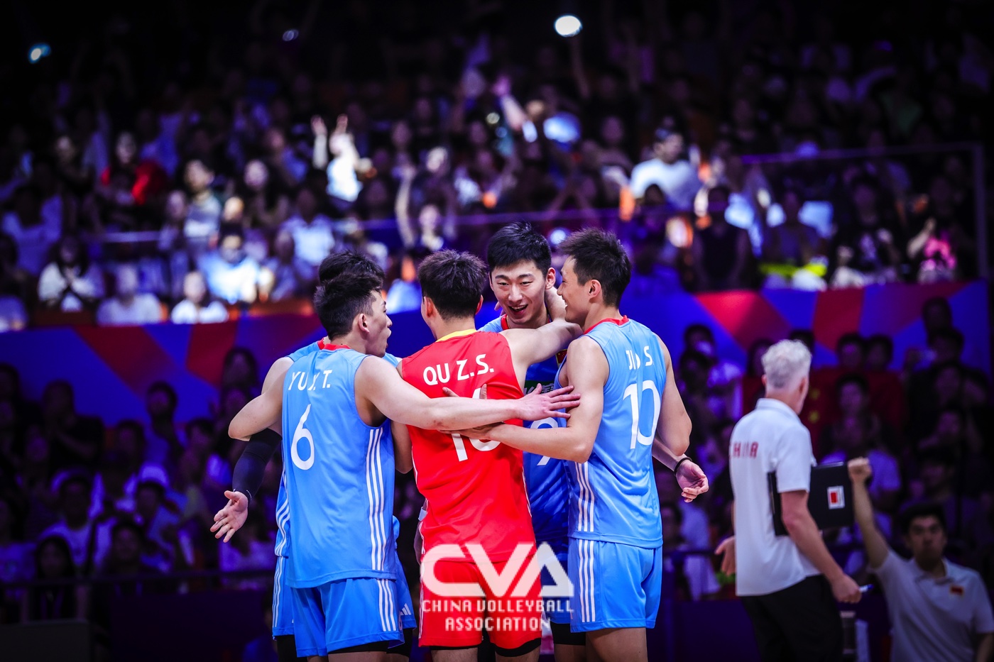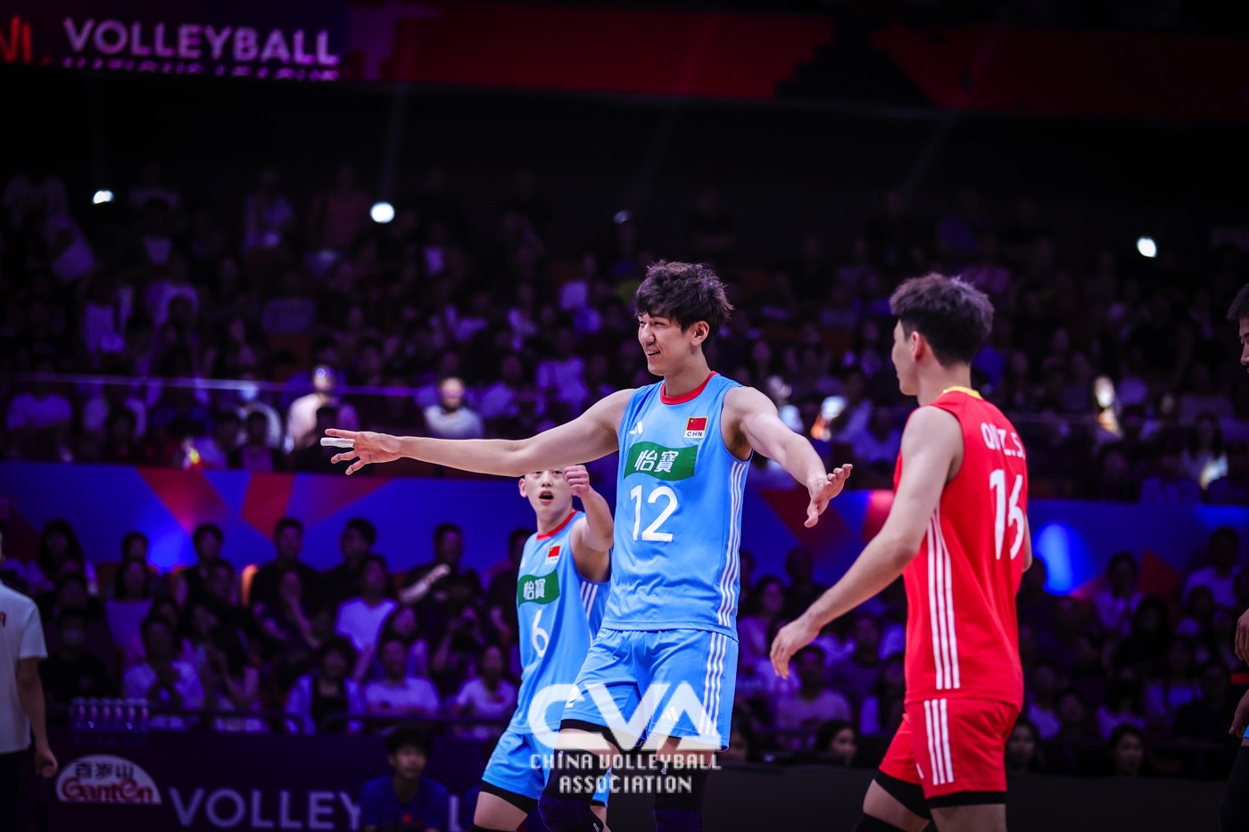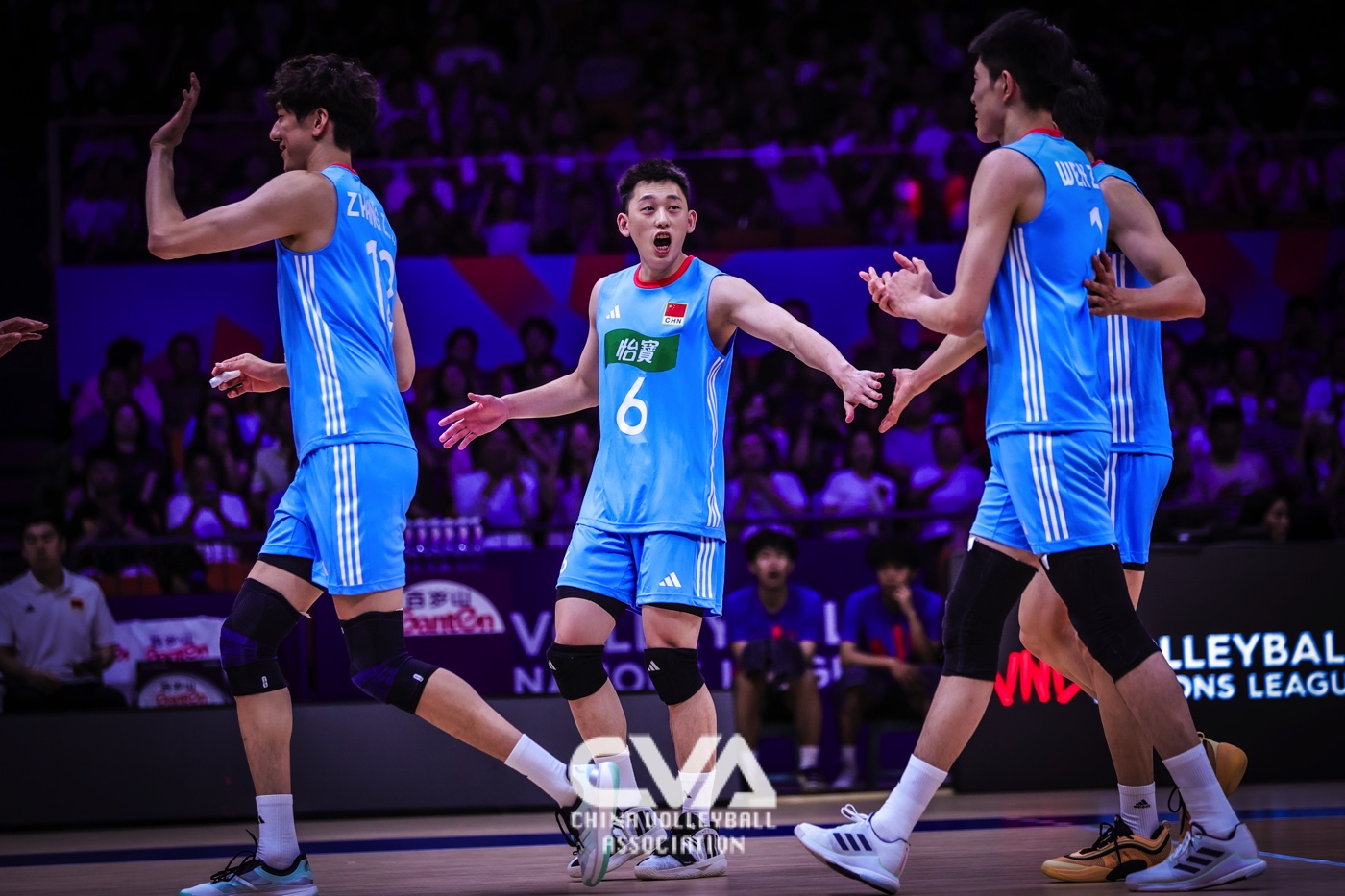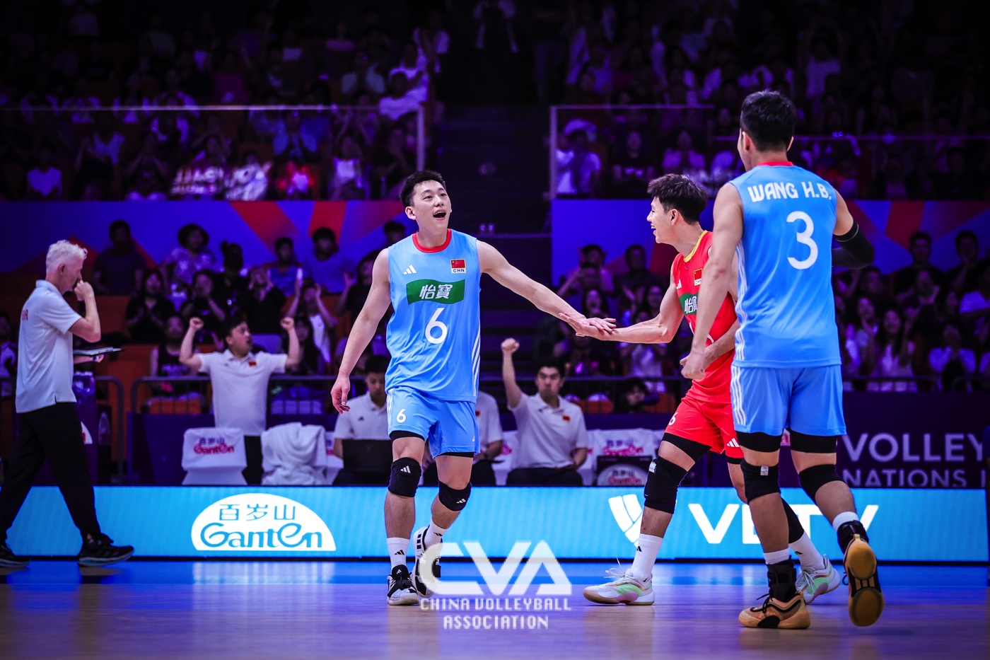 6月14日下午,2025年世界男排联赛中国西安站在曲江竞技中心展开第四日的争夺。面对世界排名第十四的荷兰男排,东道主中国男排3比1力克对手,四局比分为25比19、25比20、13比25、25比17。(摄影:朱琳)