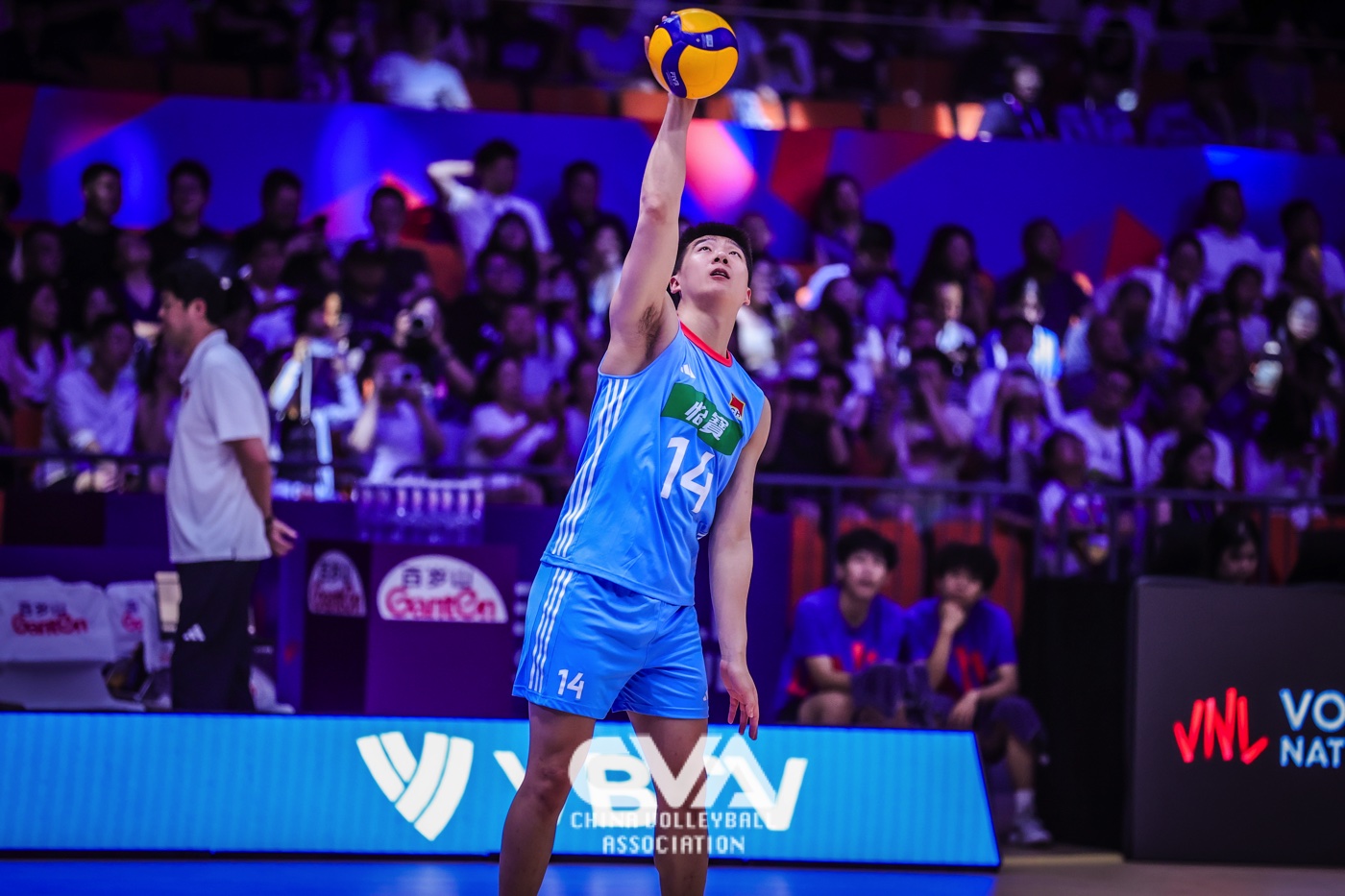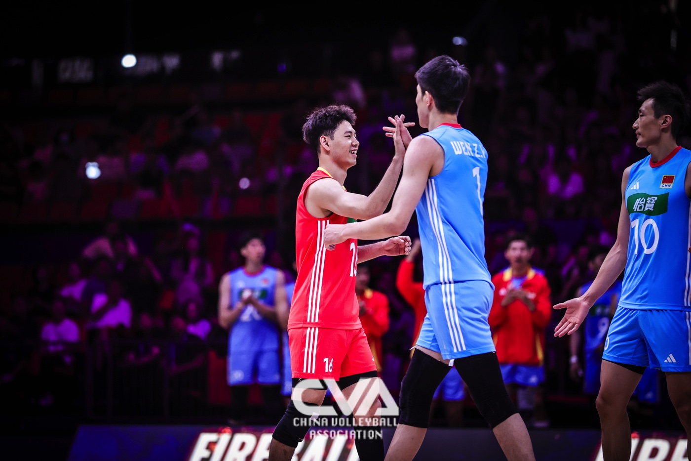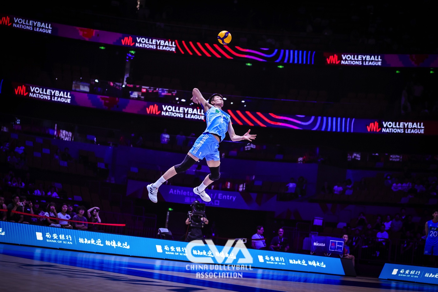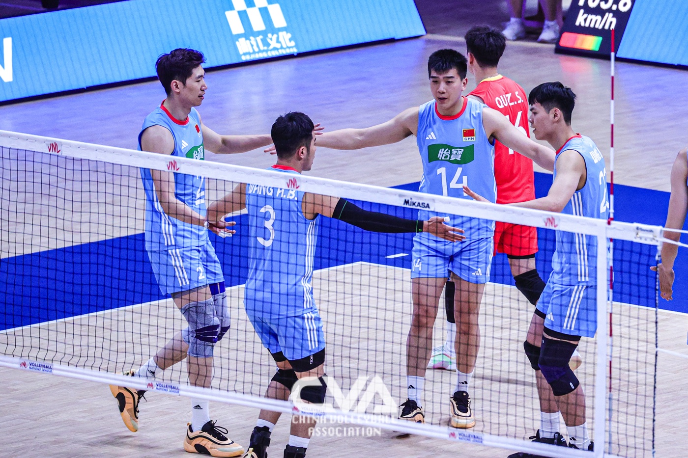 6月14日下午,2025年世界男排联赛中国西安站在曲江竞技中心展开第四日的争夺。面对世界排名第十四的荷兰男排,东道主中国男排3比1力克对手,四局比分为25比19、25比20、13比25、25比17。(摄影:朱琳)