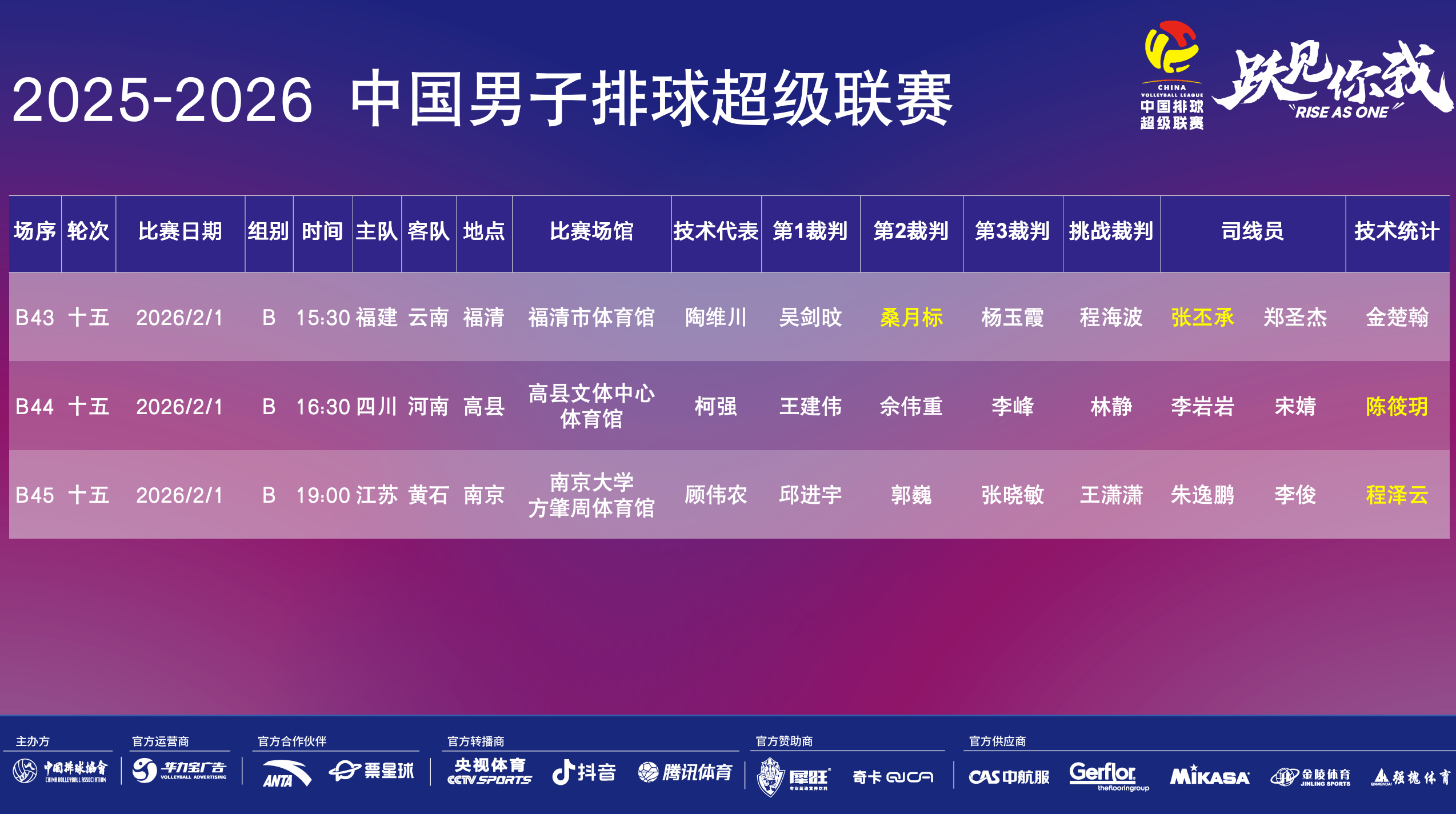 2025-2026中国男子排球超级联赛B级第15轮竞赛安排