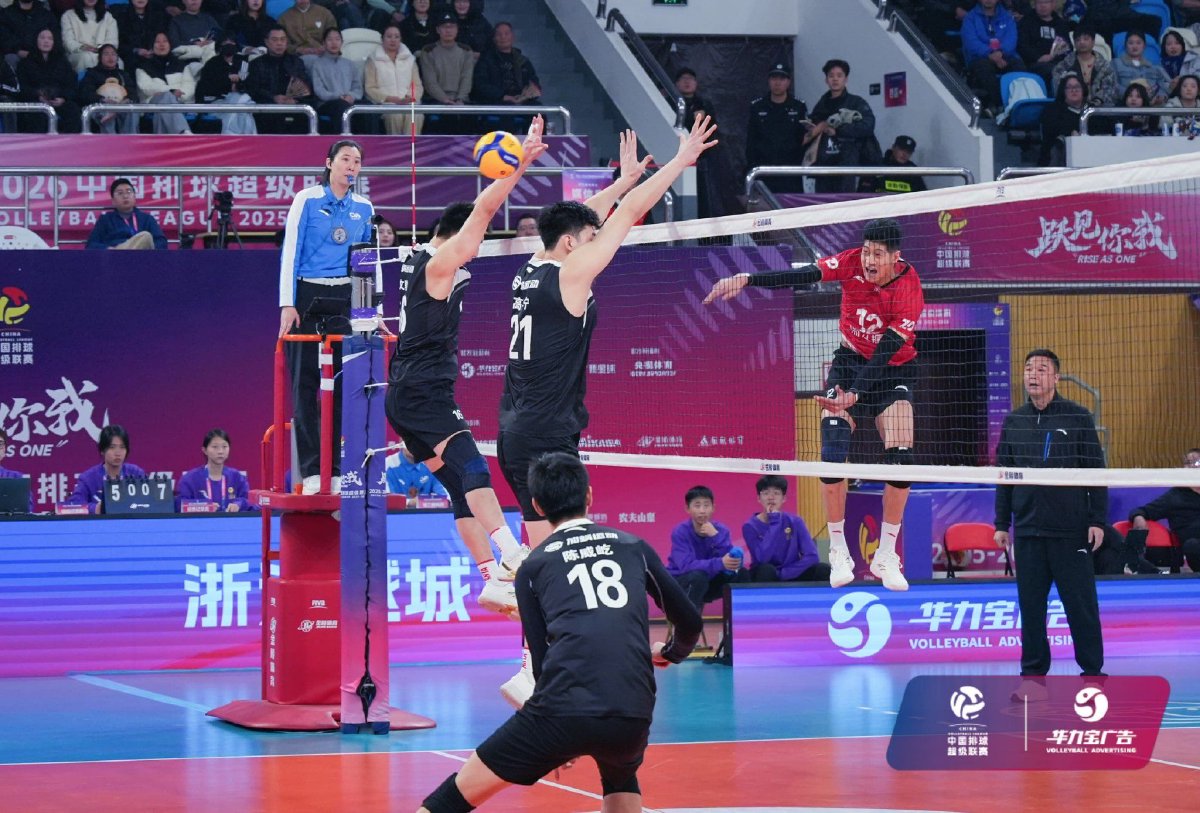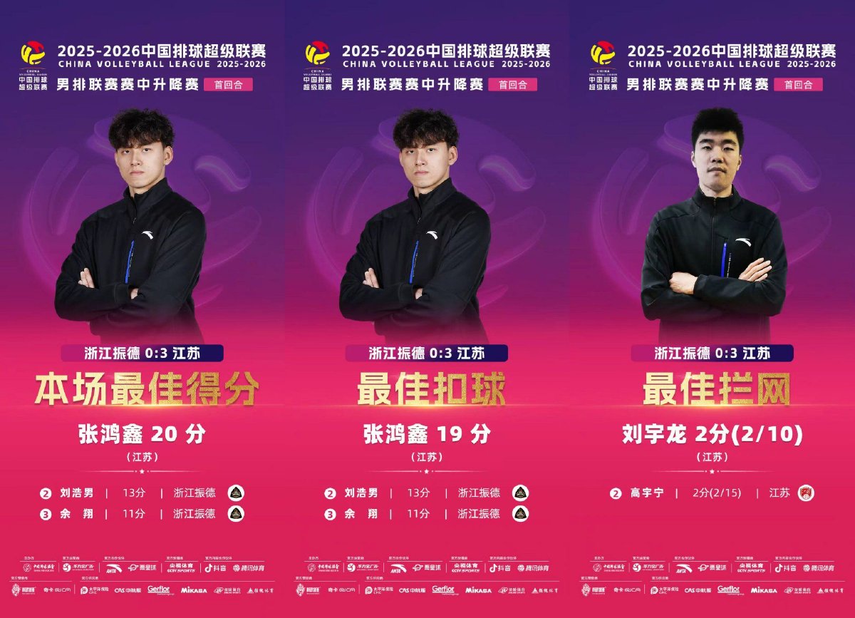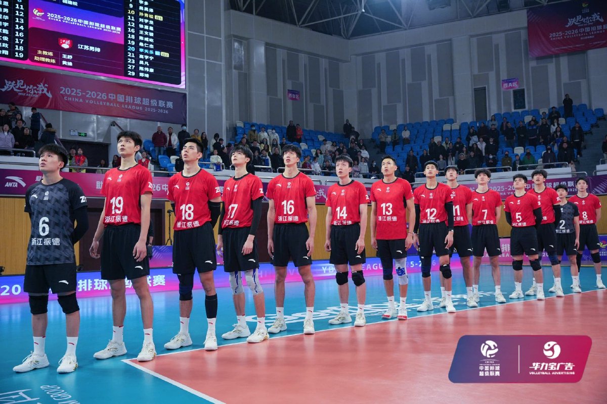 2026年2月5日晚,2025-2026中国男子排球超级联赛赛中升降赛第一回合浙江振德男排与江苏男排的比赛在浙江省绍兴市越城区体育中心体育馆结束。经过三局较量,浙江振德男排主场0比3负于江苏男排,比分为25比27、21比25、21比25。