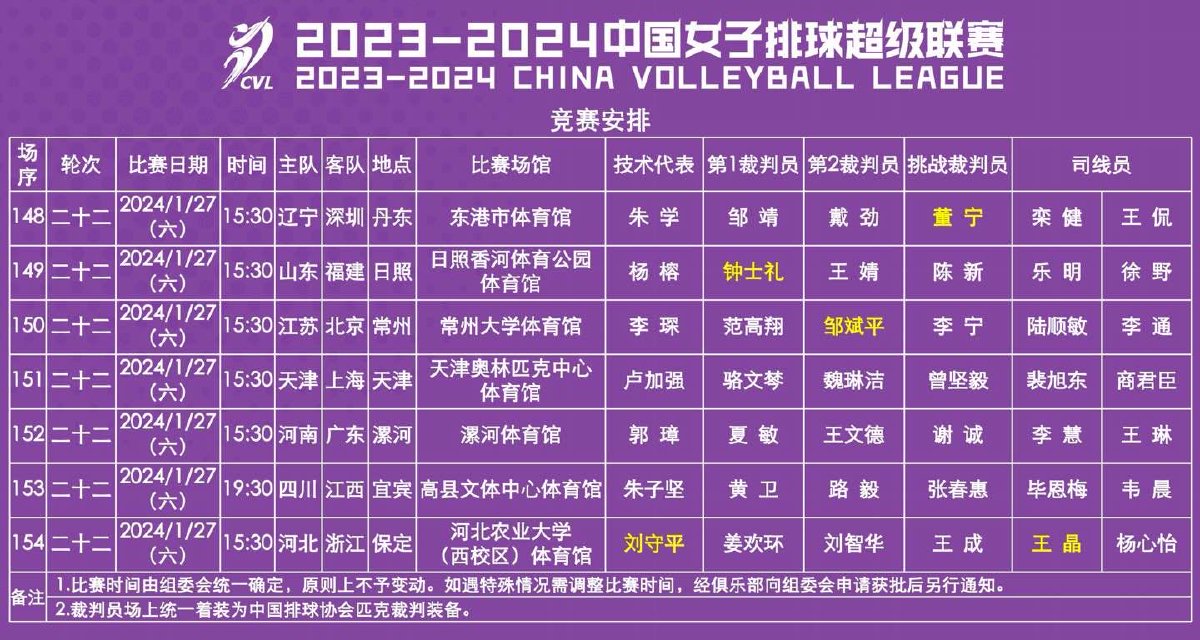 2023-2024中国女子排球超级联赛第二十二轮竞赛安排