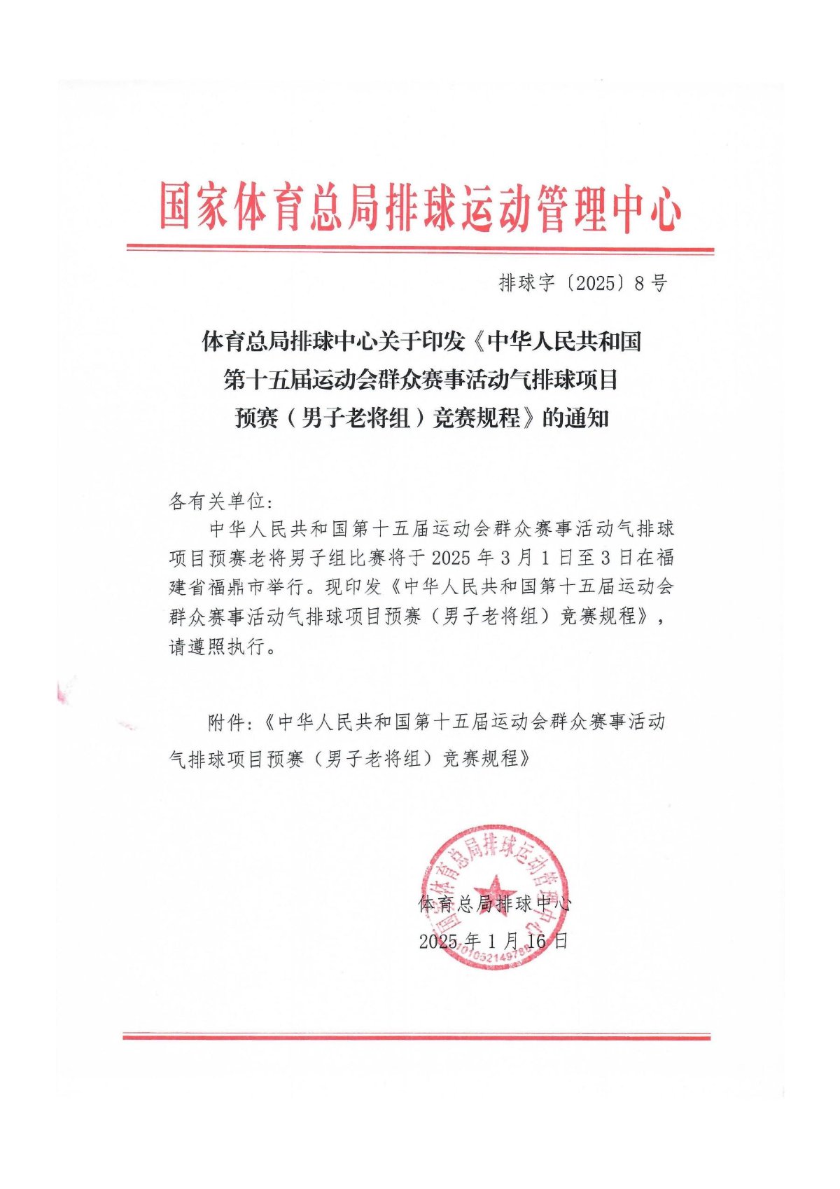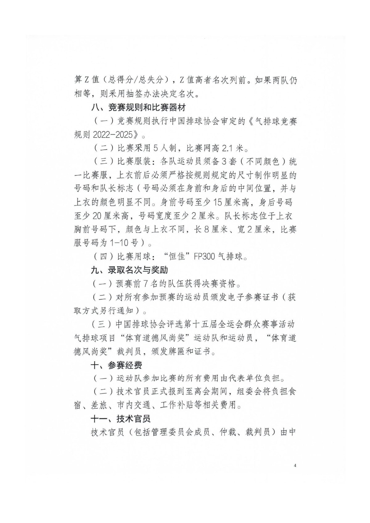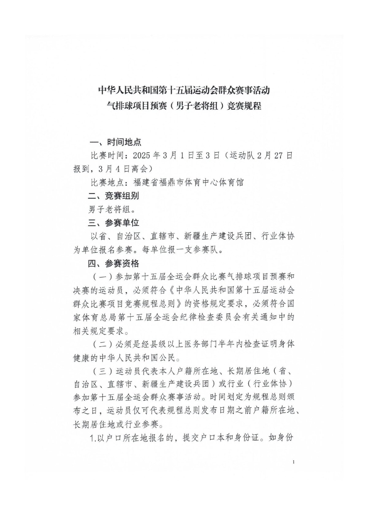 关于印发《第十五届全运会气排球预赛(男子老将组)竞赛规程》的通知