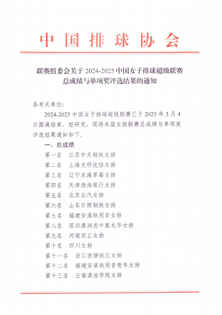 关于2024-2025中国女子排球超级联赛总成绩与单项奖评选结果的通知