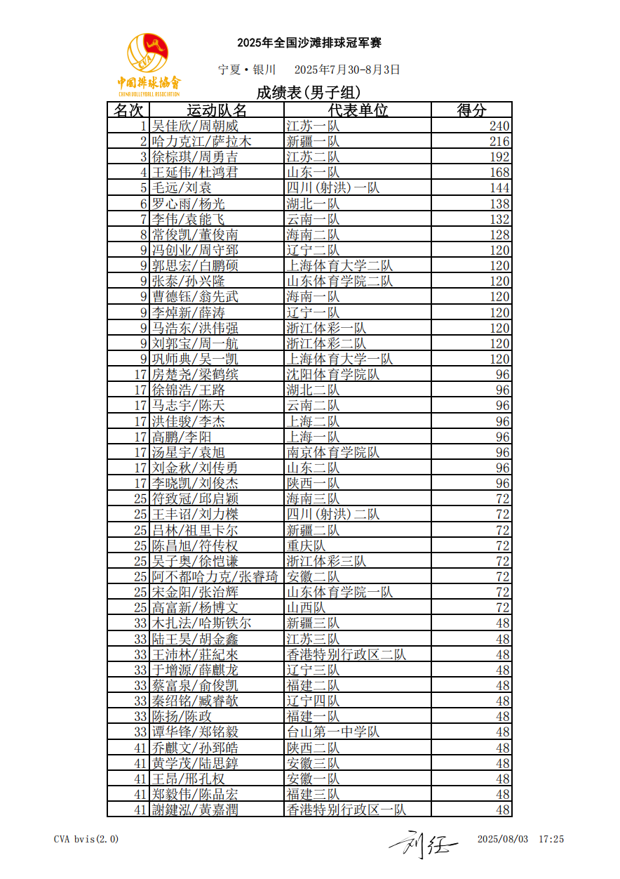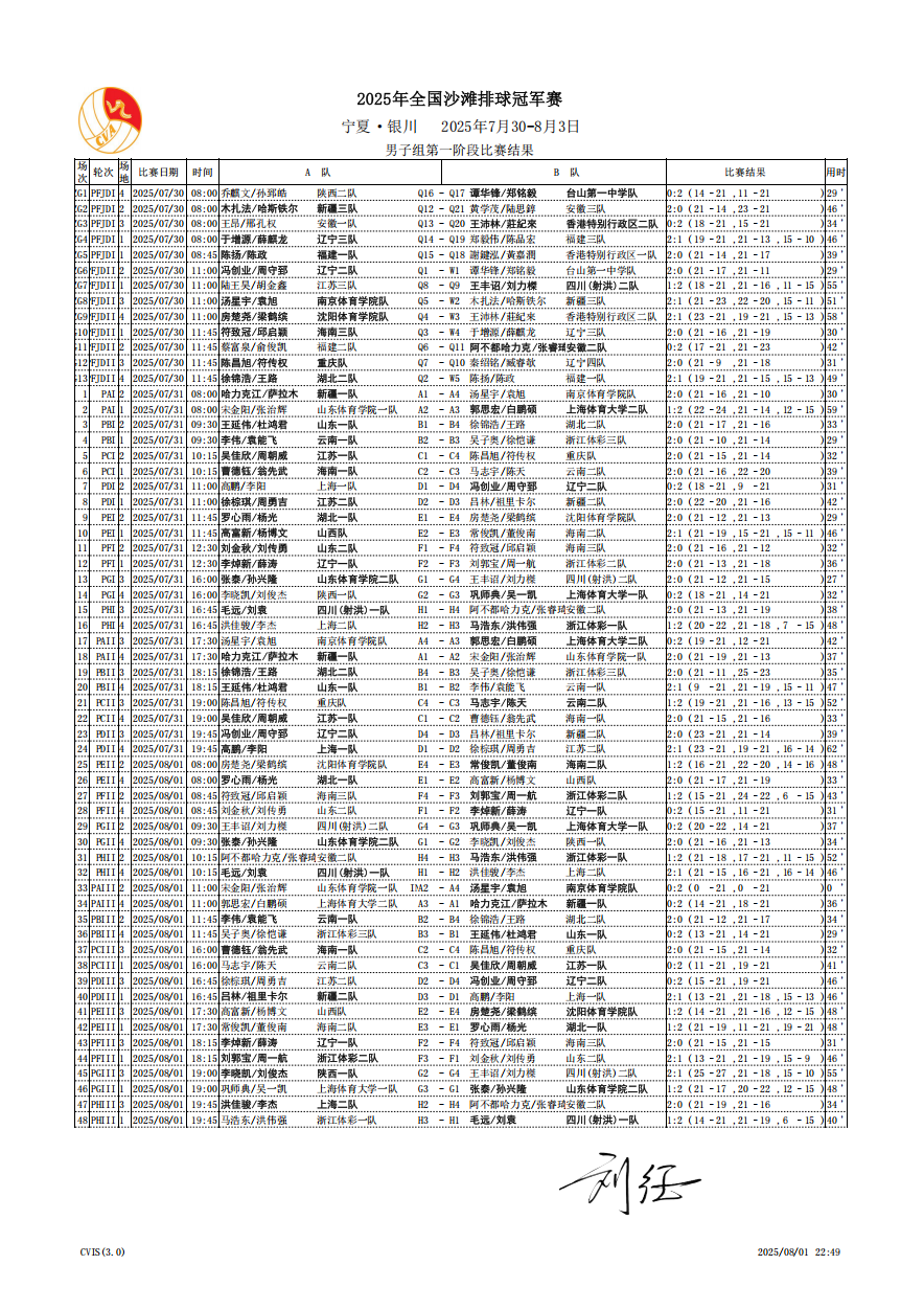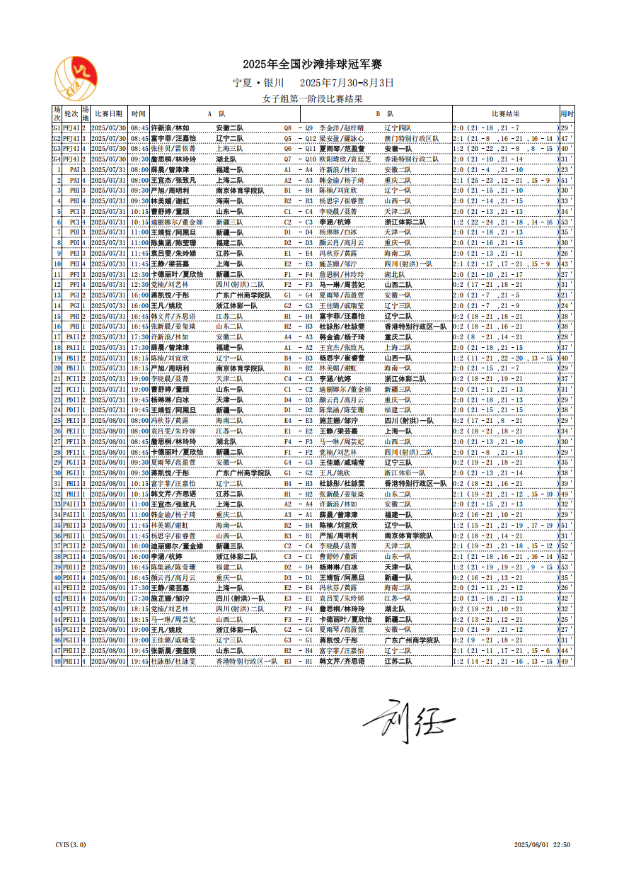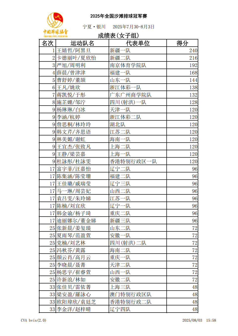 2025年全国沙滩排球冠军赛宁夏银川站暨十五运会资格赛成绩