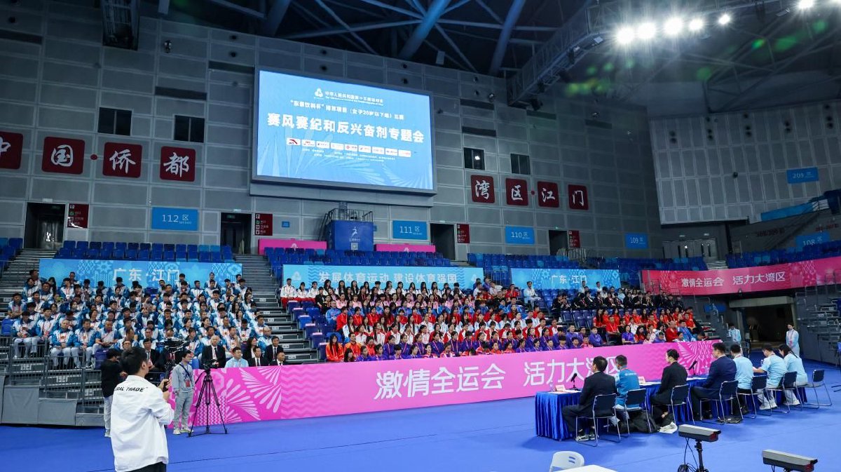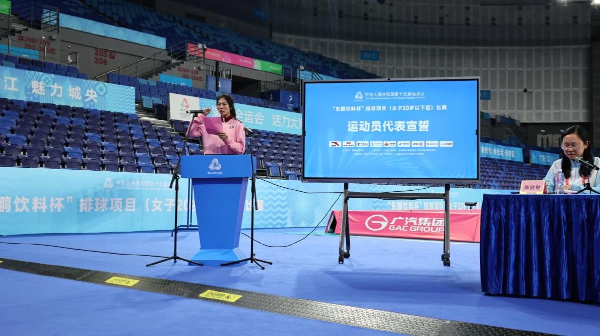 11月9日,江门赛区相继召开了赛风赛纪和反兴奋剂专题会、技术会议。会议传达了体育总局办公厅关于进一步加强第十五届全国运动会赛风赛纪工作的通知、第十五届全国运动会赛风赛纪违规处理规定,参赛队代表、技术官员代表、教练员代表、竞委会工作人员代表进行宣誓并递交了赛风赛纪和反兴奋剂承诺书。国家体育总局排球运动管理中心副主任盖洋代表排球中心对全体参赛人员提出要求,要深刻领会赛事的重要意义,切实提高政治站位;在赛场管控、资格审核、裁判执裁、反兴奋剂等核心环节严格把关;同时要传承和弘扬新时代女排精神,充分展现排球人的优良风貌,以尊重观众、尊重裁判、尊重对手的态度,彰显排球运动员与教练员的良好职业素养。