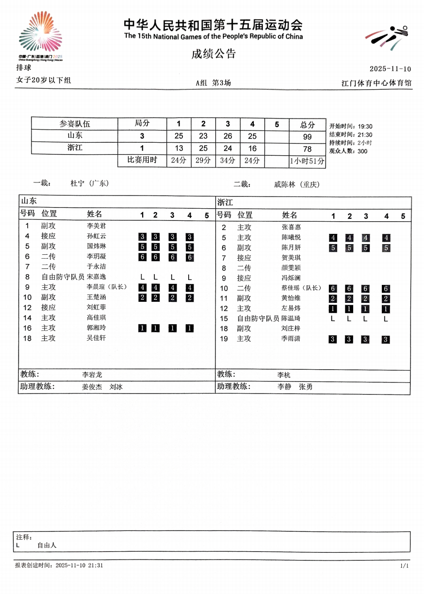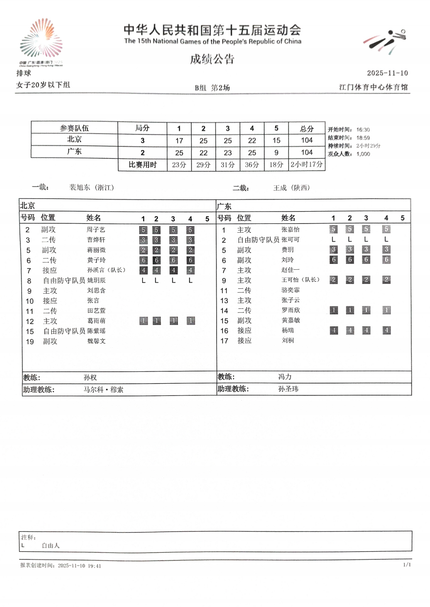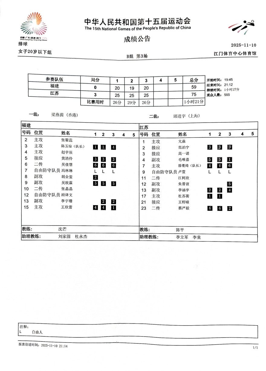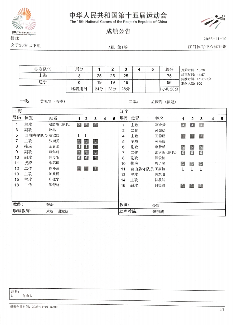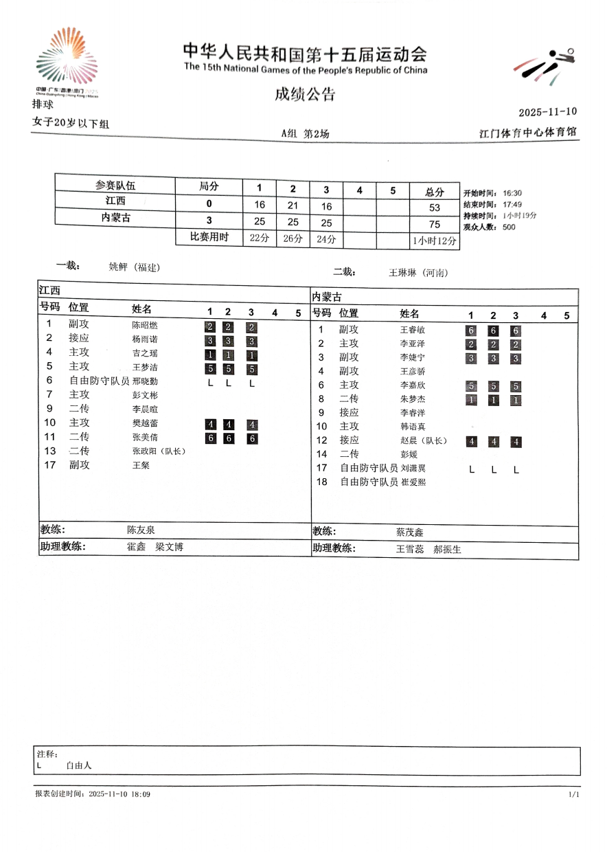 第十五届全国运动会排球项目(女子20岁以下组)比赛2号公告