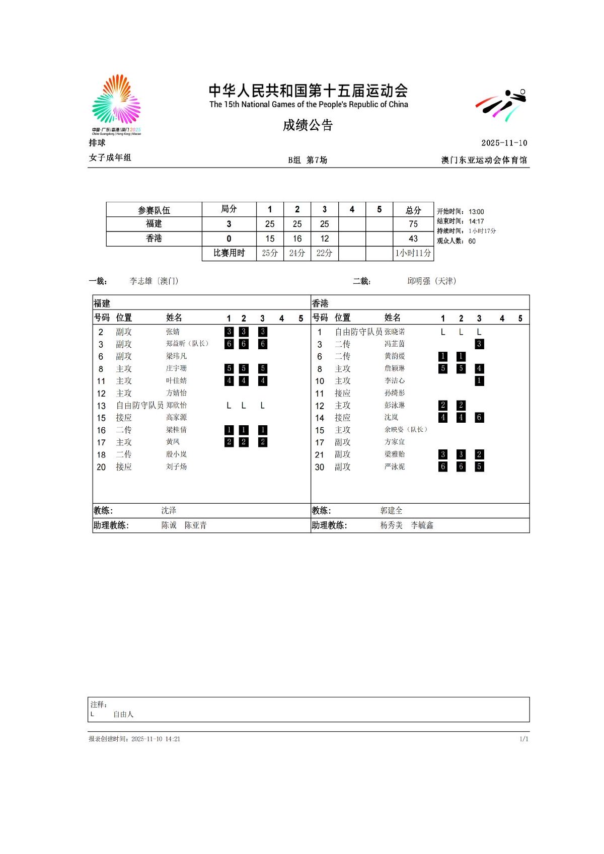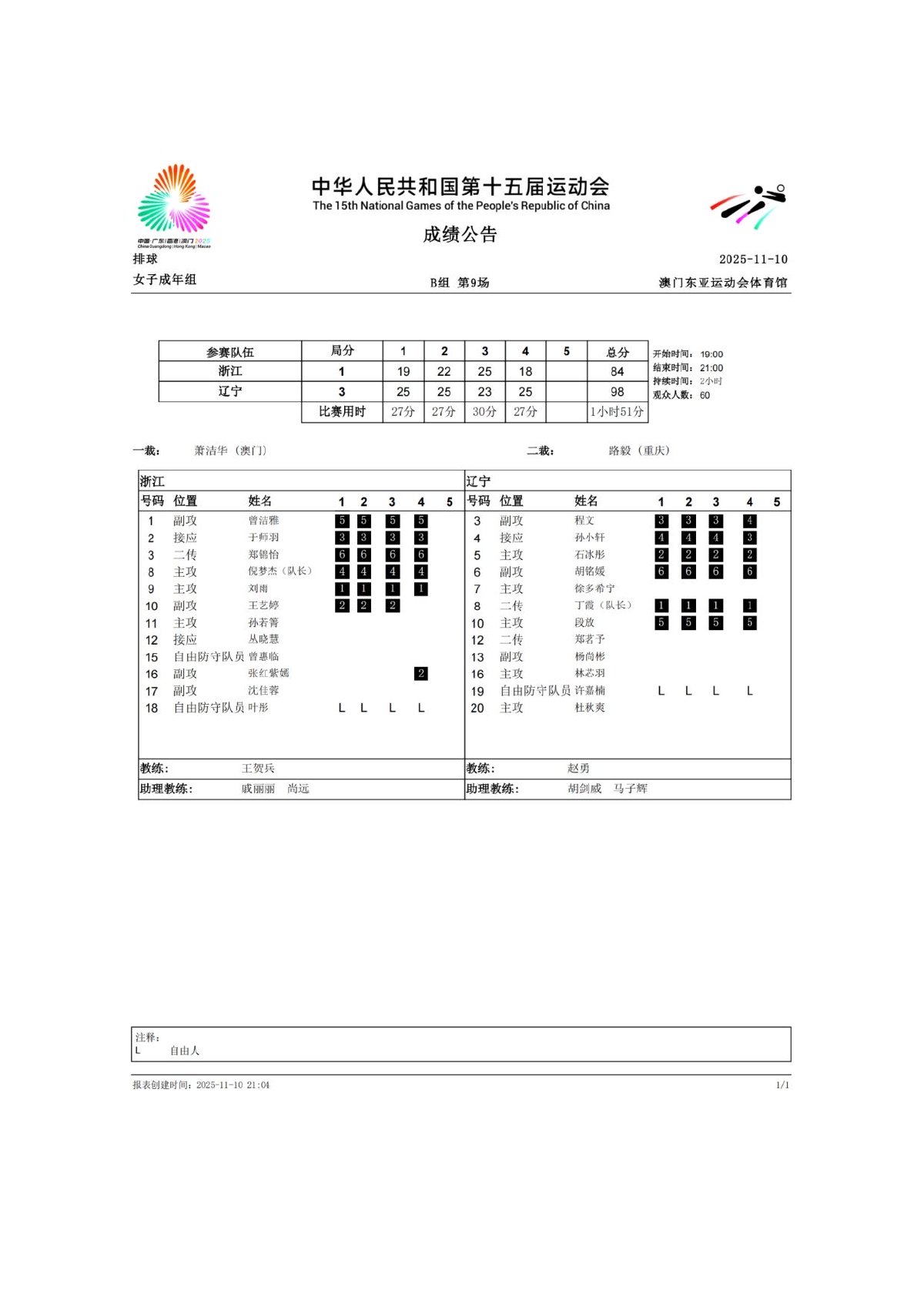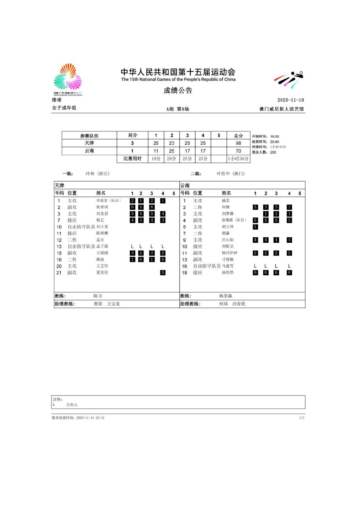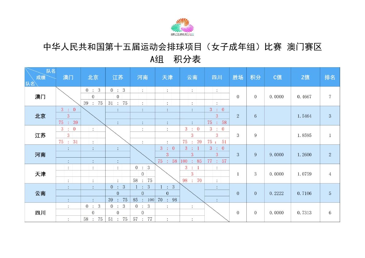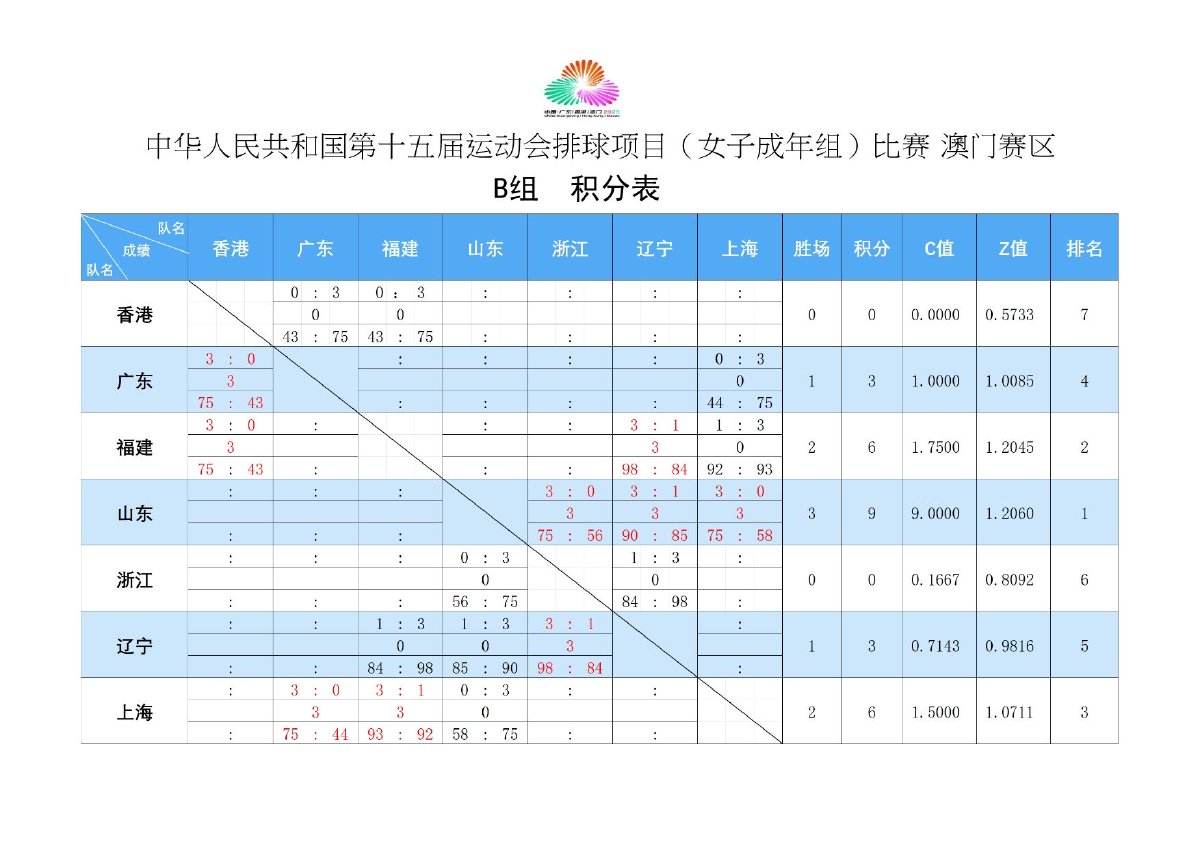 第十五届全国运动会排球项目(女子成年组)比赛4号公告